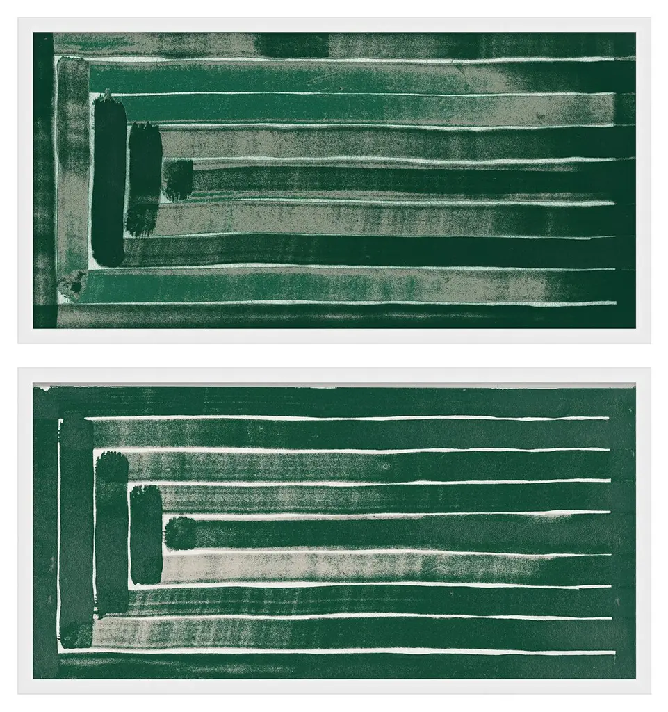 Designed by us and available only at One Kings Lane: A reproduction of an original work, this minimalist abstraction in emerald green is printed on matte paper and displayed under glass in a simple frame. Arrives ready to hang.