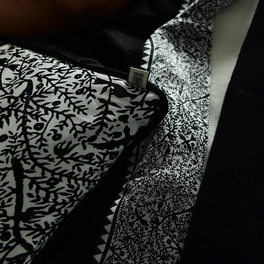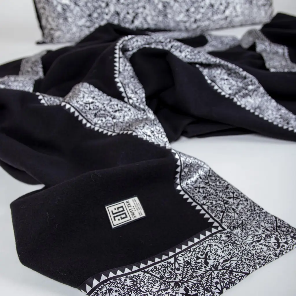 Can be used as a coverlet or blanket. Emilie: Recreating Weiner Werkstatte “Vienna Workshop” of the 1930s tribute to Emilie Floge, Gustav Klimt lifelong companion. Blankets as artful heirlooms. 18th century English mill carries Royal Warrant to Windsor Castle. Bespoke dye colors. 100% softest premium Australian Merino wool is fully framed with JG Switzer signature, 4” silk border. 19 mm, weighty, pure silk charmeuse. Artfully designed Patterns exclusive to JG Switzer. Hand sewn in our design workshop. In white or raven black.Only 100% natural, nature's finest fibers.
