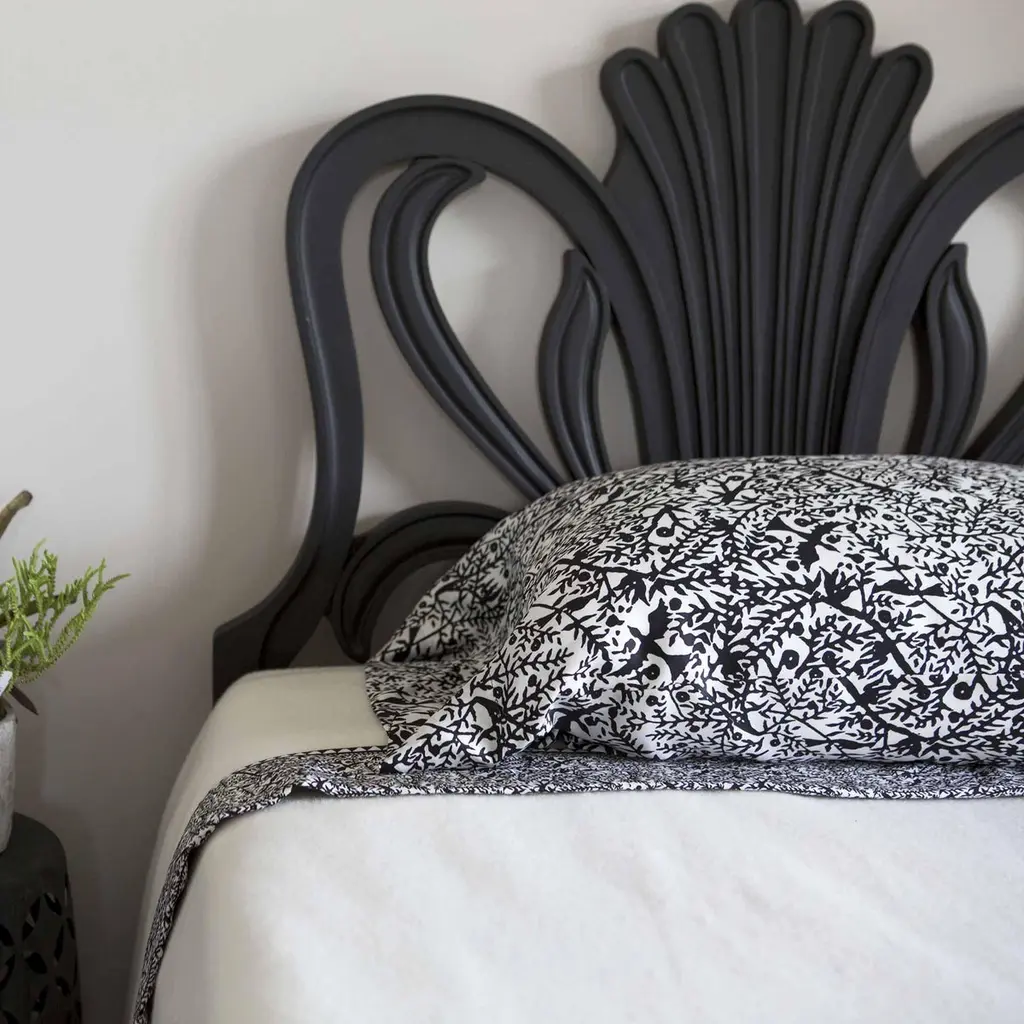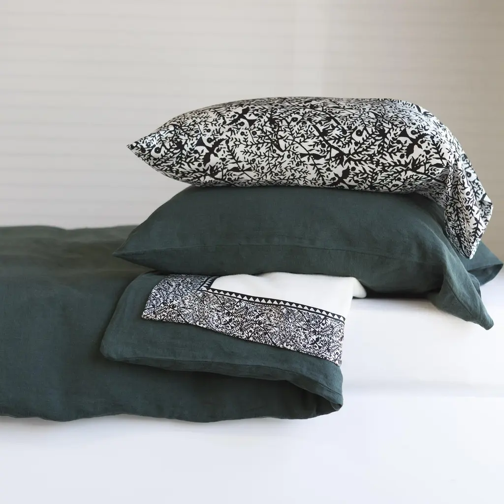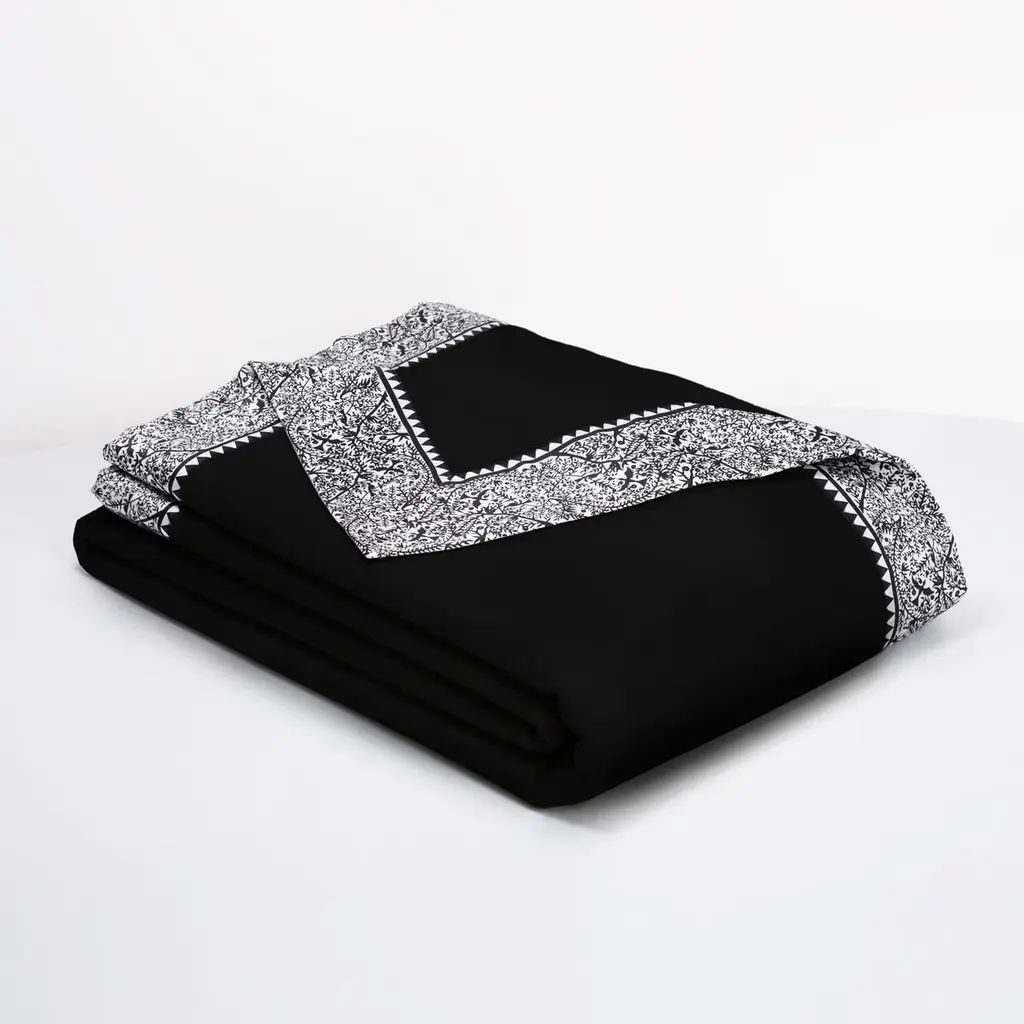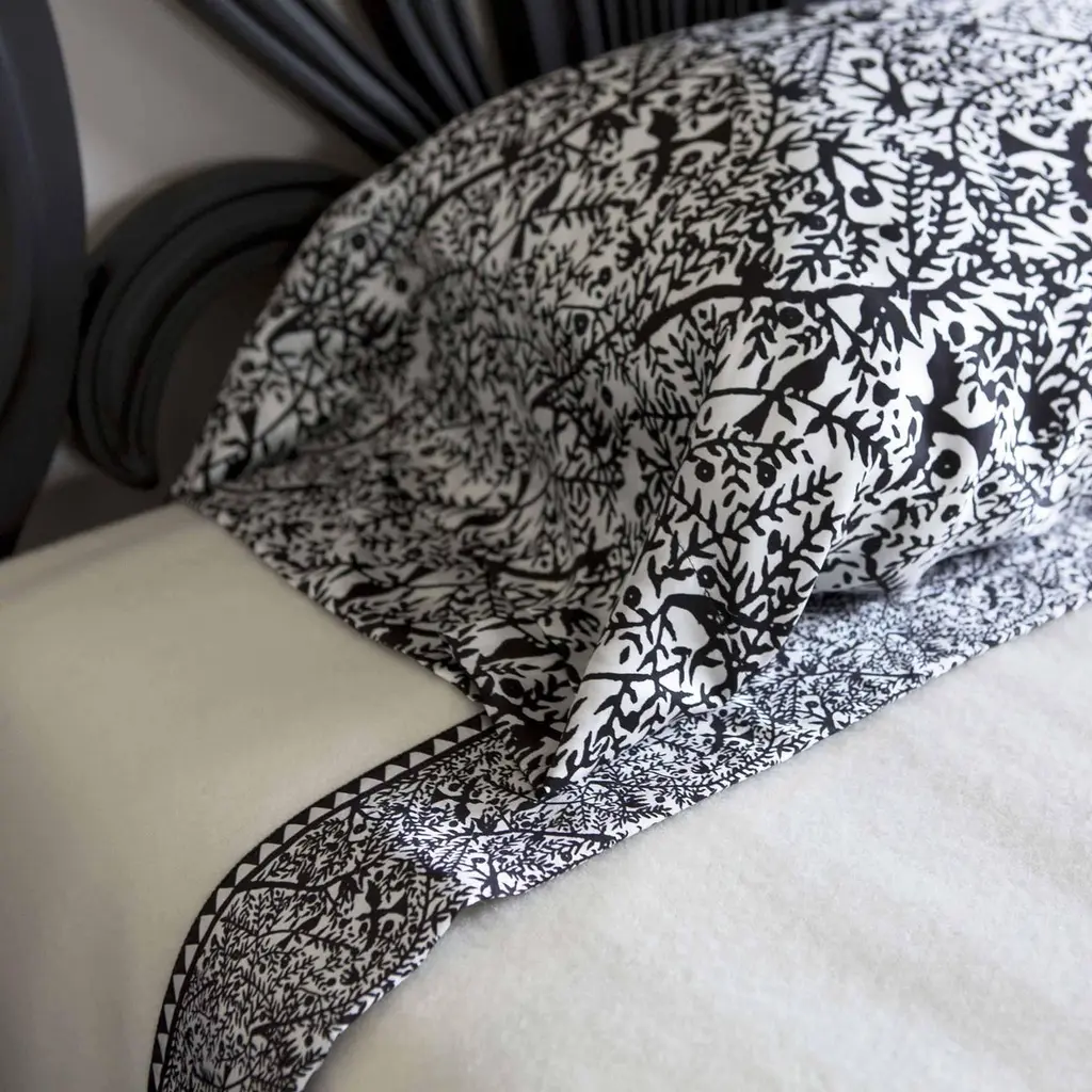 Can be used as a coverlet or blanket. Emilie: Recreating Weiner Werkstatte “Vienna Workshop” of the 1930s tribute to Emilie Floge, Gustav Klimt lifelong companion. Blankets as artful heirlooms that will last generations. 18th century English mill carries Royal Warrant to Windsor Castle. Bespoke dye colors available. 100% softest, premium Merino wool is fully framed with JG Switzer signature, 4” silk border. 19 mm, weighty, pure silk charmeuse. Artfully designed silk pattern is exclusive to JG Switzer and found nowhere else in the world. Hand sewn in our design workshop. In white or raven black.Only 100% natural, nature's finest fibers. Silk pillow body pillow and pillow slips to pair, also made by JG Switzer. We are obsessed with fine bedding.