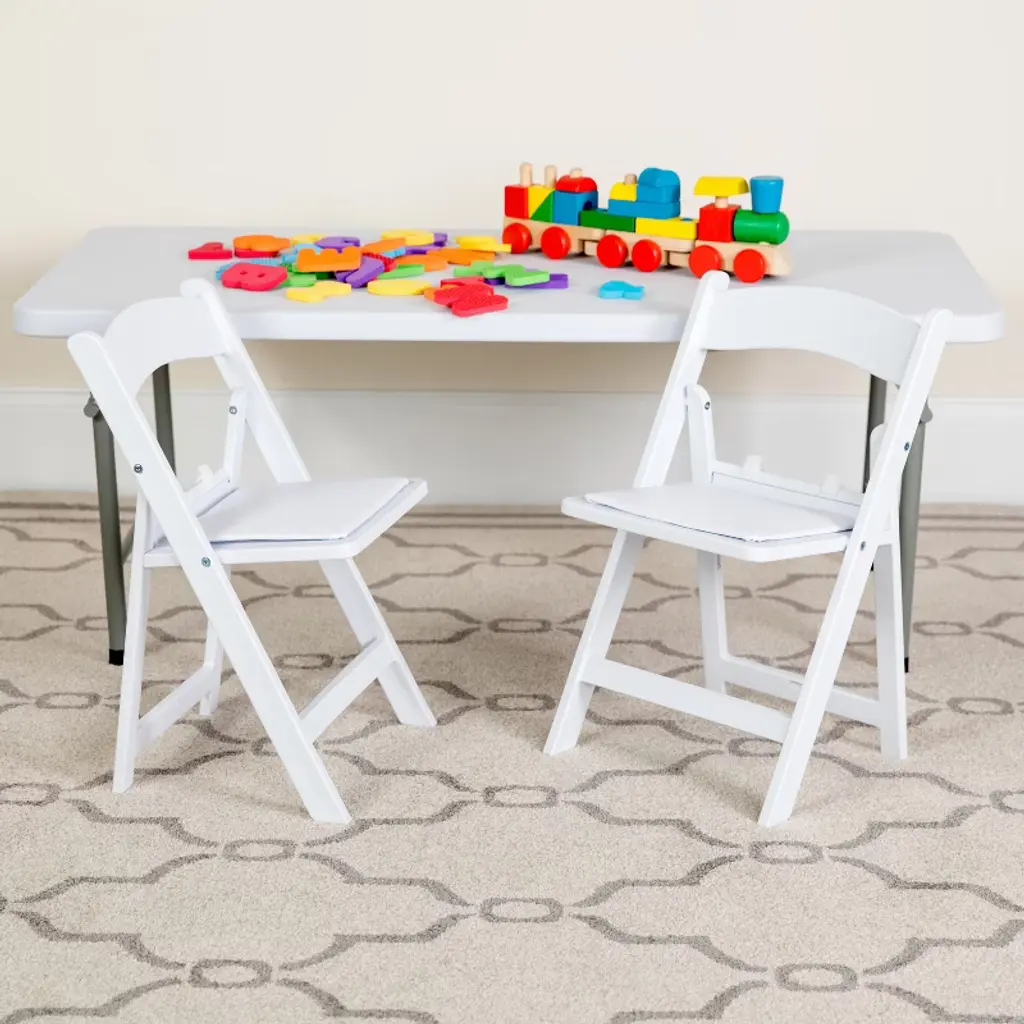 The Kids Resin Folding Chair is a delightful option to make kids feel like VIPs at your special events or while watching a movie on the big screen with your streaming home projector. These mini versions will fit right in with the classic adult-sized chairs. A frame made from ultra-strong resin makes them very lightweight, but extremely strong. In fact, they can hold up to 264 pounds. The smooth frame is double braced for added stability and the front brace can be used as a footrest. The color of the frame is the same all the way through, so you don't have to worry about nicks and scratches. No re-painting or staining is ever needed; your chairs will look great for years to come. This adorable little chair comes with a detachable, washable, waterproof seat cushion filled with fire retardant foam. The easy to clean, durable design of these chairs makes them the ideal choice for indoor and outdoor use. The chairs are portable and fold compactly to transport and store. Designed for residential and commercial use, these kid-friendly folding chairs will make it an event to remember, whether it's a recital in the backyard, a formal banquet or a special wedding. Additional Features: Removable Waterproof Vinyl Seat with CAL 117 Fire Retardant Foam, Designed for Commercial Use, Folded Size: 13.25"W x 1.5"D x 24"H, Kids Folding chair for extra seating, special events, rental companies and banquet halls