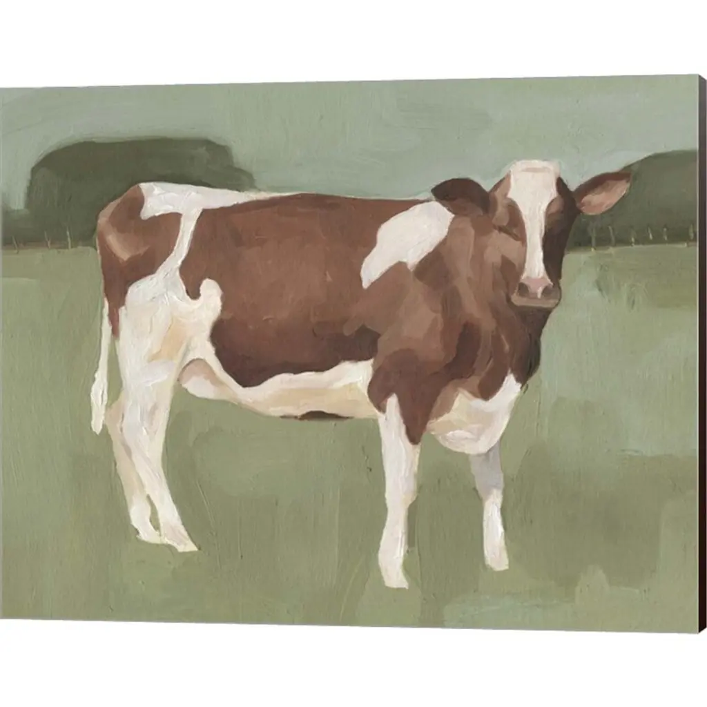 Bovine Field II by Emma Scarvey is a high quality piece of canvas artwork. The finished size of this piece is 20" X 16", and it has a depth 0.75" with espresso painted sides. There is a UV protective coating over the entire image, and it is ready to hang on your wall with no hardware required.