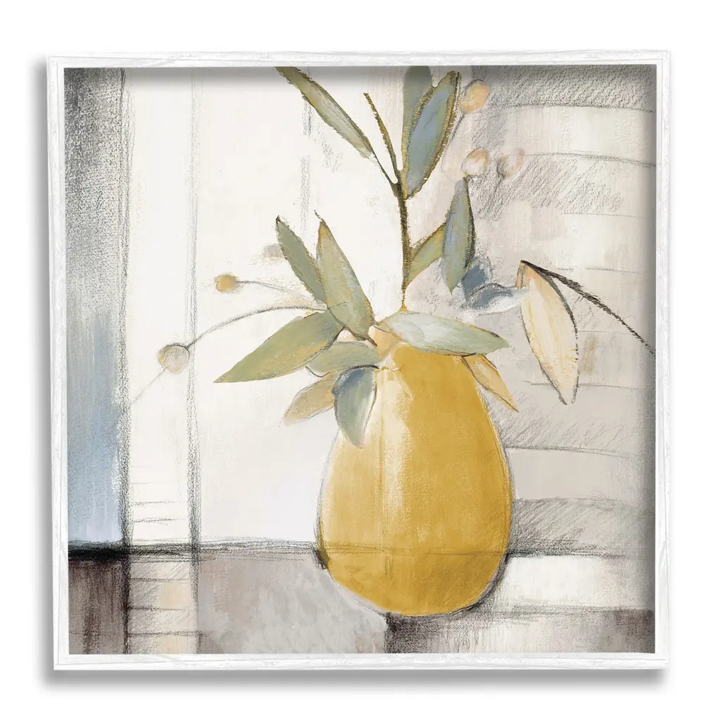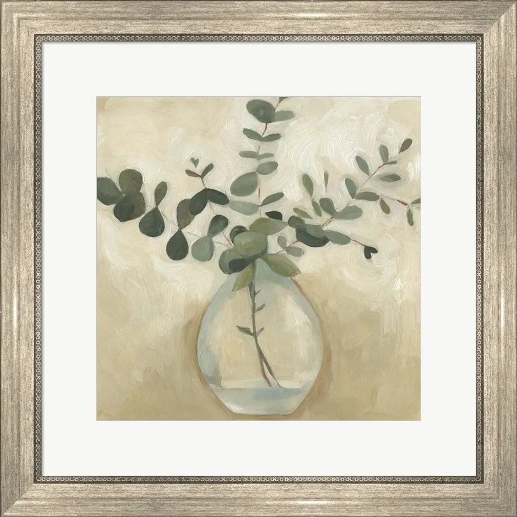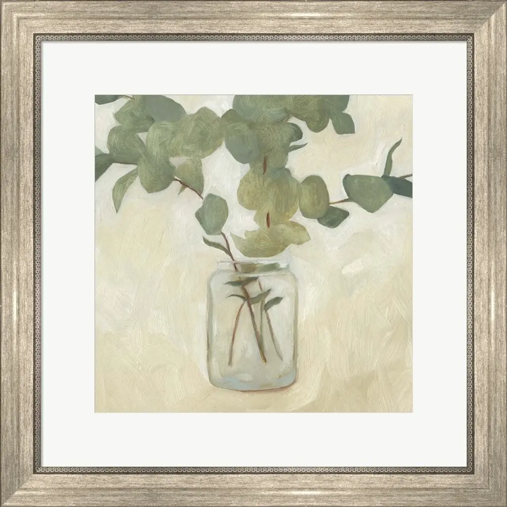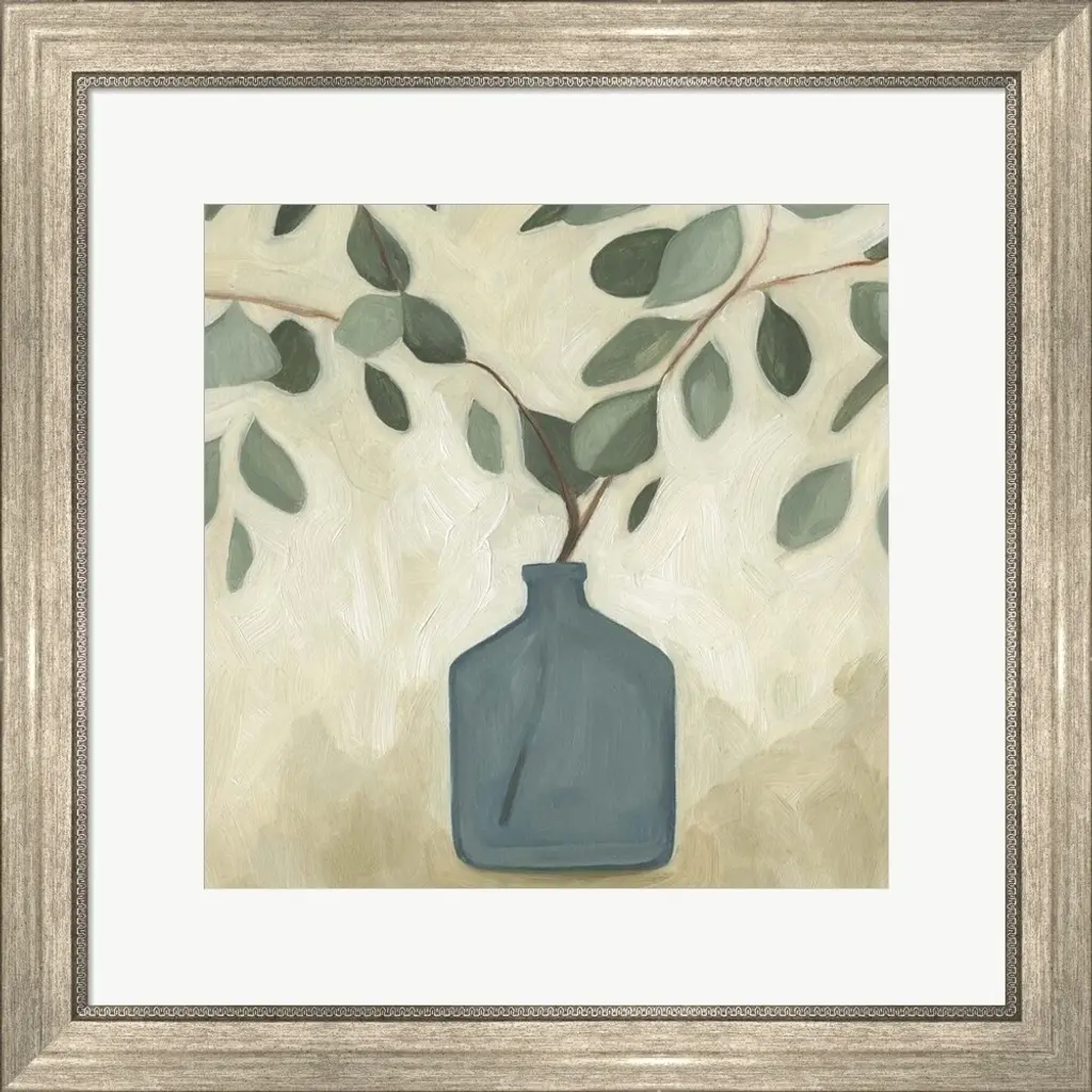 Greenery Still Life V by Emma Scarvey is a high quality piece of framed artwork. The finished size of this piece is 22" X 22". It has a Classic Champagne Silver with Ornate Inner Edge frame, is single matted and finished with high quality Acrylic Plexiglass.