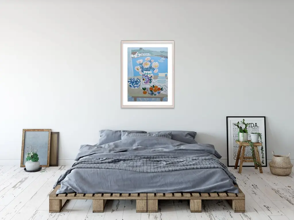 Seen first at One Kings Lane: This work from Emma Williams features a tabletop vignette with camellias and clementines in the foreground and a lovely coastal landscape in the distance. Printed on watercolor paper with deckled edges, floated over a mat, and simply framed, this piece arrives ready to hang.Irish-born painter Emma Williams is continuously inspired by pattern and color, as well as the exceptional natural beauty of the Cornish coast. Her textured works are celebrated for their distinctive style and evoke a particular time and mood with their vibrant color and flattened perspective.