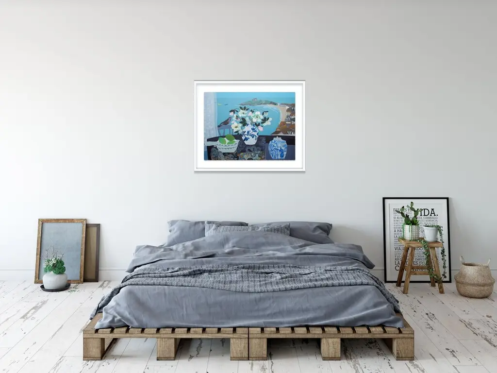 Seen first at One Kings Lane: This work from Emma Williams features a tabletop vignette with hellebores and limes in the foreground and a lovely coastal landscape in the distance. Printed on watercolor paper with deckled edges, floated over a mat, and simply framed, this piece arrives ready to hang.Irish-born painter Emma Williams is continuously inspired by pattern and color, as well as the exceptional natural beauty of the Cornish coast. Her textured works are celebrated for their distinctive style and evoke a particular time and mood with their vibrant color and flattened perspective.