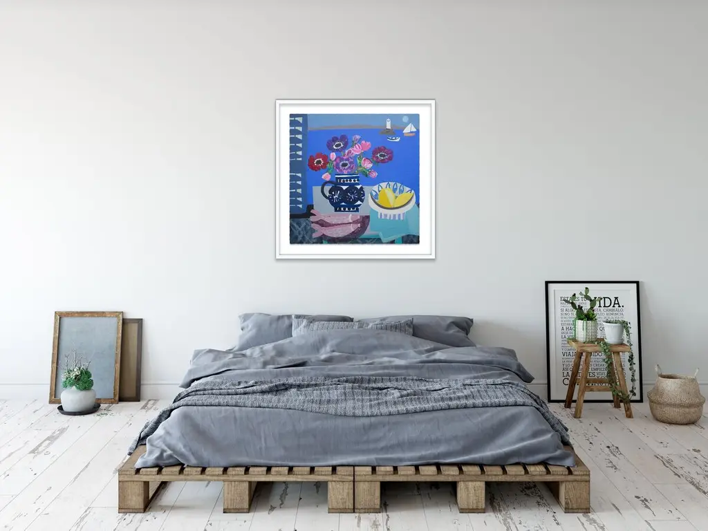 Seen first at One Kings Lane: This work from Emma Williams features a tabletop vignette with anemones and lemons in the foreground and a lovely seascape in the distance. Printed on watercolor paper with deckled edges, floated over a mat, and simply framed, this piece arrives ready to hang.Irish-born painter Emma Williams is continuously inspired by pattern and color, as well as the exceptional natural beauty of the Cornish coast. Her textured works are celebrated for their distinctive style and evoke a particular time and mood with their vibrant color and flattened perspective.