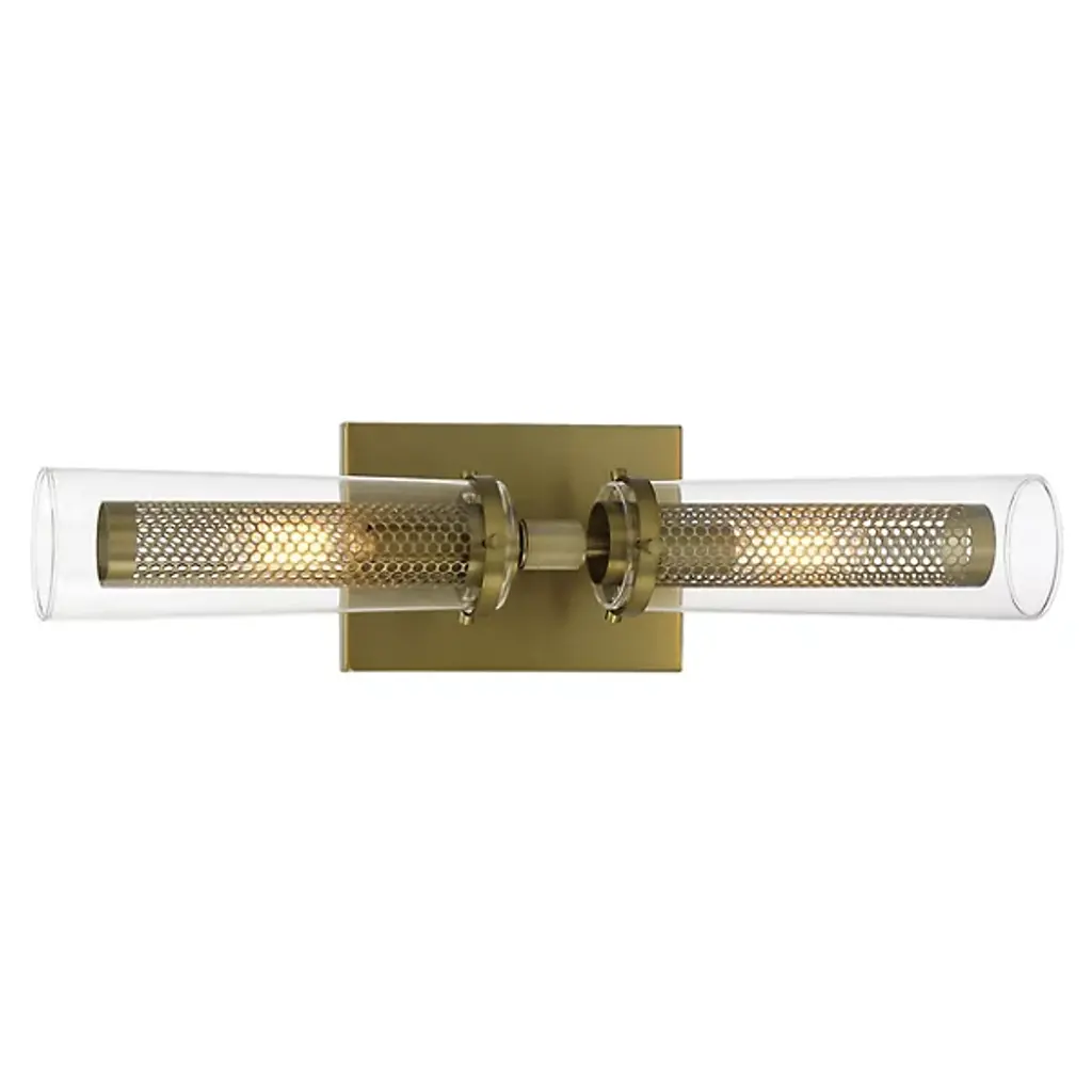 Enchant interiors with the Emmerham Vanity Light from Minka-Lavery. A tastefully-arranged retro fixture, it starts with a rectangular wall mount, extending damp-listed lamping suspending vintage-style lamping inside pierced metal cylinders accompanied by flaring shades of clear glass. The compound shade reduces glare from the sides, transmitting a mix of warm glow and focused wall wash.
