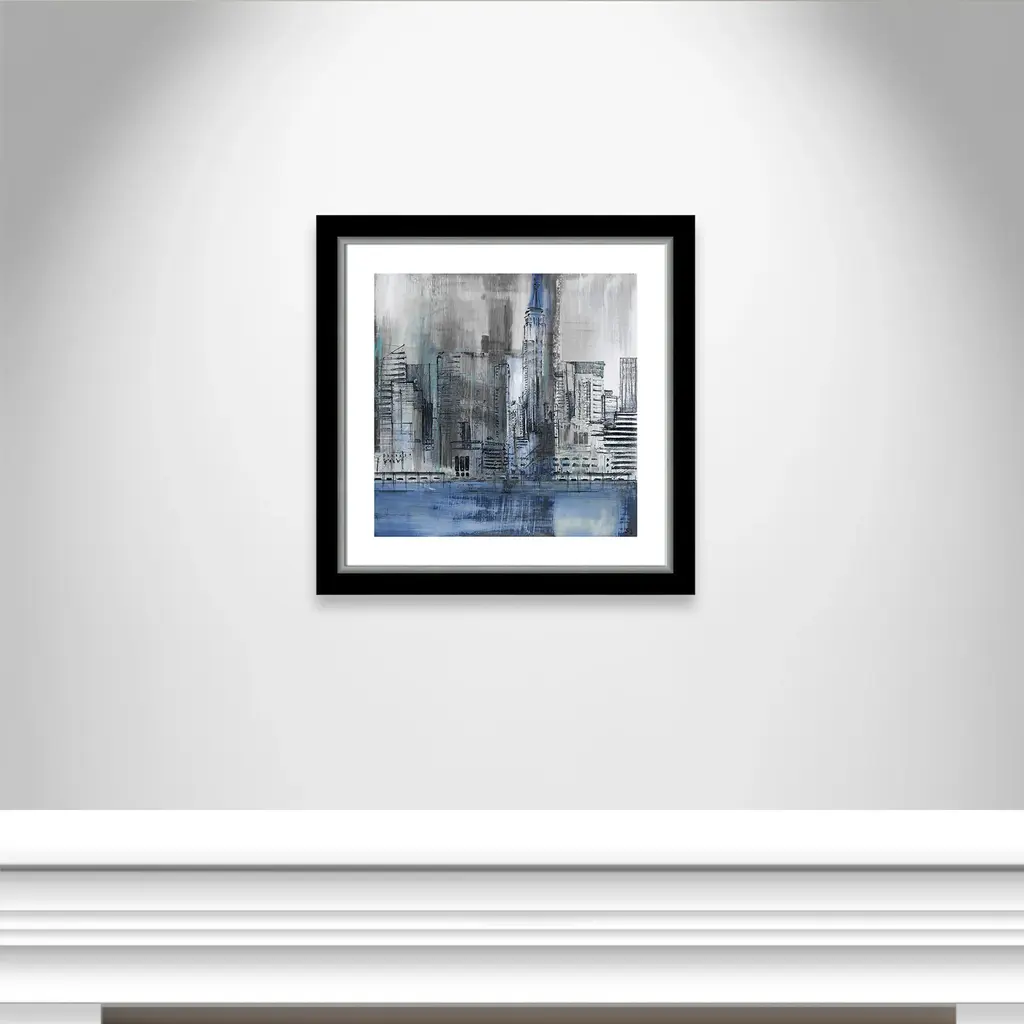 Empire State', a unique piece of urban abstract artwork depicting the NYC skyline in a cool palette of blues and greys, is the perfect addition to any contemporary home decor. This industrial modern piece presents the famed cityscape in great detail, while maintaining elements of allure and minimalism. Finished in a modern frame made of PS materials, this is the perfect addition to your walls. Archival fine art giclée print on acid-free and lignin-free 100% cotton rag paper; image includes a bright white self-matting border Printed with gallery-quality inks using the finest giclée print technology for unsurpassed color gamut and clarity Lightweight and finished under shatter-resistant acrylic; hanging hardware attached for easy and secure installation Handcrafted in the USA and ships with a Certificate of Authenticity Lightweight and finished under shatter-resistant acrylic