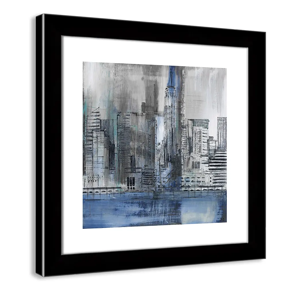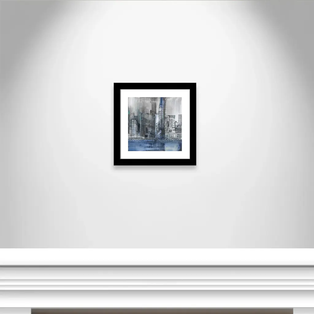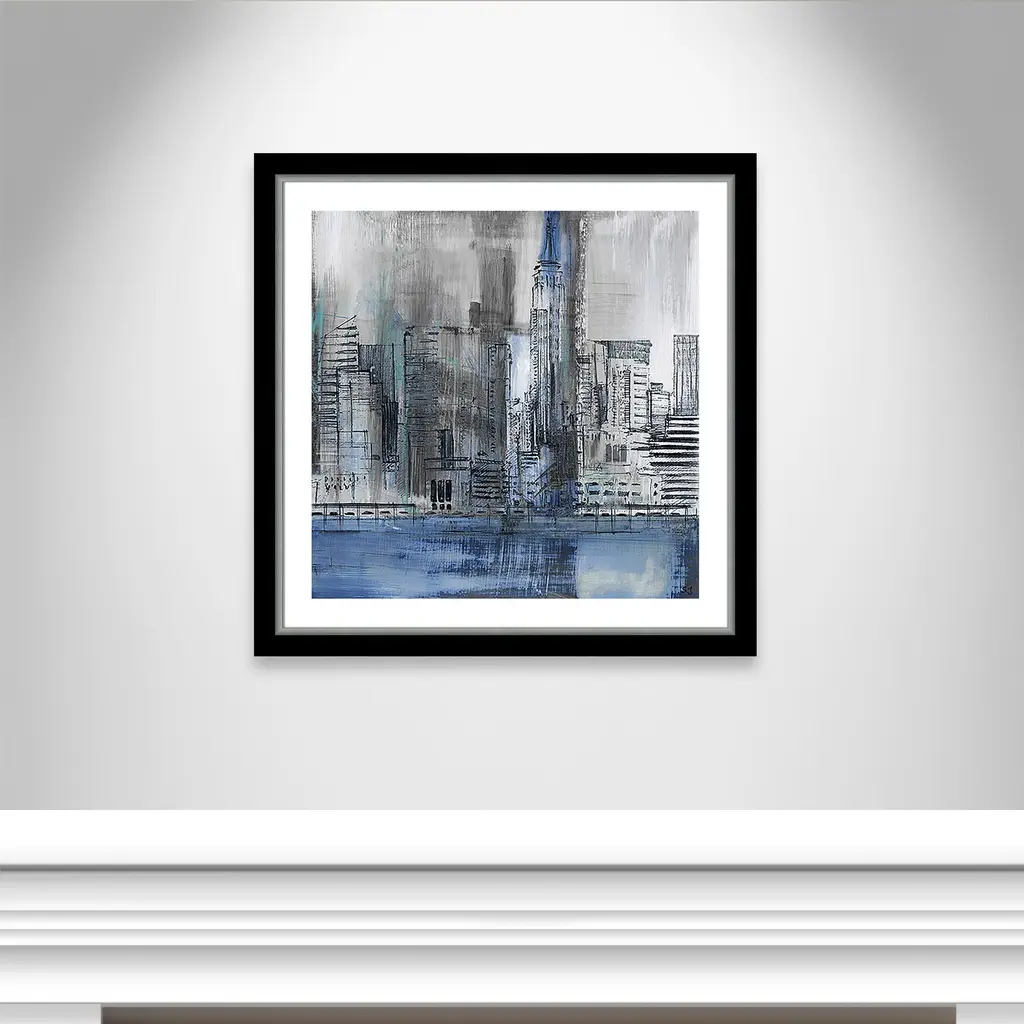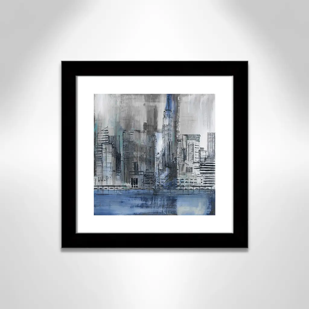Empire State', a unique piece of urban abstract artwork depicting the NYC skyline in a cool palette of blues and greys, is the perfect addition to any contemporary home decor. This industrial modern piece presents the famed cityscape in great detail, while maintaining elements of allure and minimalism. Finished in a modern frame made of PS materials, this is the perfect addition to your walls. Archival fine art giclée print on acid-free and lignin-free 100% cotton rag paper; image includes a bright white self-matting border Printed with gallery-quality inks using the finest giclée print technology for unsurpassed color gamut and clarity Lightweight and finished under shatter-resistant acrylic; hanging hardware attached for easy and secure installation Handcrafted in the USA and ships with a Certificate of Authenticity Lightweight and finished under shatter-resistant acrylic