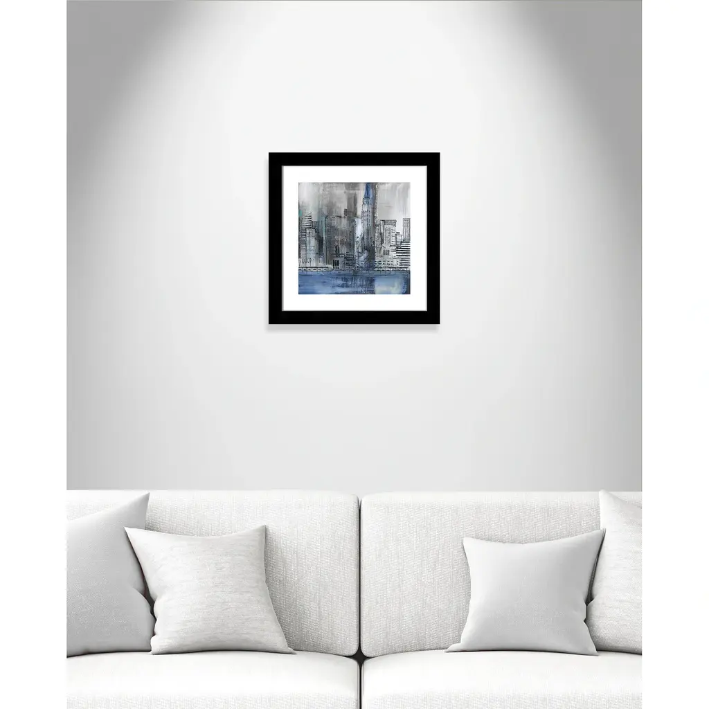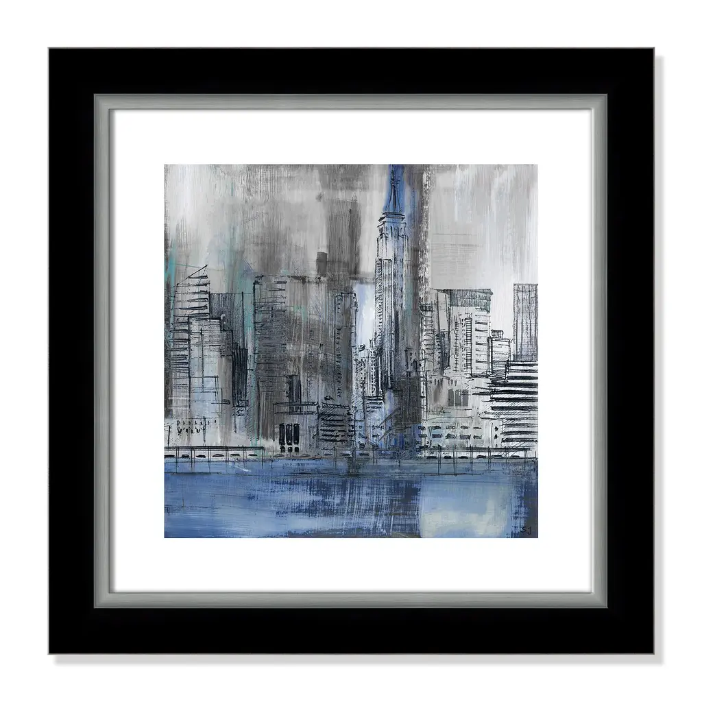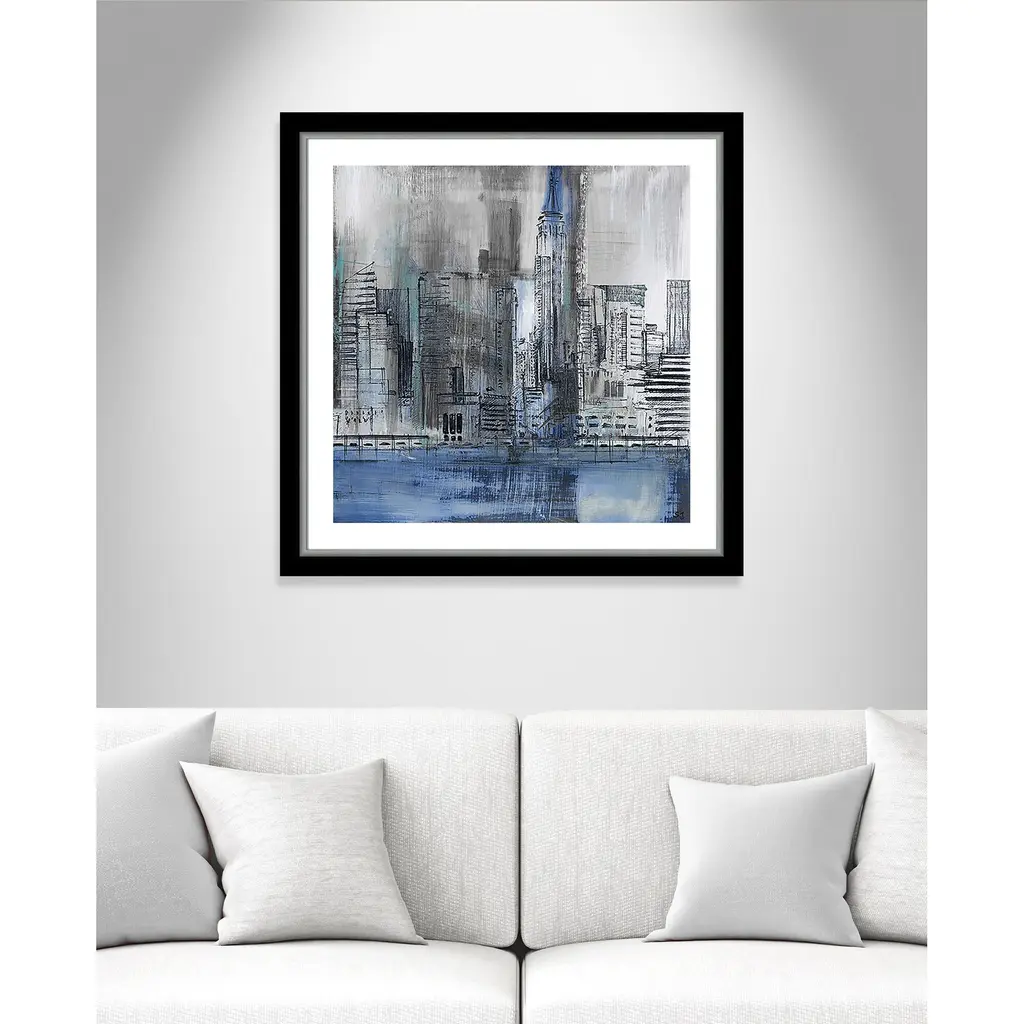 Empire State', a unique piece of urban abstract artwork depicting the NYC skyline in a cool palette of blues and greys, is the perfect addition to any contemporary home decor. This industrial modern piece presents the famed cityscape in great detail, while maintaining elements of allure and minimalism. Finished in a modern frame made of PS materials, this is the perfect addition to your walls. Archival fine art giclée print on acid-free and lignin-free 100% cotton rag paper; image includes a bright white self-matting border Printed with gallery-quality inks using the finest giclée print technology for unsurpassed color gamut and clarity Lightweight and finished under shatter-resistant acrylic; hanging hardware attached for easy and secure installation Handcrafted in the USA and ships with a Certificate of Authenticity Lightweight and finished under shatter-resistant acrylic