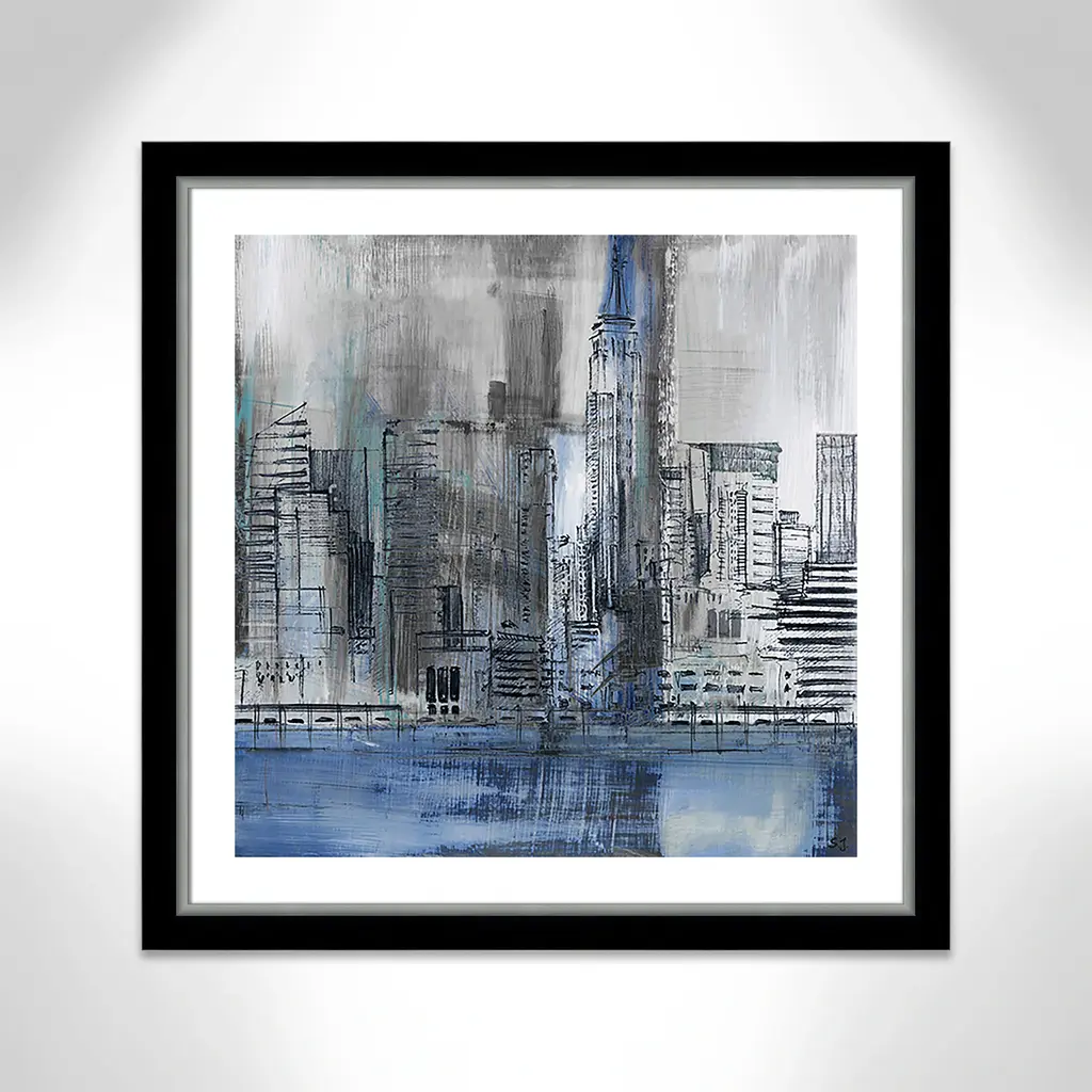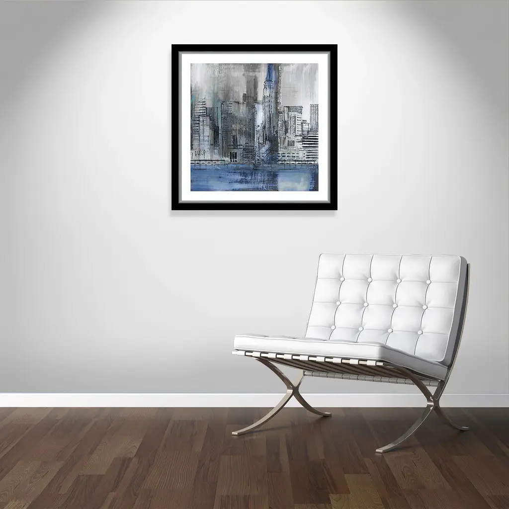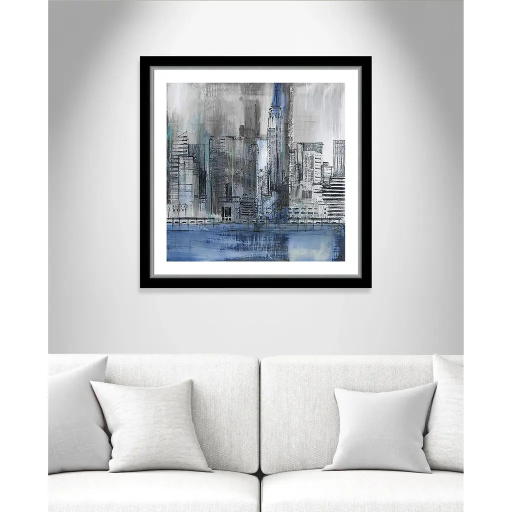 Empire State', a unique piece of urban abstract artwork depicting the NYC skyline in a cool palette of blues and greys, is the perfect addition to any contemporary home decor. This industrial modern piece presents the famed cityscape in great detail, while maintaining elements of allure and minimalism. Finished in a modern frame made of PS materials, this is the perfect addition to your walls. Archival fine art giclée print on acid-free and lignin-free 100% cotton rag paper; image includes a bright white self-matting border Printed with gallery-quality inks using the finest giclée print technology for unsurpassed color gamut and clarity Lightweight and finished under shatter-resistant acrylic; hanging hardware attached for easy and secure installation Handcrafted in the USA and ships with a Certificate of Authenticity Lightweight and finished under shatter-resistant acrylic