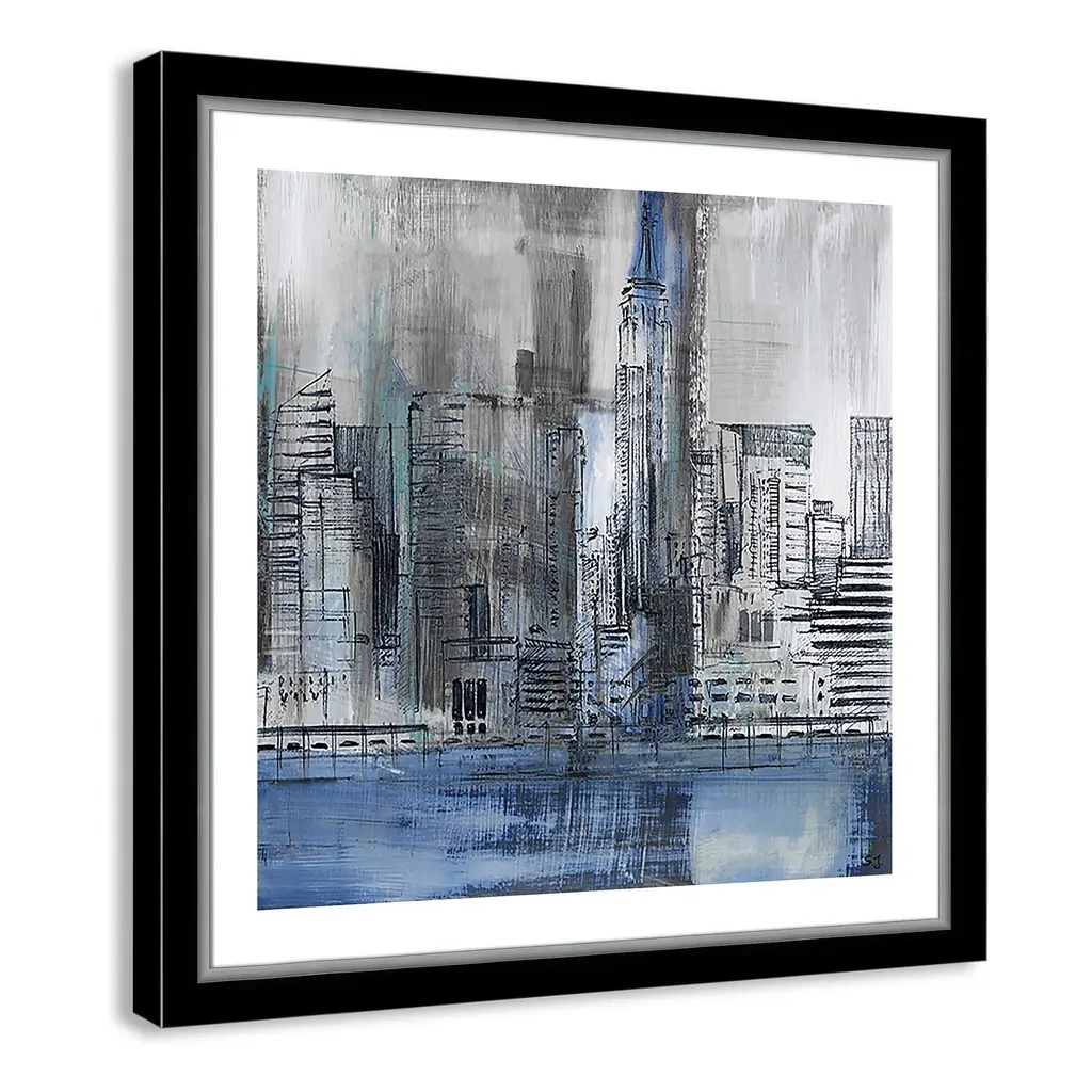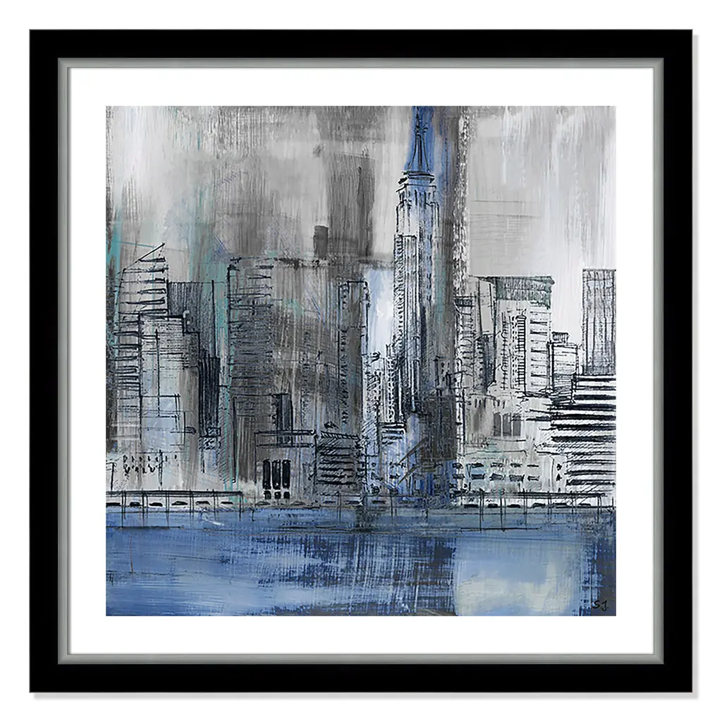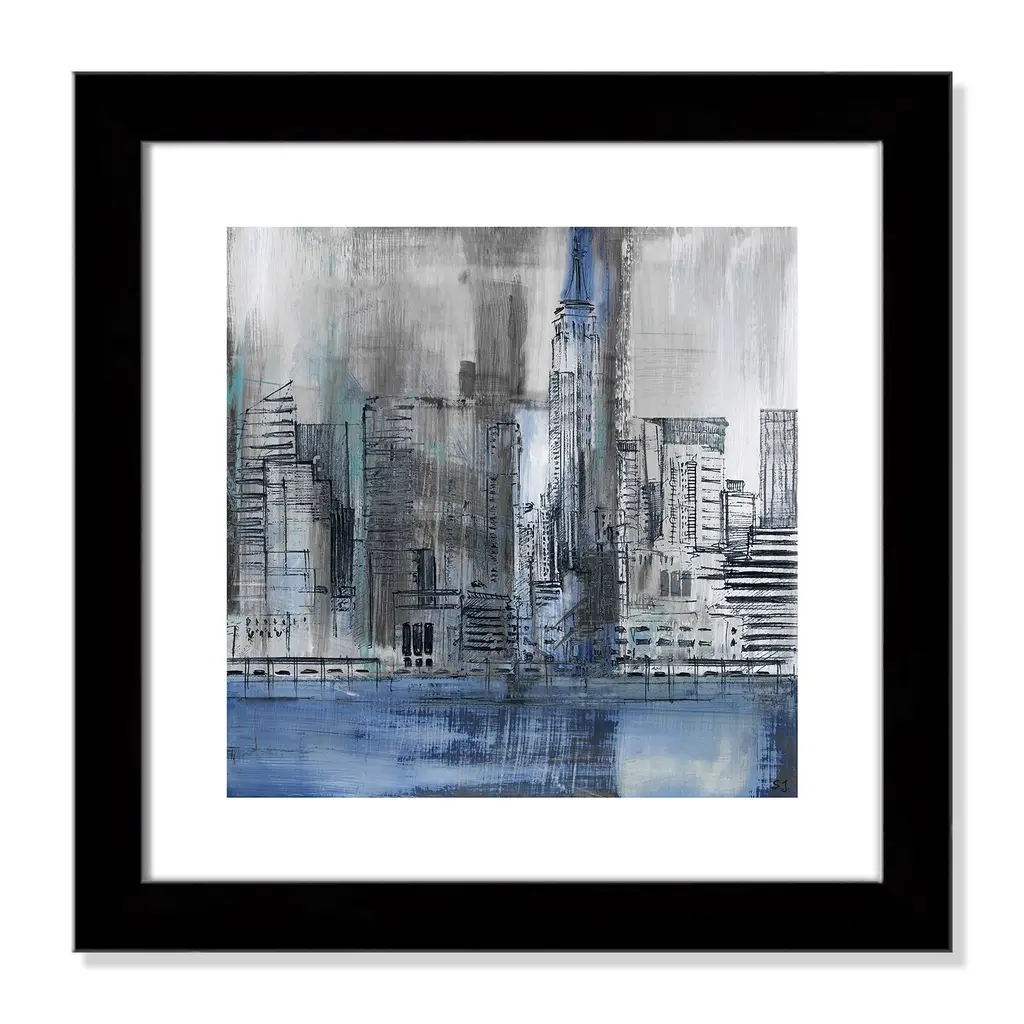 Empire State', a unique piece of urban abstract artwork depicting the NYC skyline in a cool palette of blues and greys, is the perfect addition to any contemporary home decor. This industrial modern piece presents the famed cityscape in great detail, while maintaining elements of allure and minimalism. Finished in a modern frame made of PS materials, this is the perfect addition to your walls. Archival fine art giclée print on acid-free and lignin-free 100% cotton rag paper; image includes a bright white self-matting border Printed with gallery-quality inks using the finest giclée print technology for unsurpassed color gamut and clarity Lightweight and finished under shatter-resistant acrylic; hanging hardware attached for easy and secure installation Handcrafted in the USA and ships with a Certificate of Authenticity Lightweight and finished under shatter-resistant acrylic