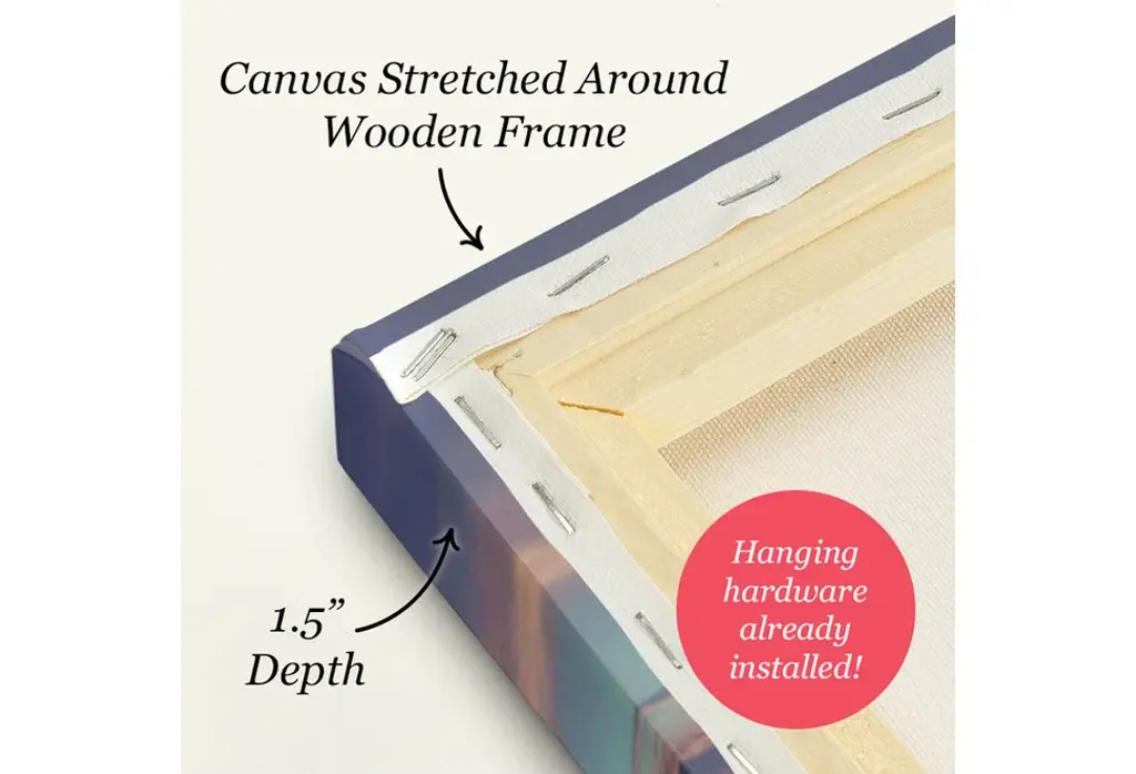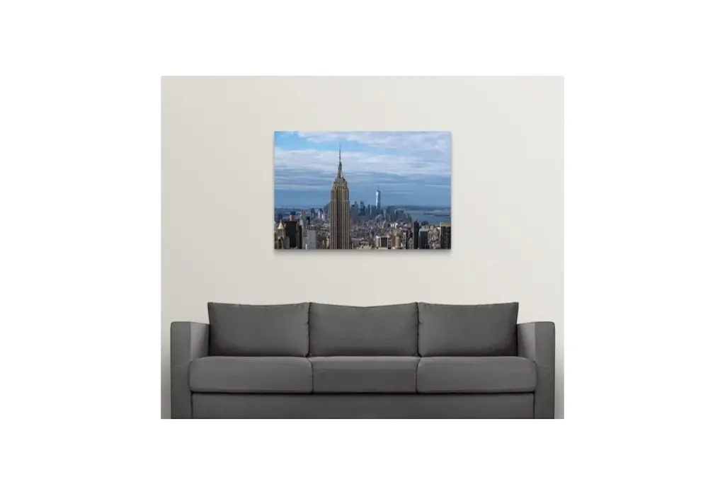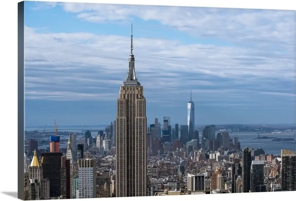 Gallery-Wrapped Canvas entitled 'Empire State Building and One World Trade Center, New York City'. The Empire State Building rising above the New York City skyscrapers, with the One World Trade Center building in the distance. Multiple sizes available. Primary colors within this image include: Peach, Sky Blue, Black, Gray. Made in USA. All products come with a 365 day workmanship guarantee. Archival-quality UV-resistant inks. Canvases are stretched across a 1.5 inch thick wooden frame with easy-to-mount hanging hardware. Canvas is designed to prevent fading.