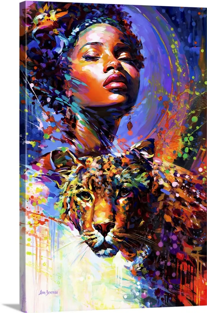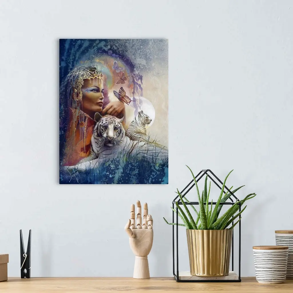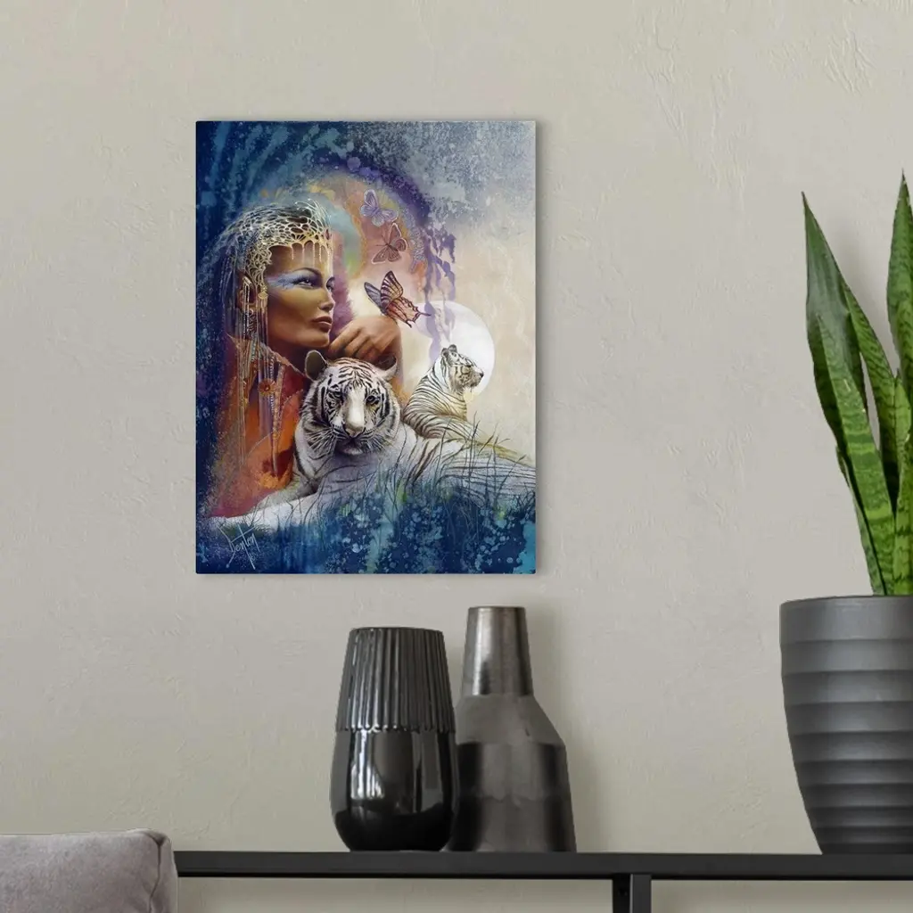 A contemporary painting of a woman wearing a golden headdress with dangling beads from the sides with white tigers lounging in the foreground of the image.