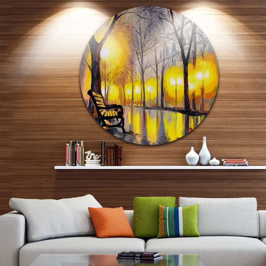 Bring Contemporary Abstraction to your home with this large Circle Metal wall art. This Empty Autumn Street Metal Artwork makes it the focal point of any room or office. - White Gloss Coating ensures colors are extra vibrant with light reflection.- Aluminum grade Sheet Metal with 1 inch mounting frame on the back giving the illusion that the artwork is floating on the wall..- Mounting Brackets are included along with instructions.- High Quality Digital images are created directly into a glossy aluminum panel producing a stunning and captivating print into the glossy finish of the metal.- Water, Fire and Scratch resistant HD Aluminum panels.- Looks better than any photo paper and guaranteed to last at least 20 years- Easy to clean with a microfiber cloth. Colors are far superior to regular Canvas Art. - Easy to Hang