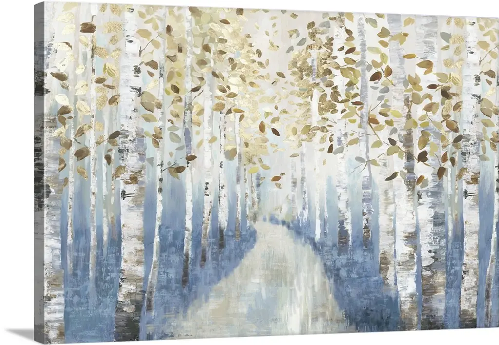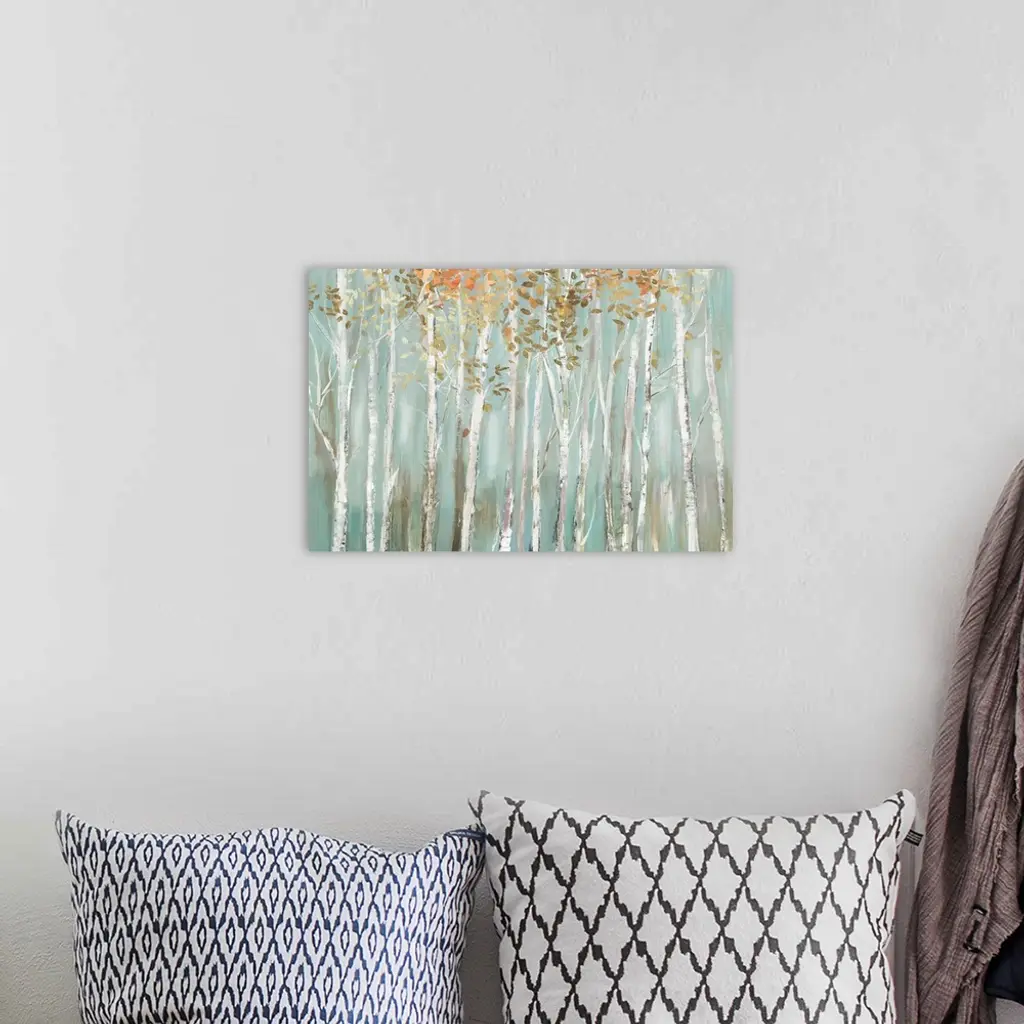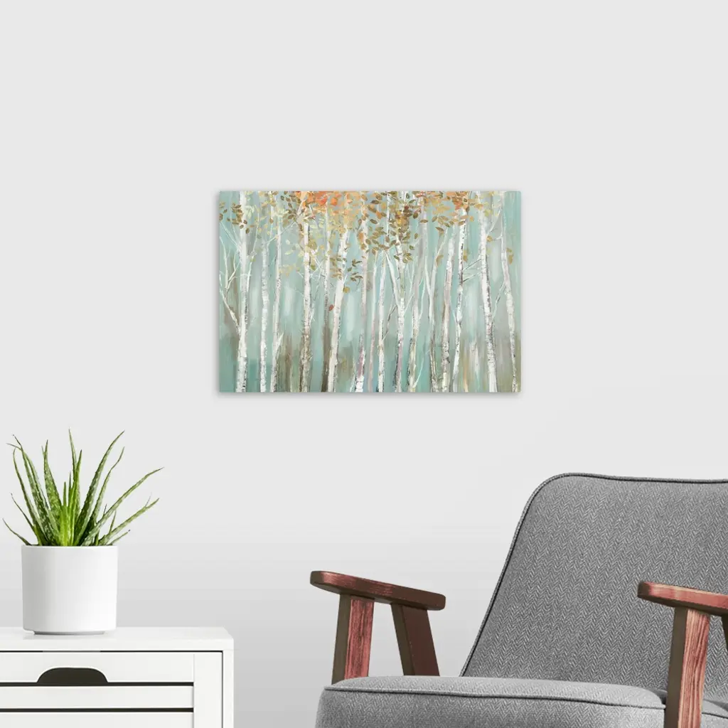 Contemporary horizontal painting of a forest of birch trees with warm colored leaves.