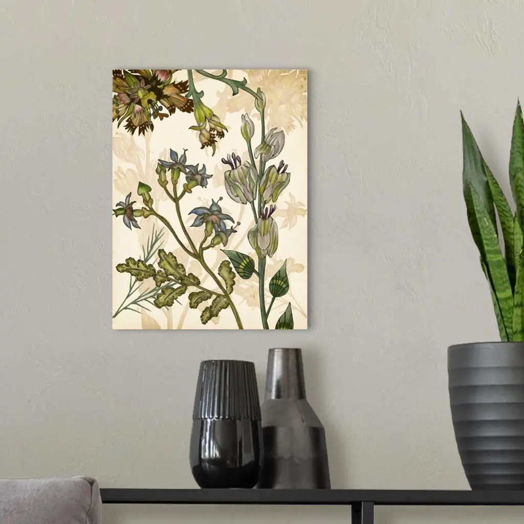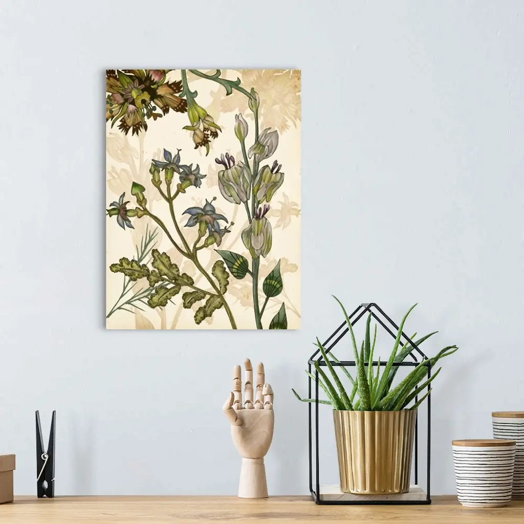 Contemporary artwork of garden flowers in muted shades against a beige floral background.