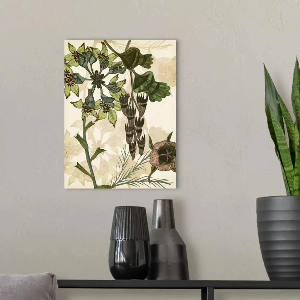 Contemporary artwork of garden flowers in muted shades against a beige floral background.