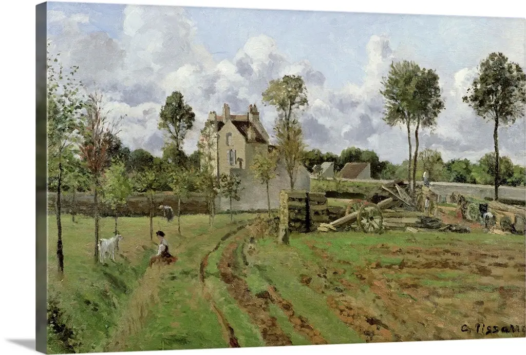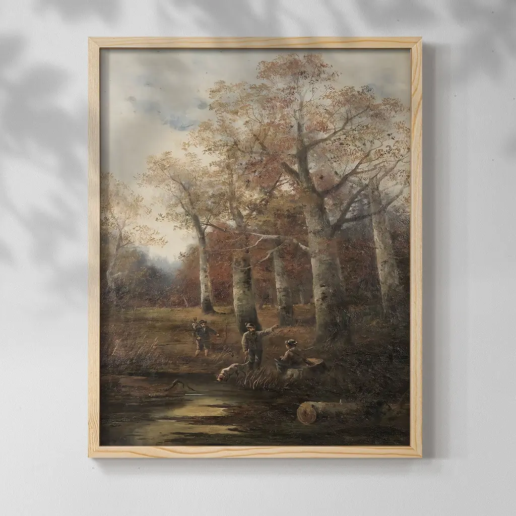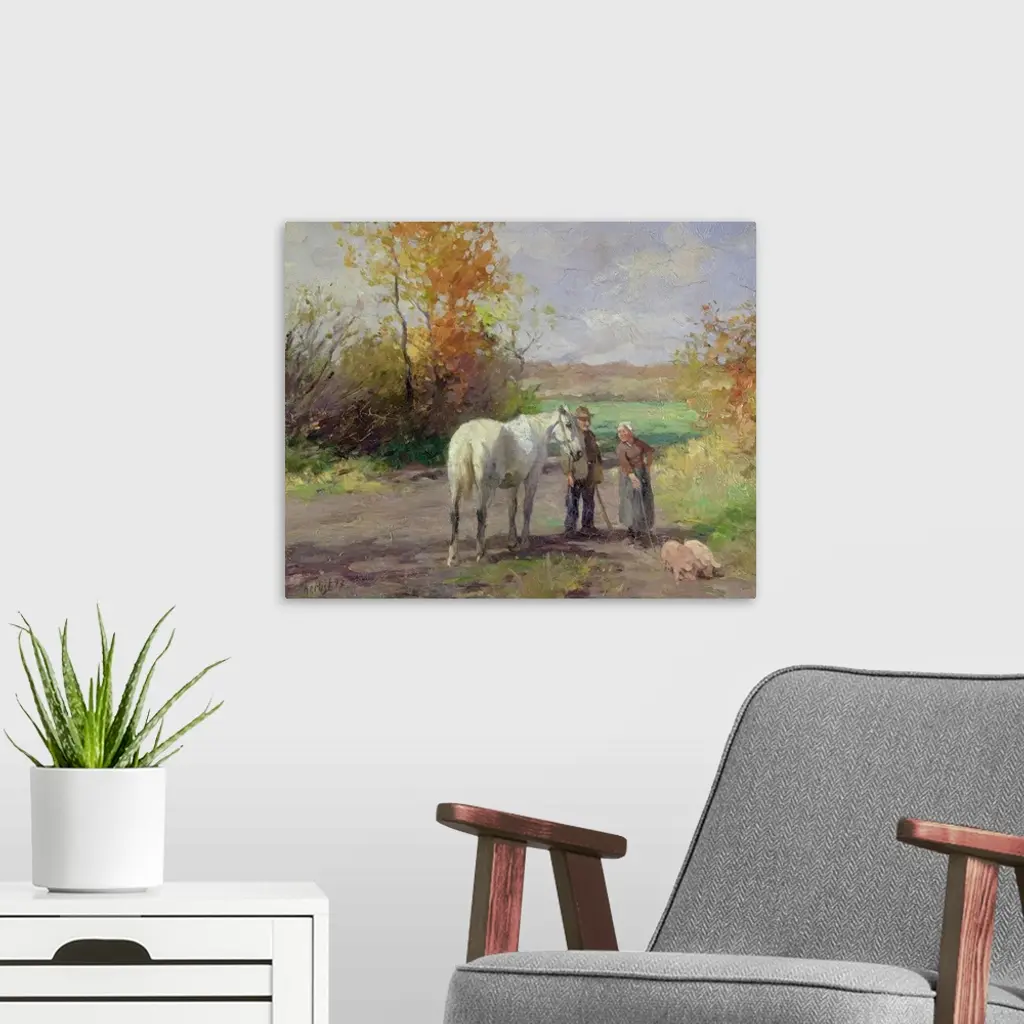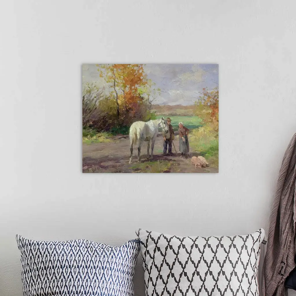 Oil painting print of a man, woman and horse standing in a path looking at two pigs with trees and a field in the distance.
