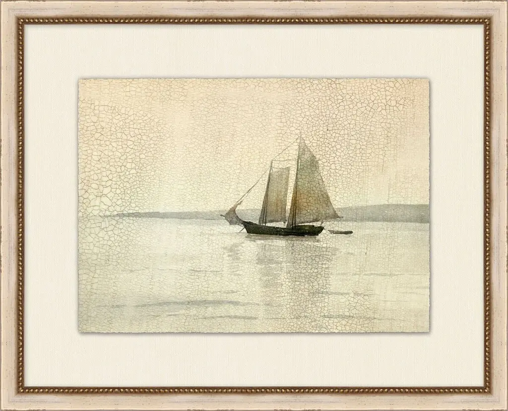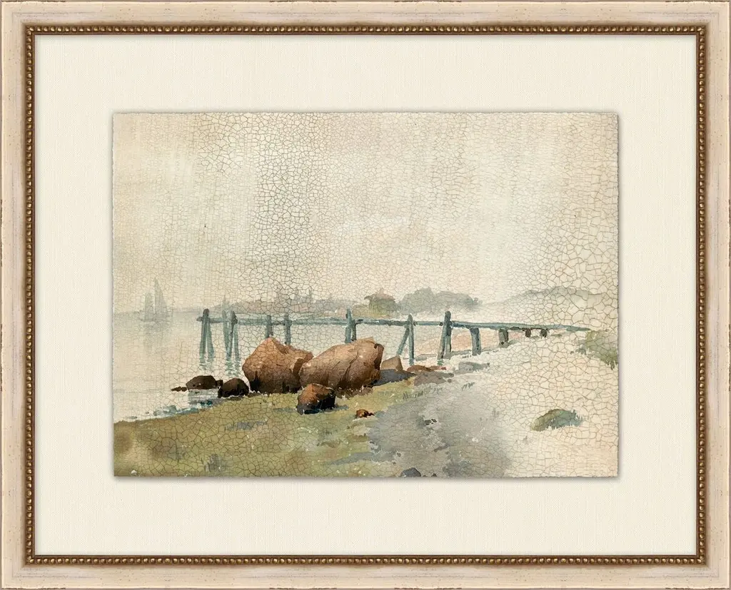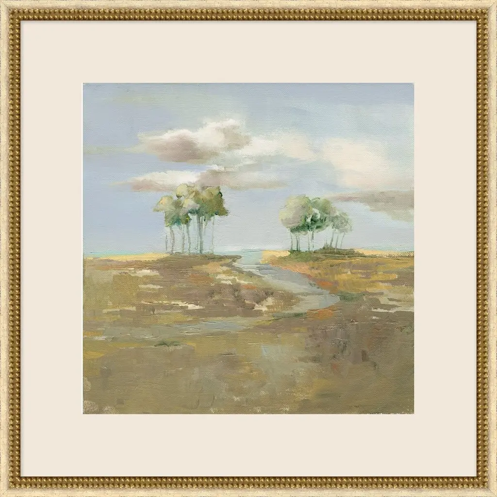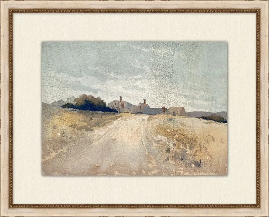 Seen first at One Kings Lane: A faithful reproduction of a vintage work down to its crackled finish, this quiet landscape is printed on matte paper with deckled edges. Floated over a white mat and displayed in a wood frame, this piece arrives ready to hang.