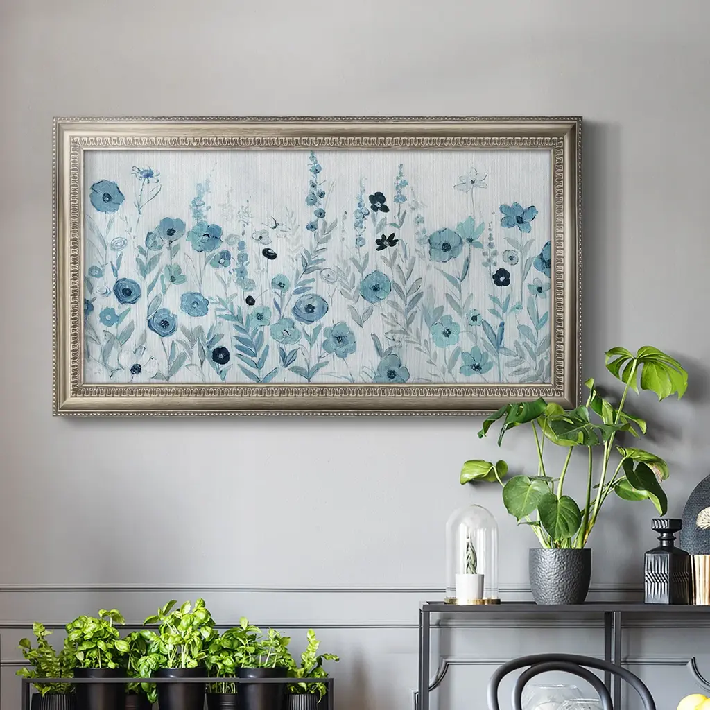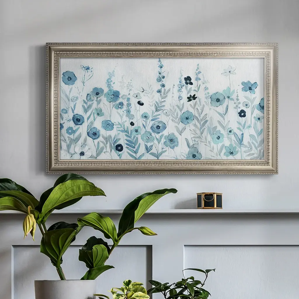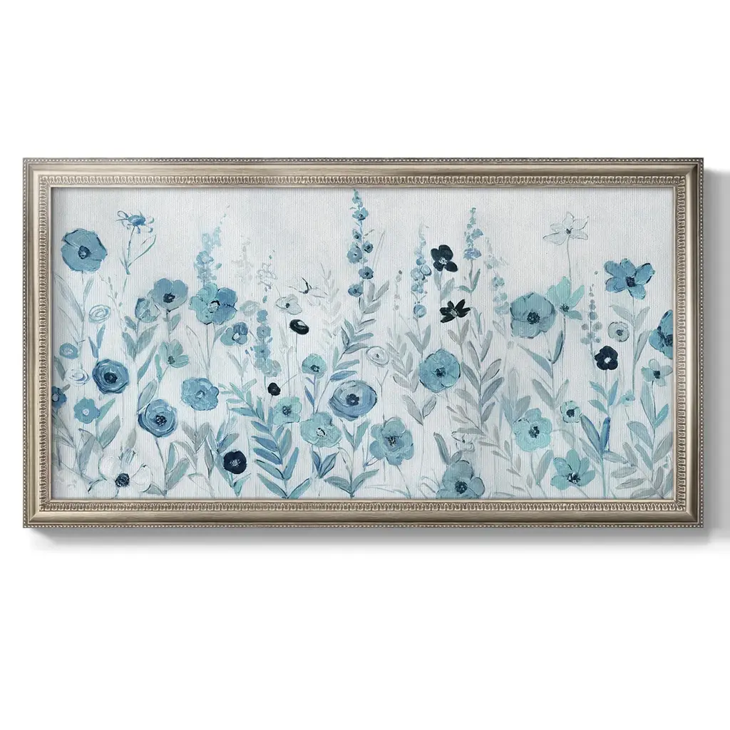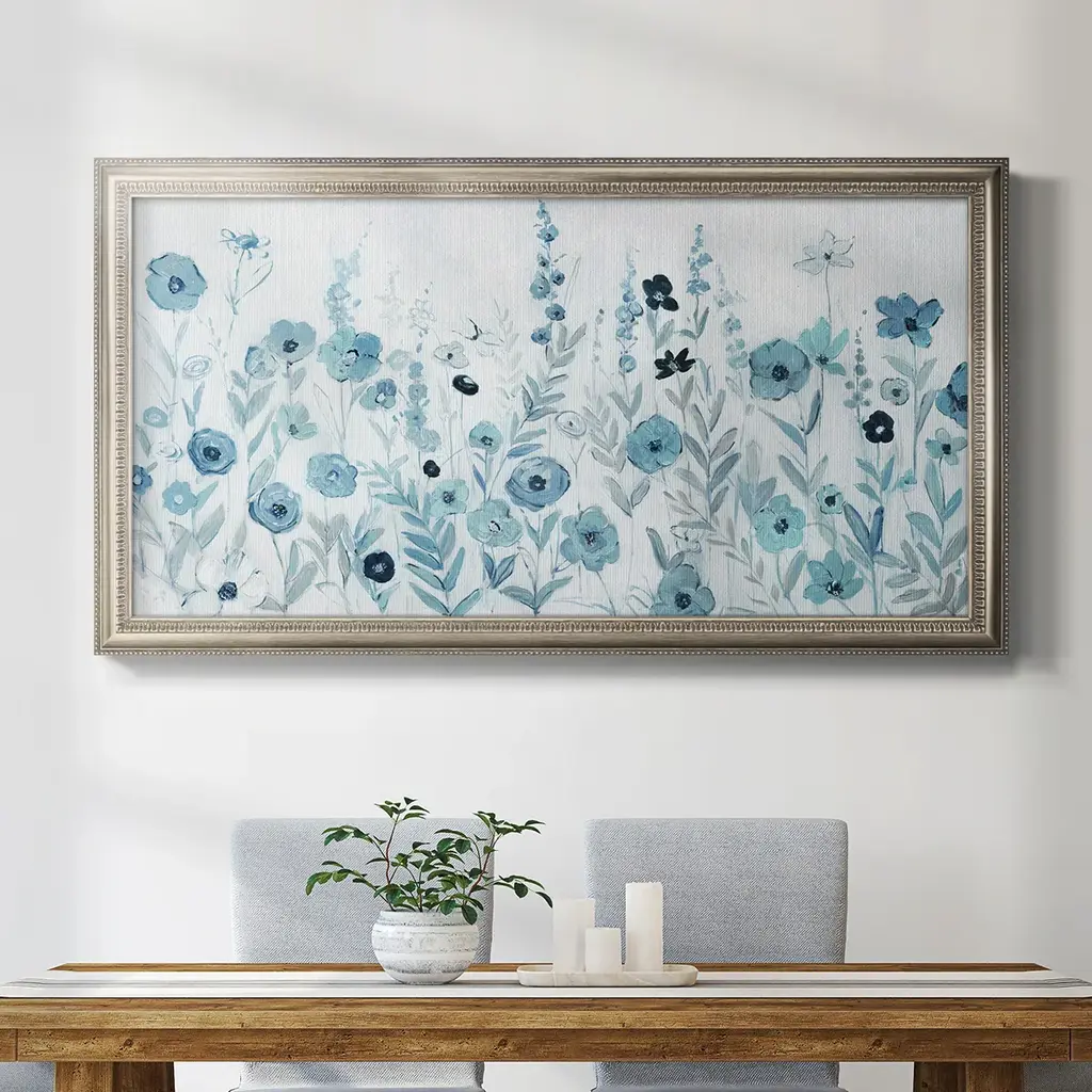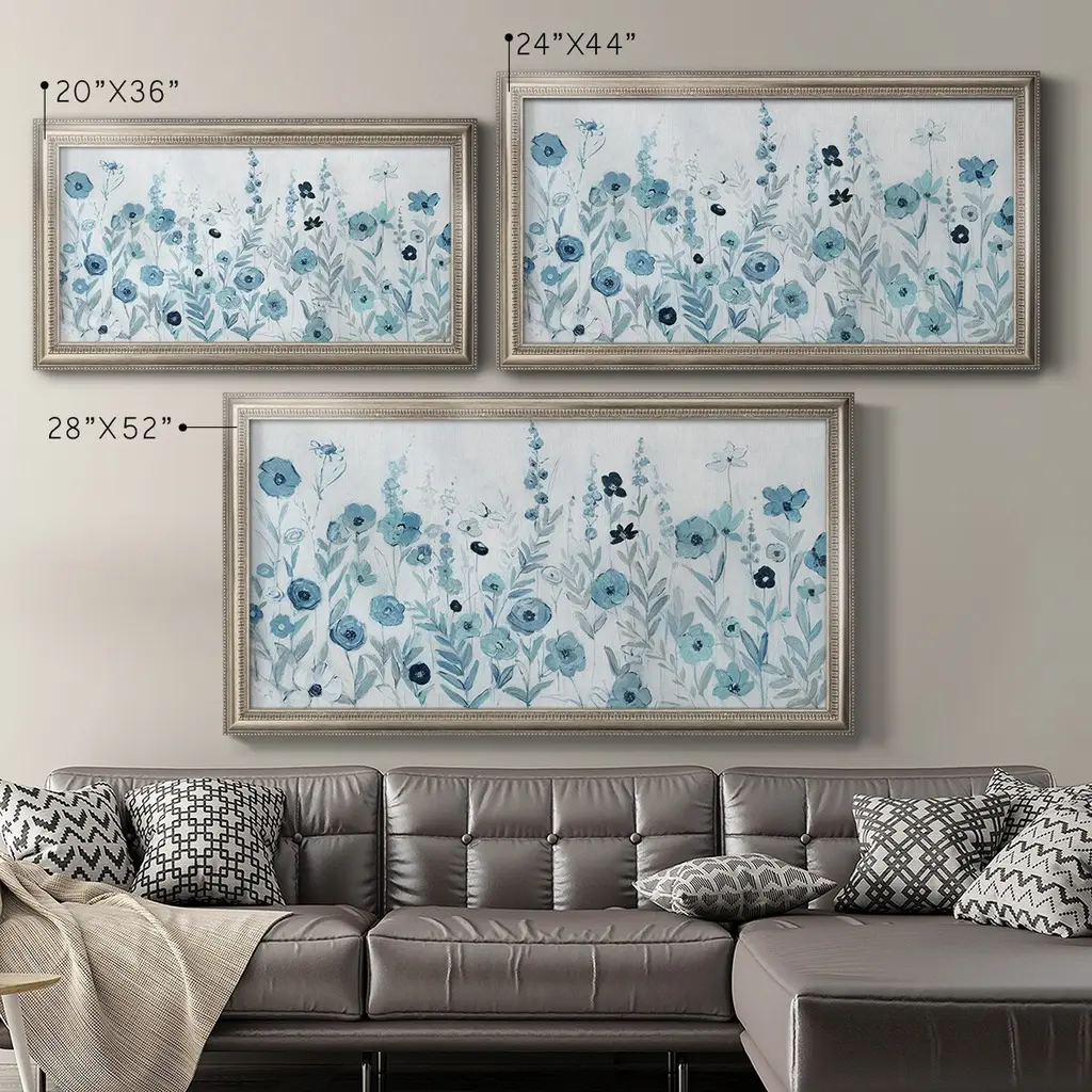 Endless Field of Blue Premium Framed Canvas- Ready to Hang A Premium Framed Canvas created to last. Framed in distressed wood and available in an array of sizes and colors Featuring a beveled a solid wood stretcher bar, each piece comes ready to hand 3 SIZES AVAILABLE 21''X37'' - Overall Size 25''X45'' - Overall Size 29''x53'' - Overall Size Each piece is made to order. Each piece comes with hanging hardware. Made in the USA Ready to Hang Giclee Paper Print Acrylic Glass Beveled Matt Board