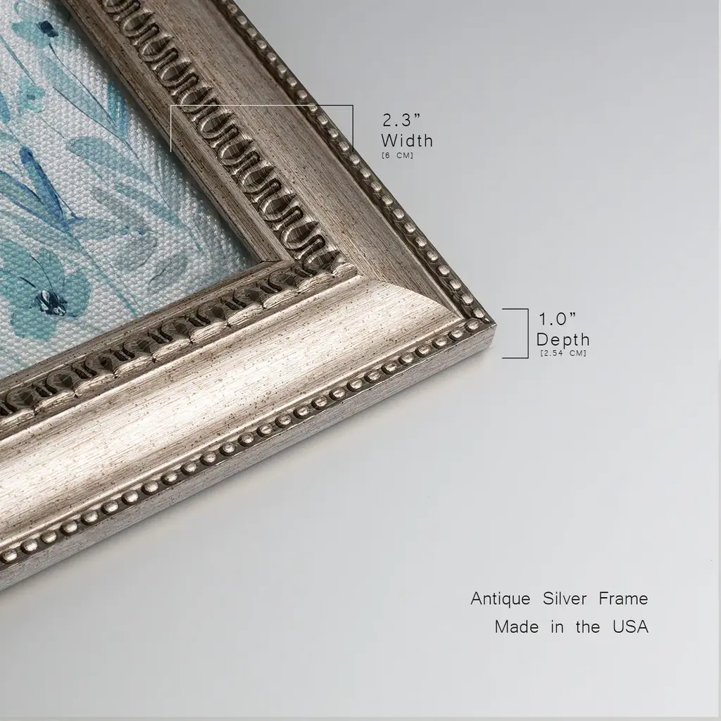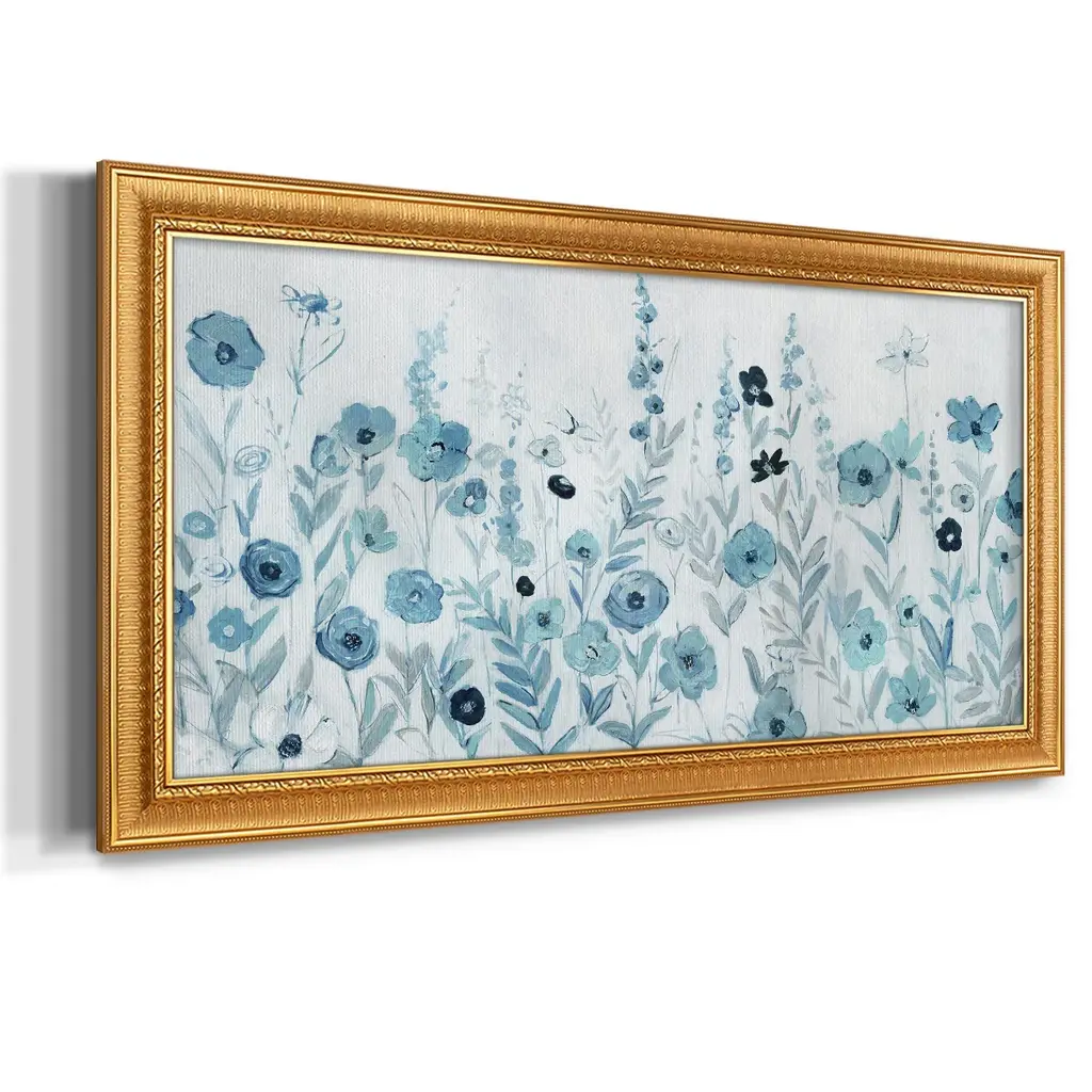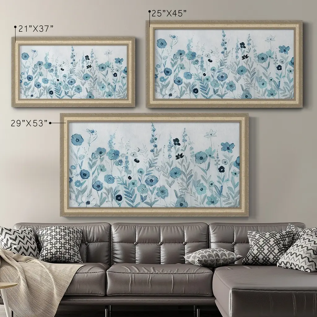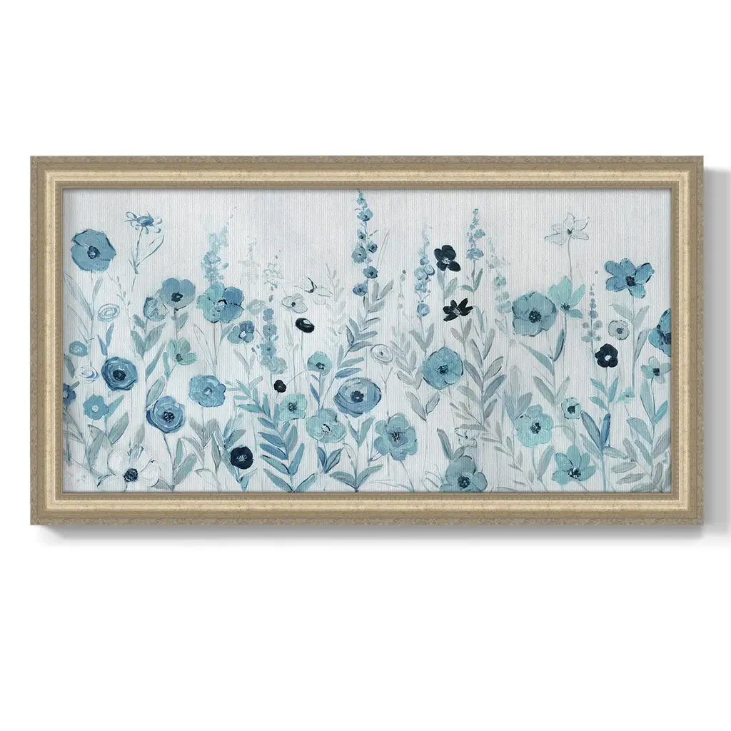 Endless Field of Blue Premium Framed Canvas- Ready to Hang A Premium Framed Canvas created to last. Framed in distressed wood and available in an array of sizes and colors Featuring a beveled a solid wood stretcher bar, each piece comes ready to hand 3 SIZES AVAILABLE 21''X37'' - Overall Size 25''X45'' - Overall Size 29''x53'' - Overall Size Each piece is made to order. Each piece comes with hanging hardware. Made in the USA Ready to Hang Giclee Paper Print Acrylic Glass Beveled Matt Board