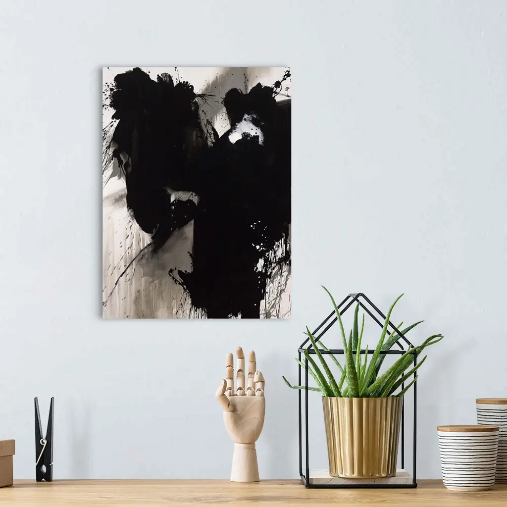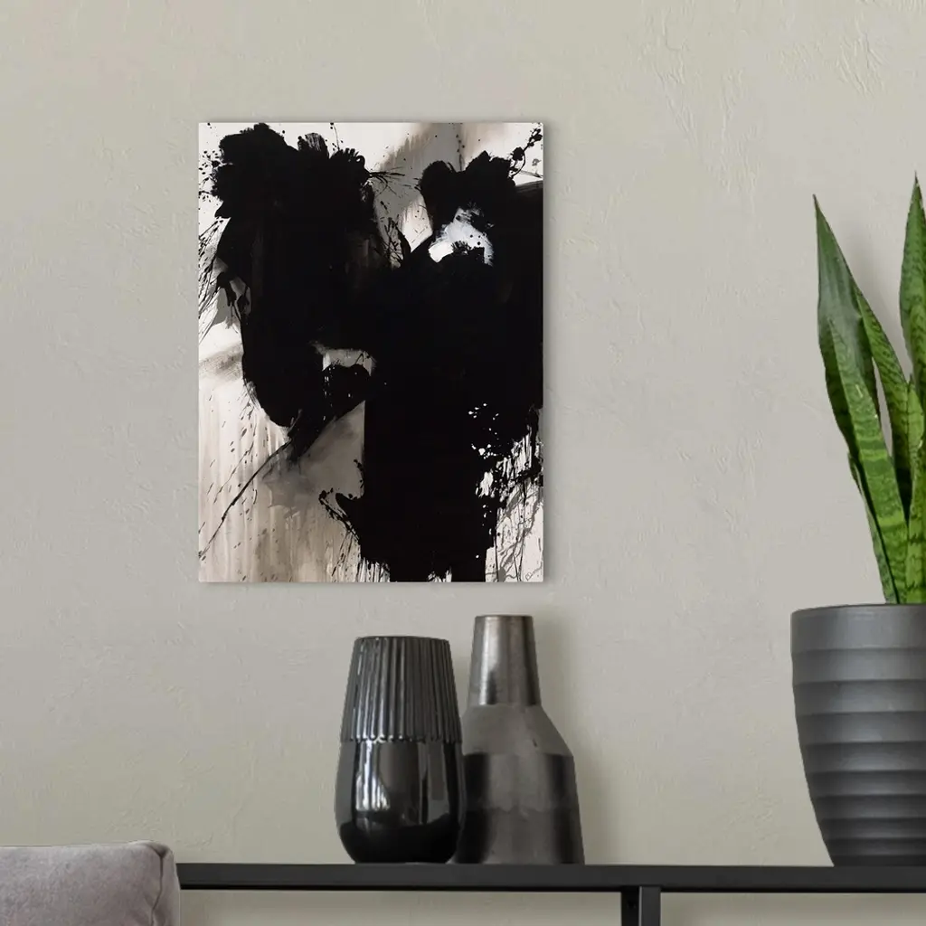 Contemporary abstract painting of a giant black splash of paint smeared and splattered against a neutral background.