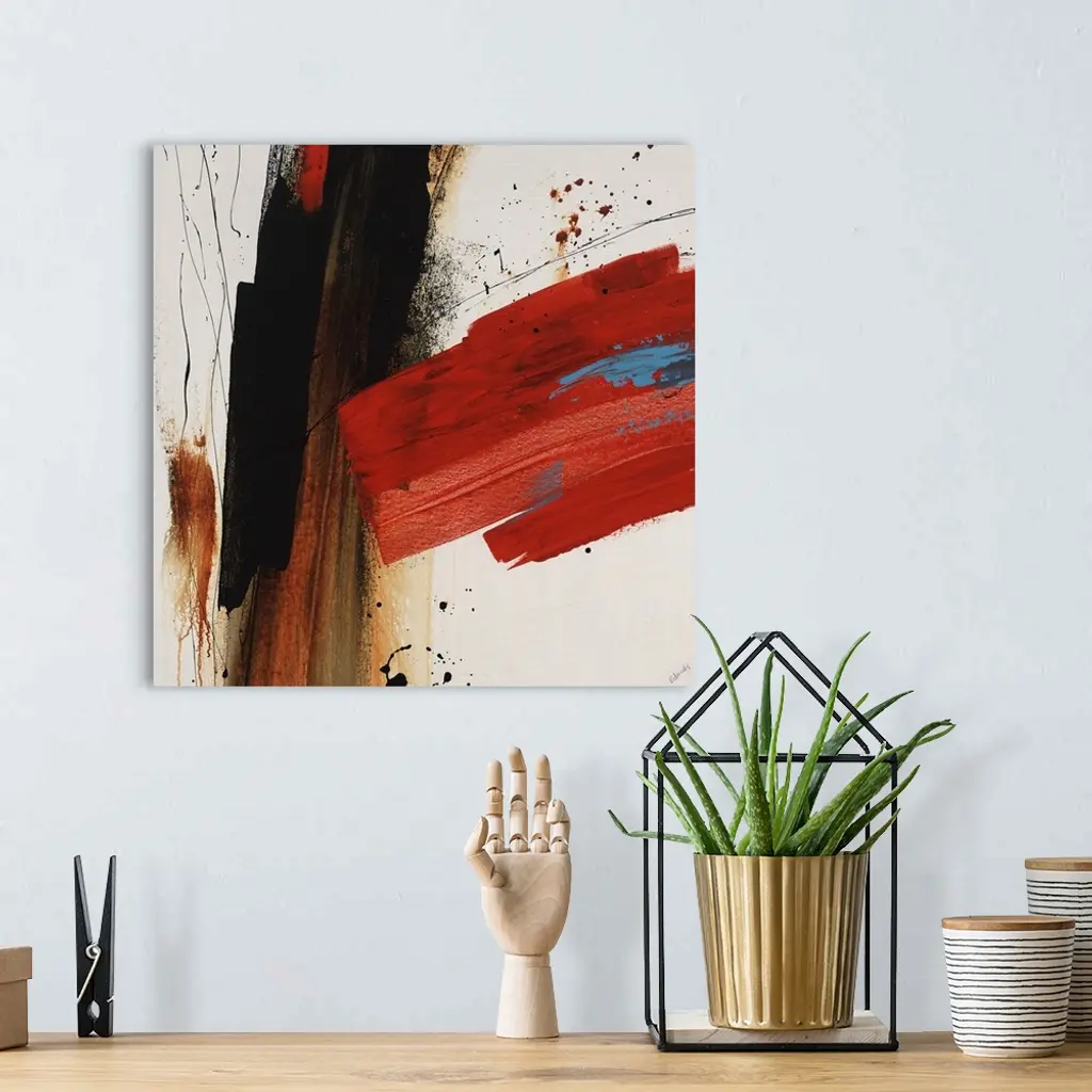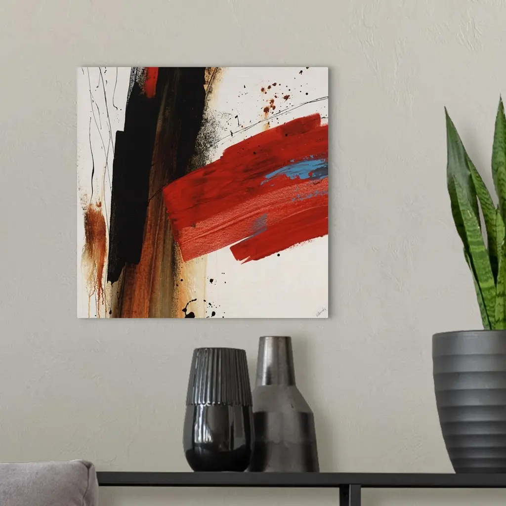 Abstract painting of several large streaks and lines in various thicknesses and directions, painted with bold contrasting colors, on a light, neutral background.