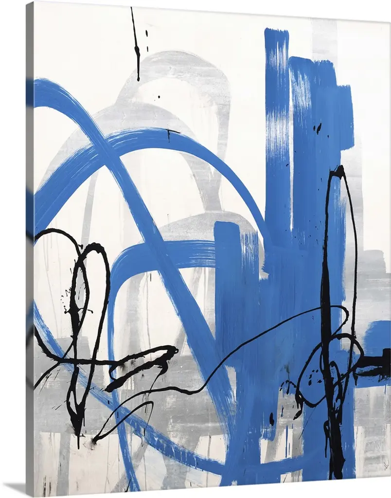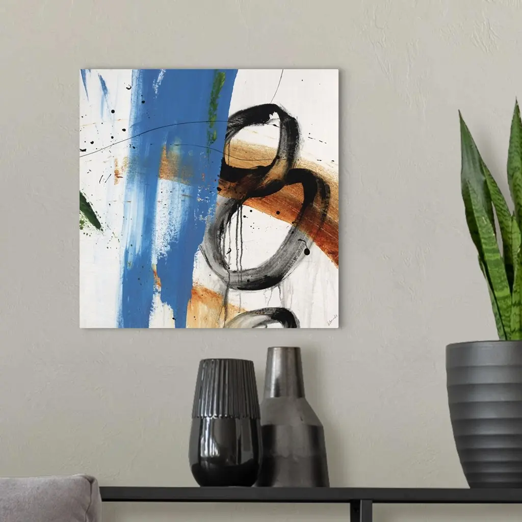 Abstract painting of several circular shapes and lines in various thicknesses and directions, painted with bold contrasting colors, on a light, neutral background.