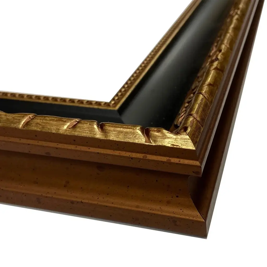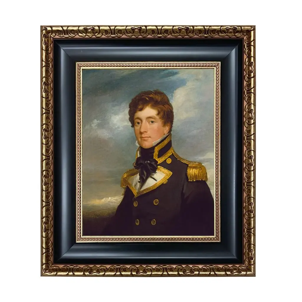 English Naval Officer Captain Frederick William Beechey, wearing captain's full-dress uniform, painted by his brother George Duncan Beechey (1798-1852). The image is printed on canvas, mounted to a board and treated with a historic looking varnish. The frame is black and antiqued gold resin. The back is finished with craft paper and a wire hanger. Made in the USA. • Painting: 11" x 14" • Finished frame size: 17" x 20" • Frame width: 3-1/4" • Frame thickness: 2"