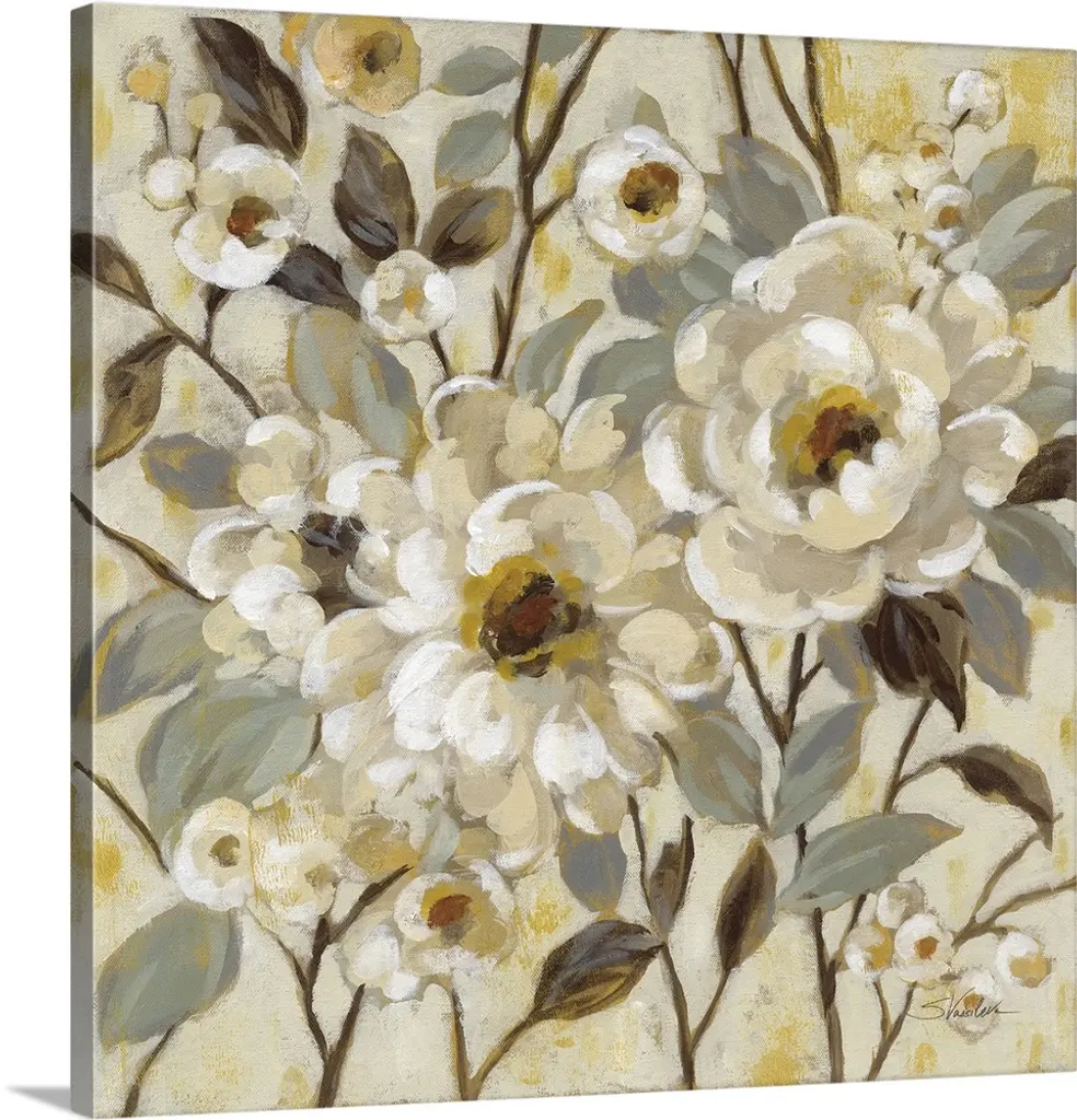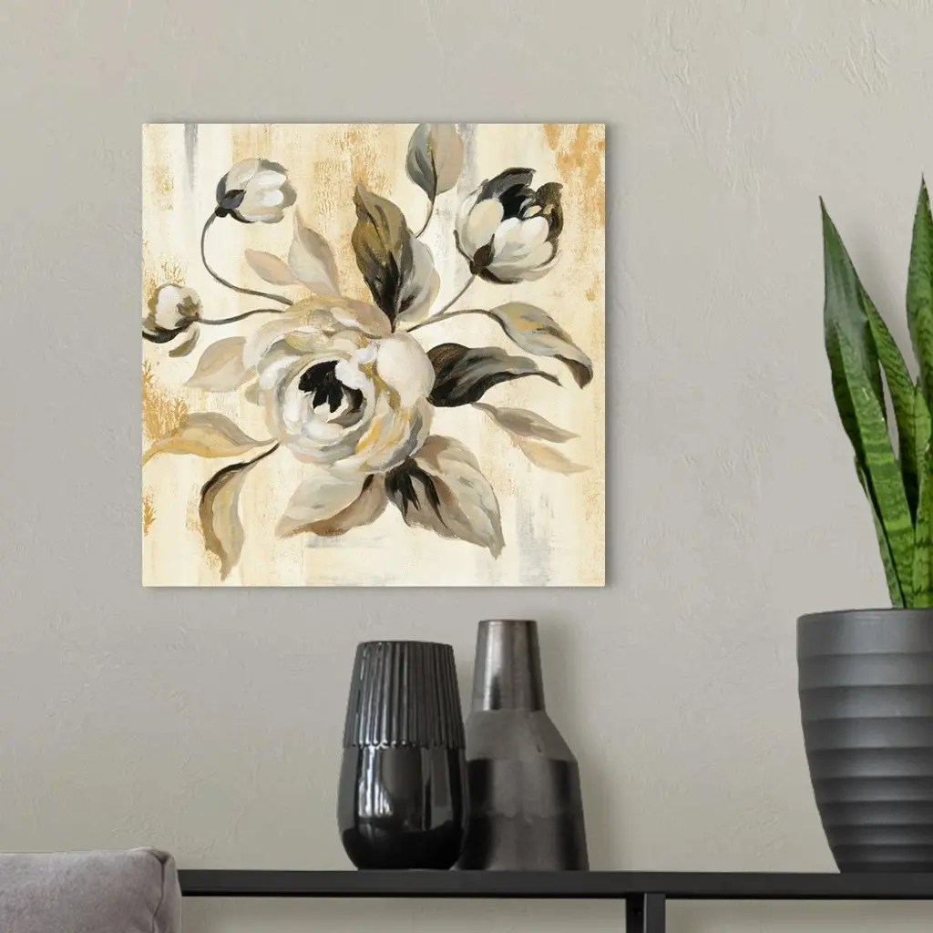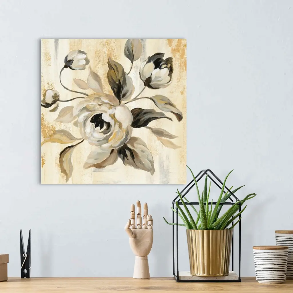 Square painting of white English Roses on a beige and brown background with metallic gold markings.