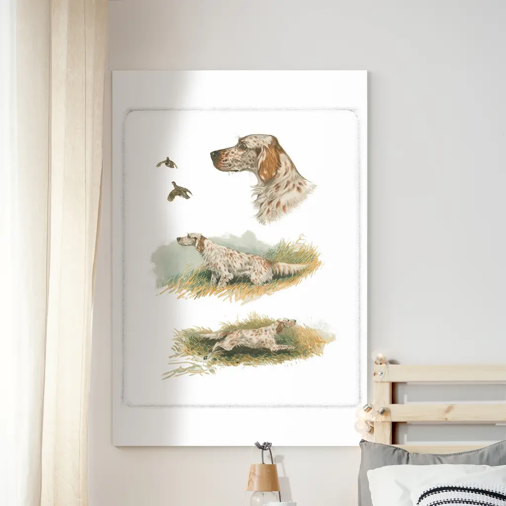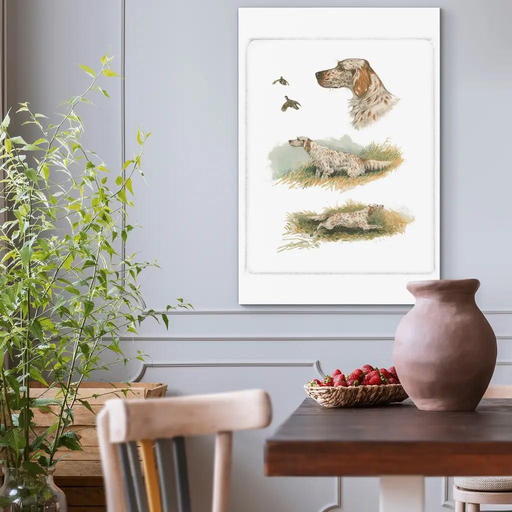 English Setter -Premium Gallery Wrapped Canvas - Ready to Hang A premium hand stretched gallery wrapped canvas print created to last. Featuring a beveled a solid wood stretcher bar, each piece comes ready to hand 5 SIZES AVAILABLE 8''X12'' - Overall Size 16''x20'' - Overall Size 18''x27'' - Overall Size 24''x36'' - Overall Size 32''x48'' - Overall Size Each piece is made to order. Built to Last Each piece comes ready to hang Solid wood stretcher Fade and Water resistant Made domestically