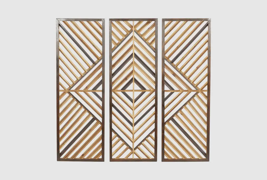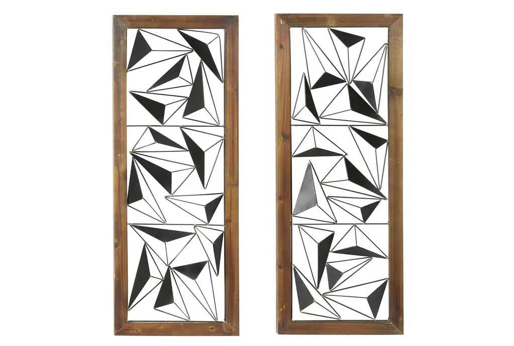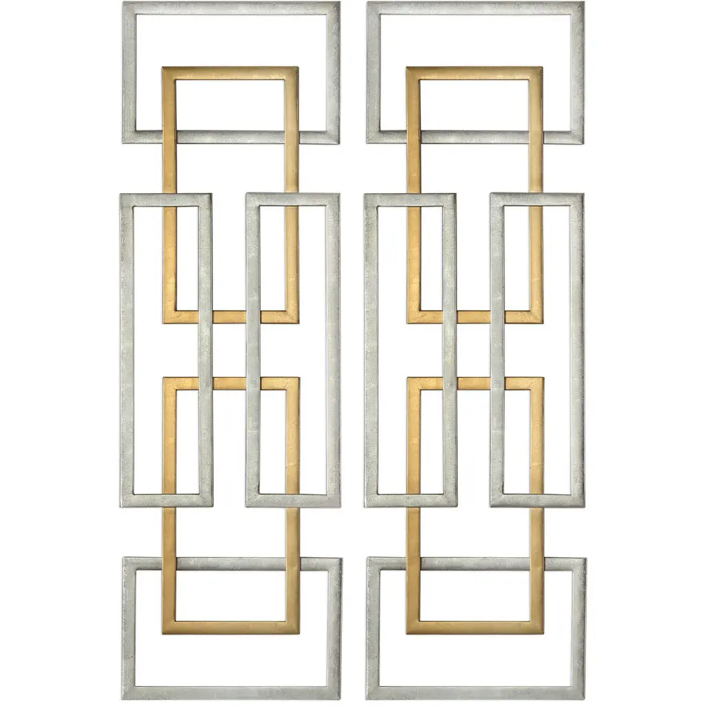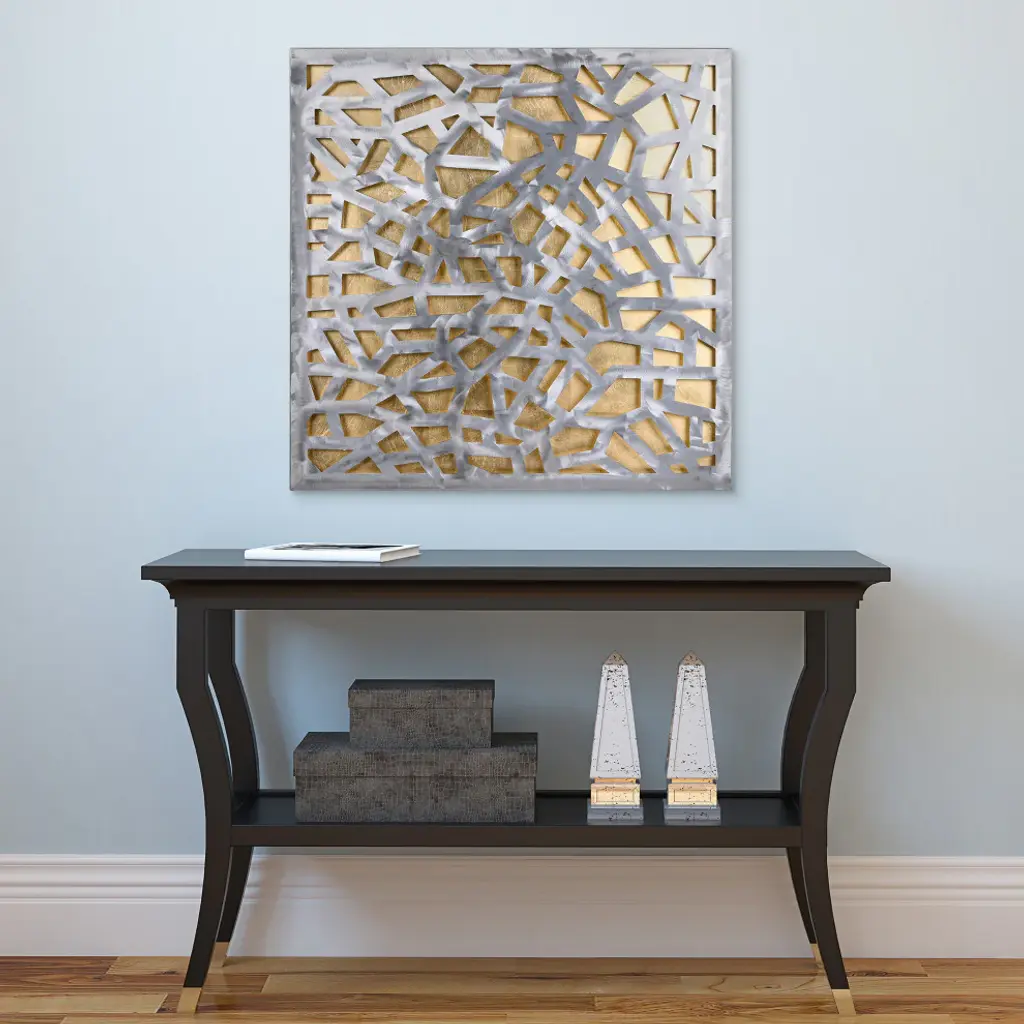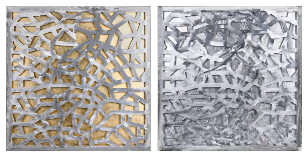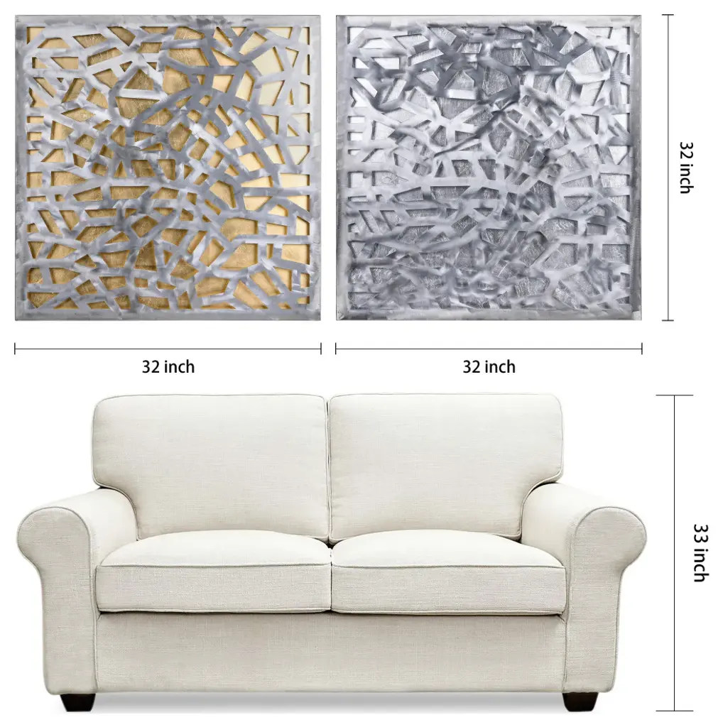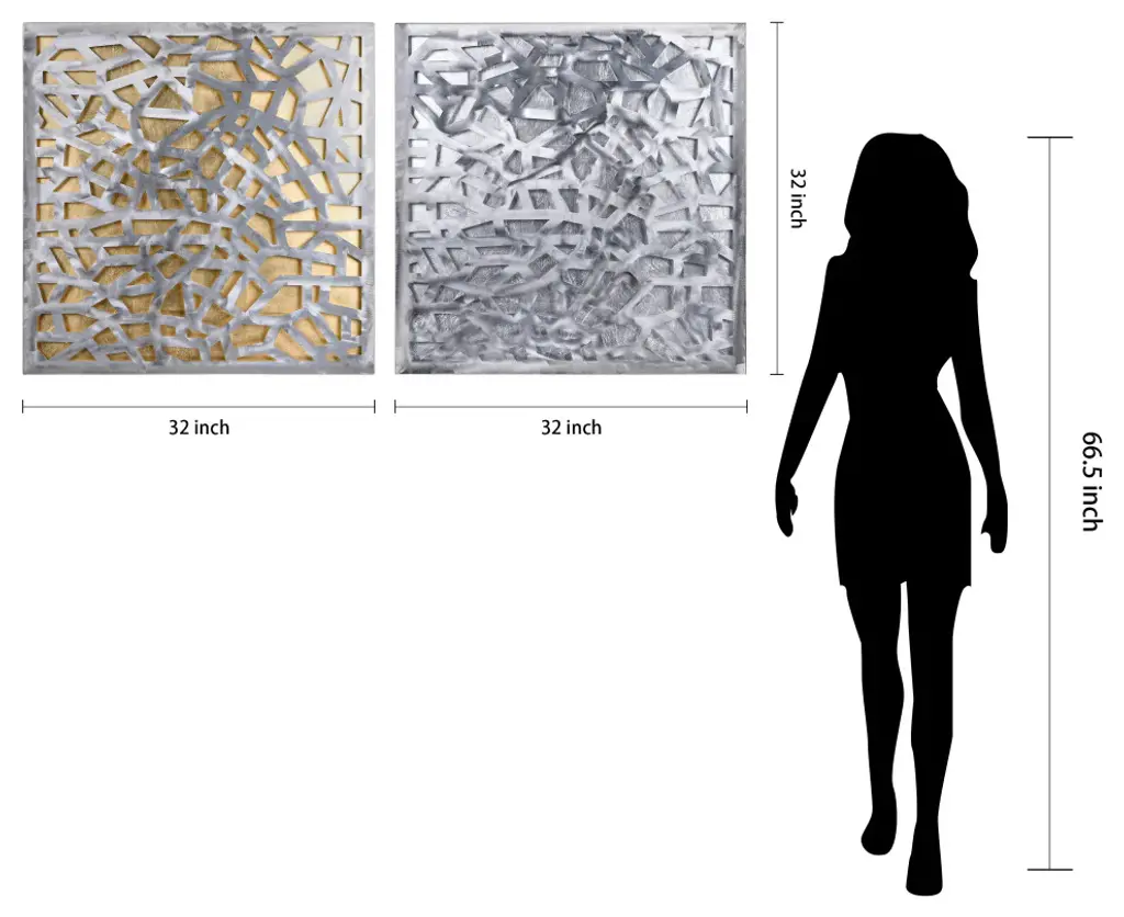 Diptych Set - 32" x 32" x 0.98" each piece. Made of brushed and polished steel, this high quality and unique piece displays an abstract pattern the viewer could get lost in. Positioned approximately 1"� behind the pattern is hand applied gold leaf squares to contrast the silver polished steel of the abstract design. The order one is hand applied silver leaf squares to complement the silver polished steel of the abstract design. They are desirable for any room wanting a unique and industrial feel. Comes with 2 pre-attached hooks on the back for each piece, ready to be mounted, providing for easy, stress free installation.