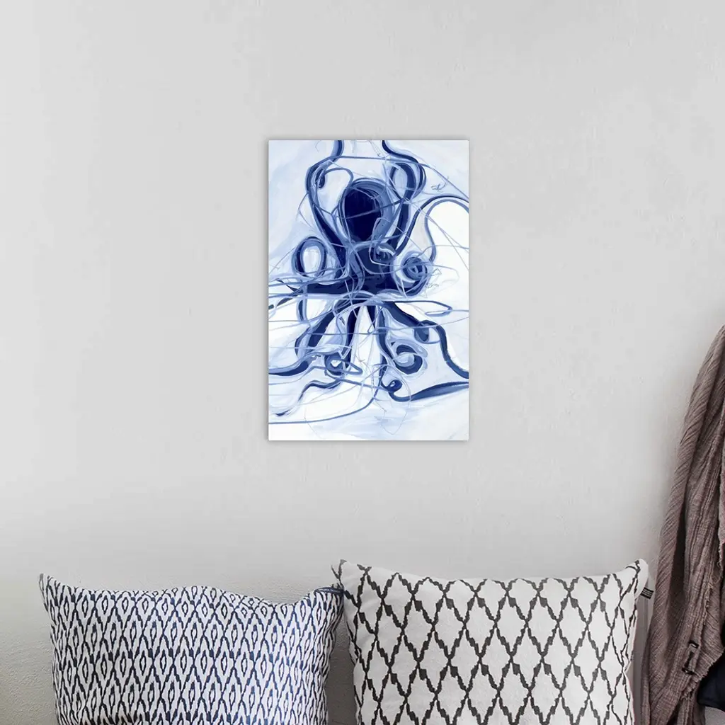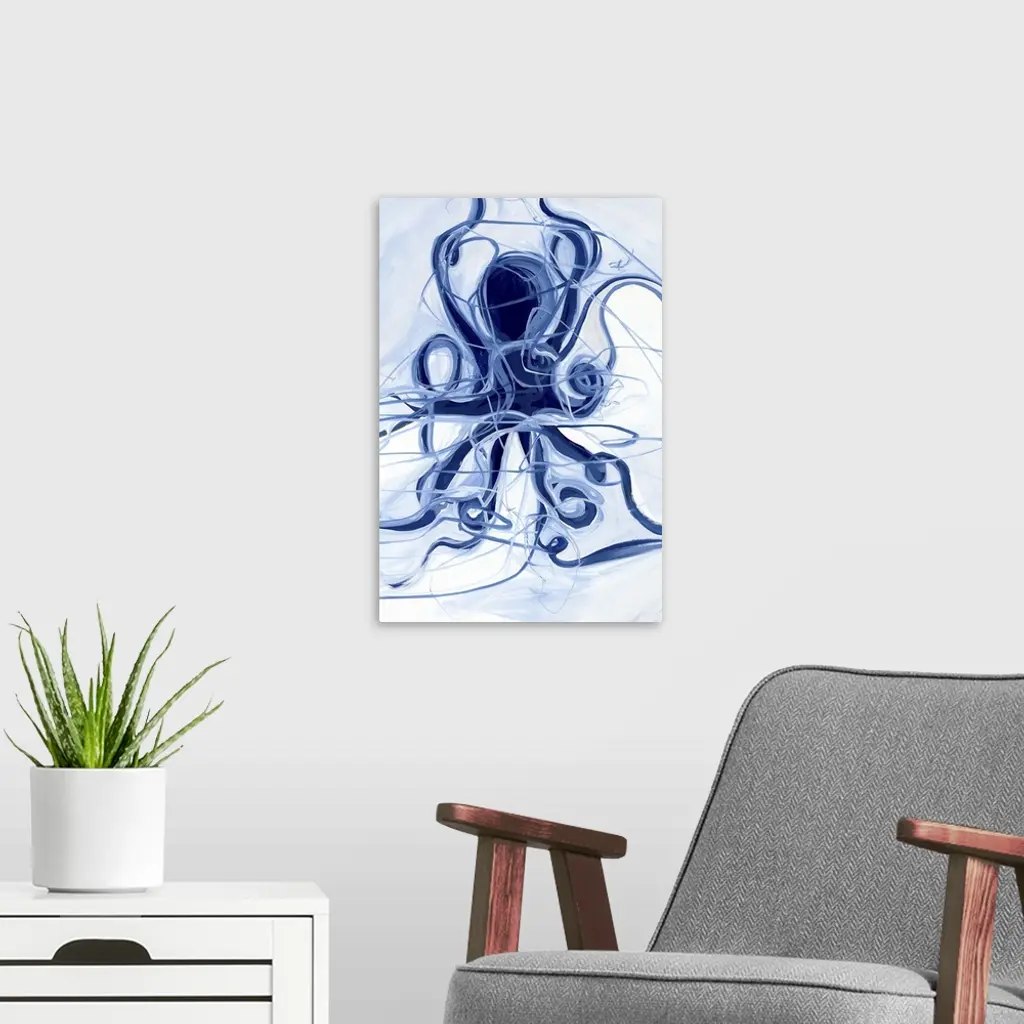 A contemporary abstract painting of a blue octopus with swirling tentacles and other swirling lines against a pale blue and white background.
