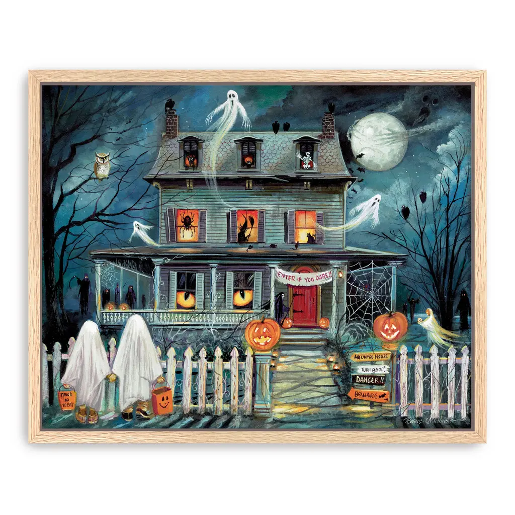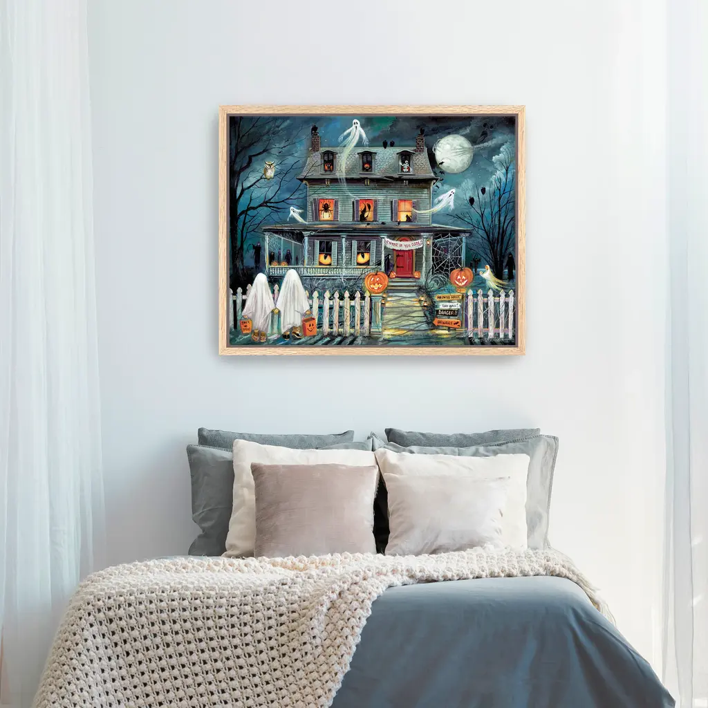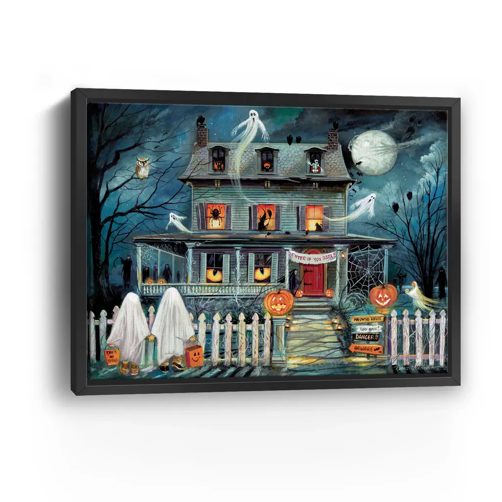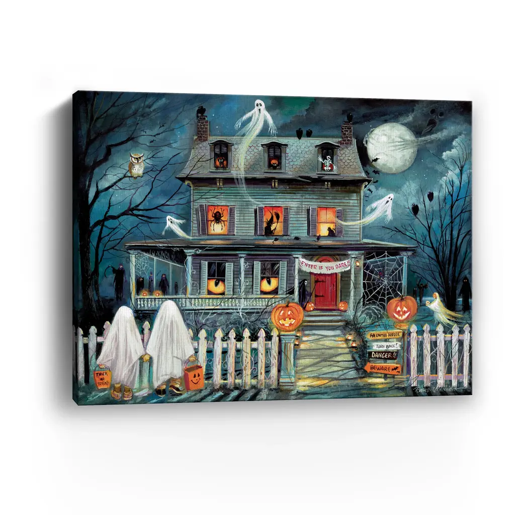 This eerie haunted house canvas captures the spirit of Halloween with shadowy silhouettes and glowing orange windows. Rich hues of midnight blue, charcoal, and pumpkin spice create a chilling yet captivating focal point for your seasonal decor. Our Gallery Wrap Canvas Prints are proudly assembled with high quality materials in California, USA. Each piece is printed on a thick, archival grade canvas using Giclee technology. It is then hand-stretched by our experienced artisans over solid wood bars, which will not warp over time. The final product is a piece personally crafted for you to confidently display on your wall. Care and Assembly: Ensure that the location of your piece has little to no exposure to heat, sunlight, and moisture. Wipe clean, only if needed. Each piece includes hanging hardware to hang on your wall horizontally.