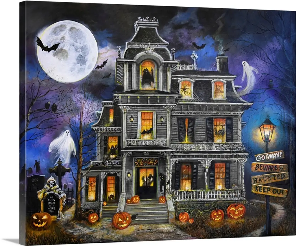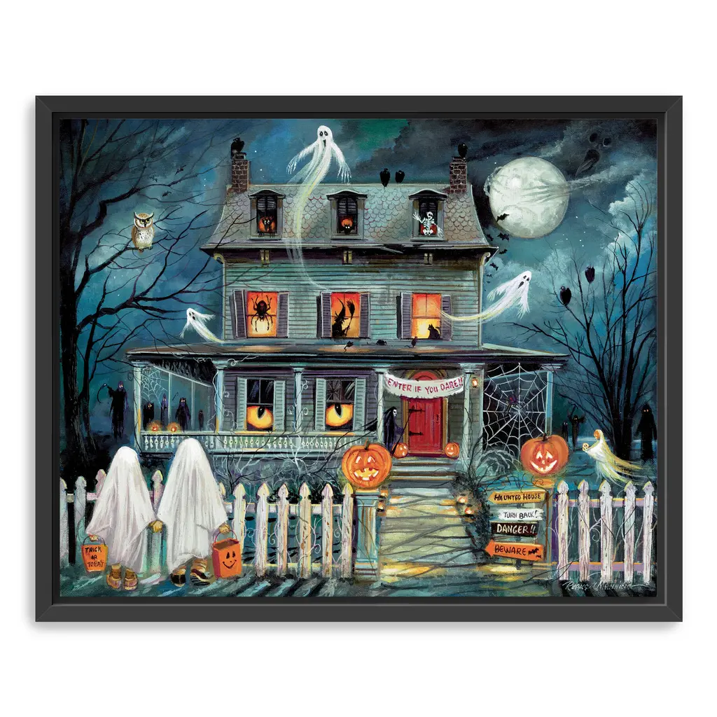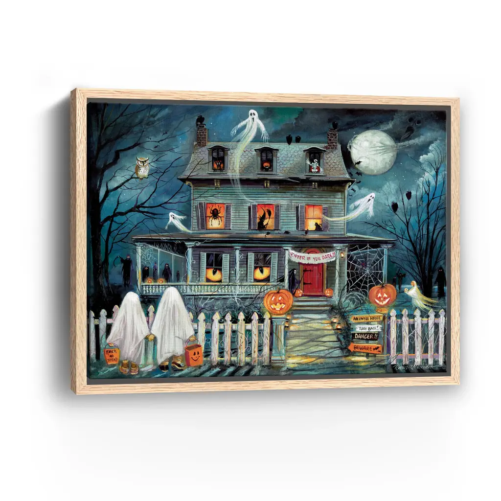 This eerie haunted house canvas captures the spirit of Halloween with shadowy silhouettes and glowing orange windows. Rich hues of midnight blue, charcoal, and pumpkin spice create a chilling yet captivating focal point for your seasonal decor. Our Gallery Wrap Canvas Prints are proudly assembled with high quality materials in California, USA. Each piece is printed on a thick, archival grade canvas using Giclee technology. It is then hand-stretched by our experienced artisans over solid wood bars, which will not warp over time. The final product is a piece personally crafted for you to confidently display on your wall. Care and Assembly: Ensure that the location of your piece has little to no exposure to heat, sunlight, and moisture. Wipe clean, only if needed. Each piece includes hanging hardware to hang on your wall horizontally.