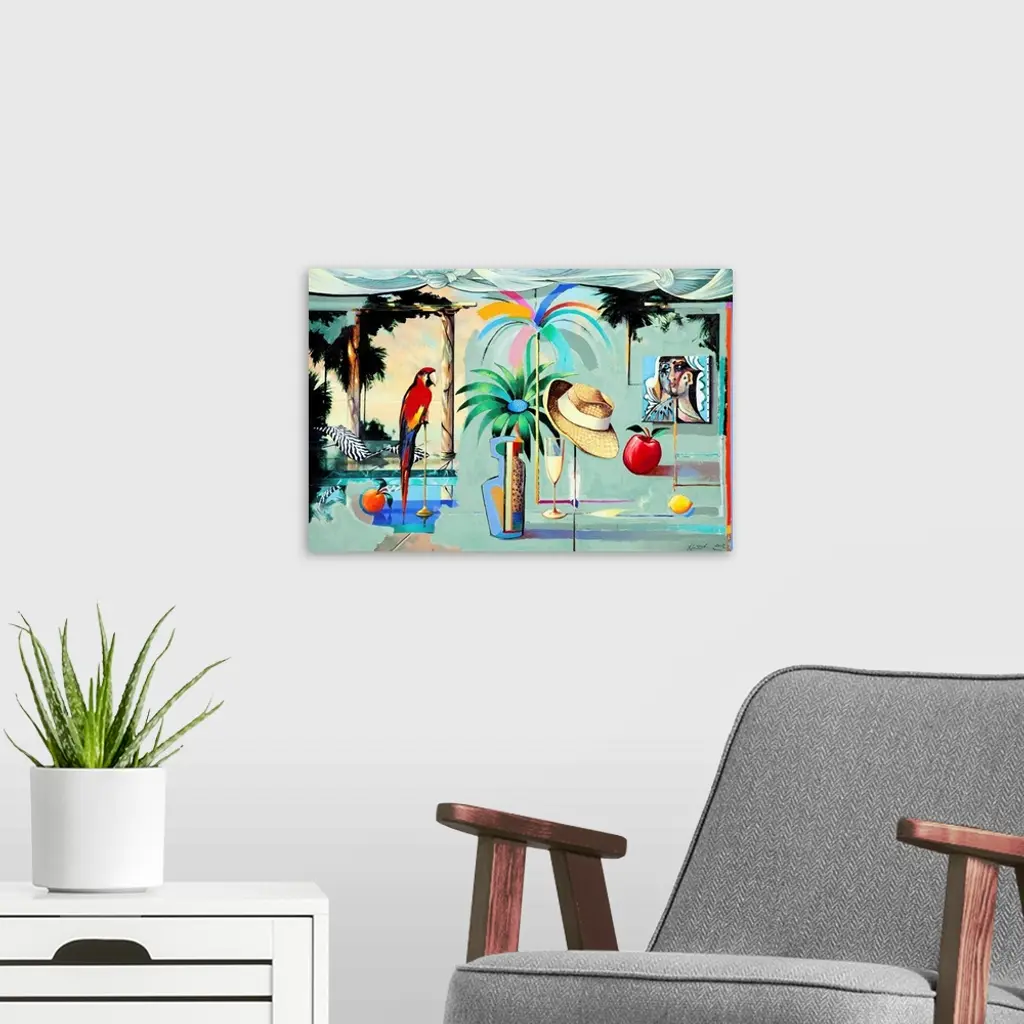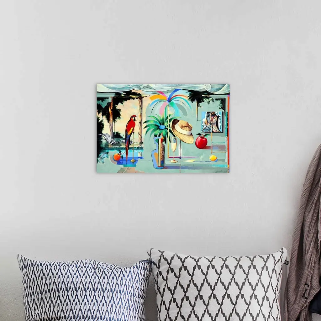 Contemporary painting of the interior of a tropical island bungalow.