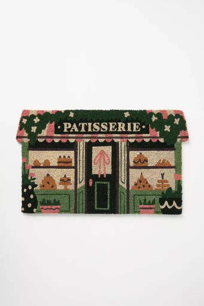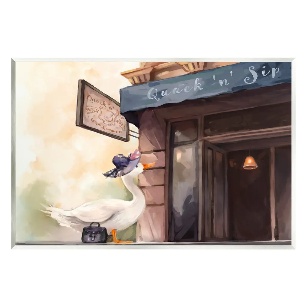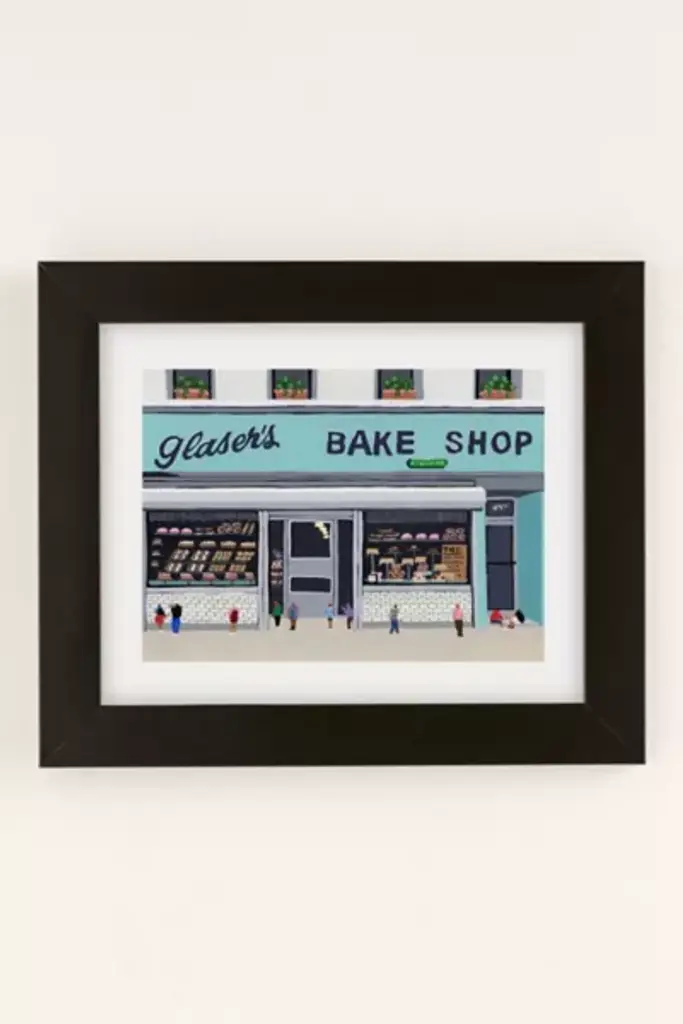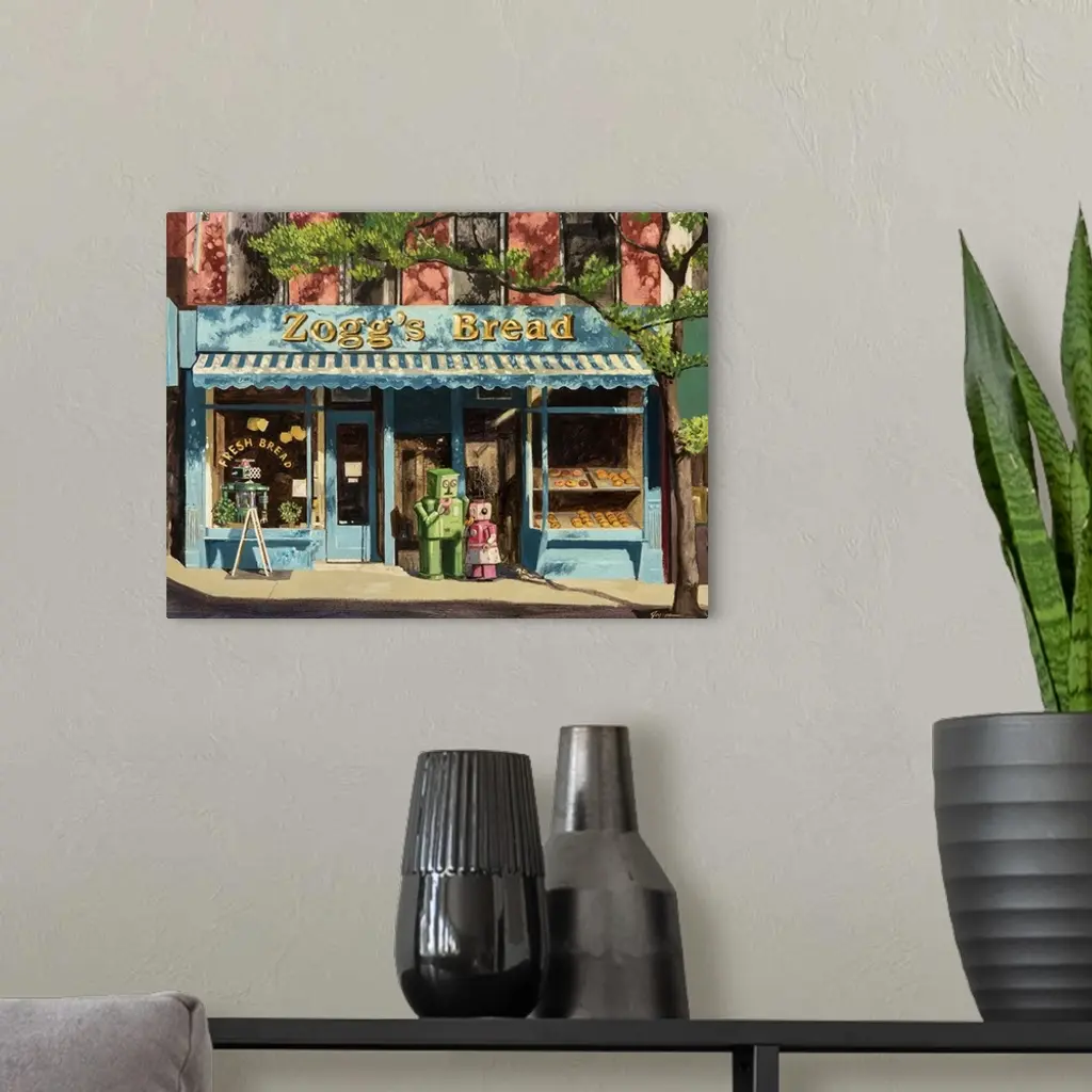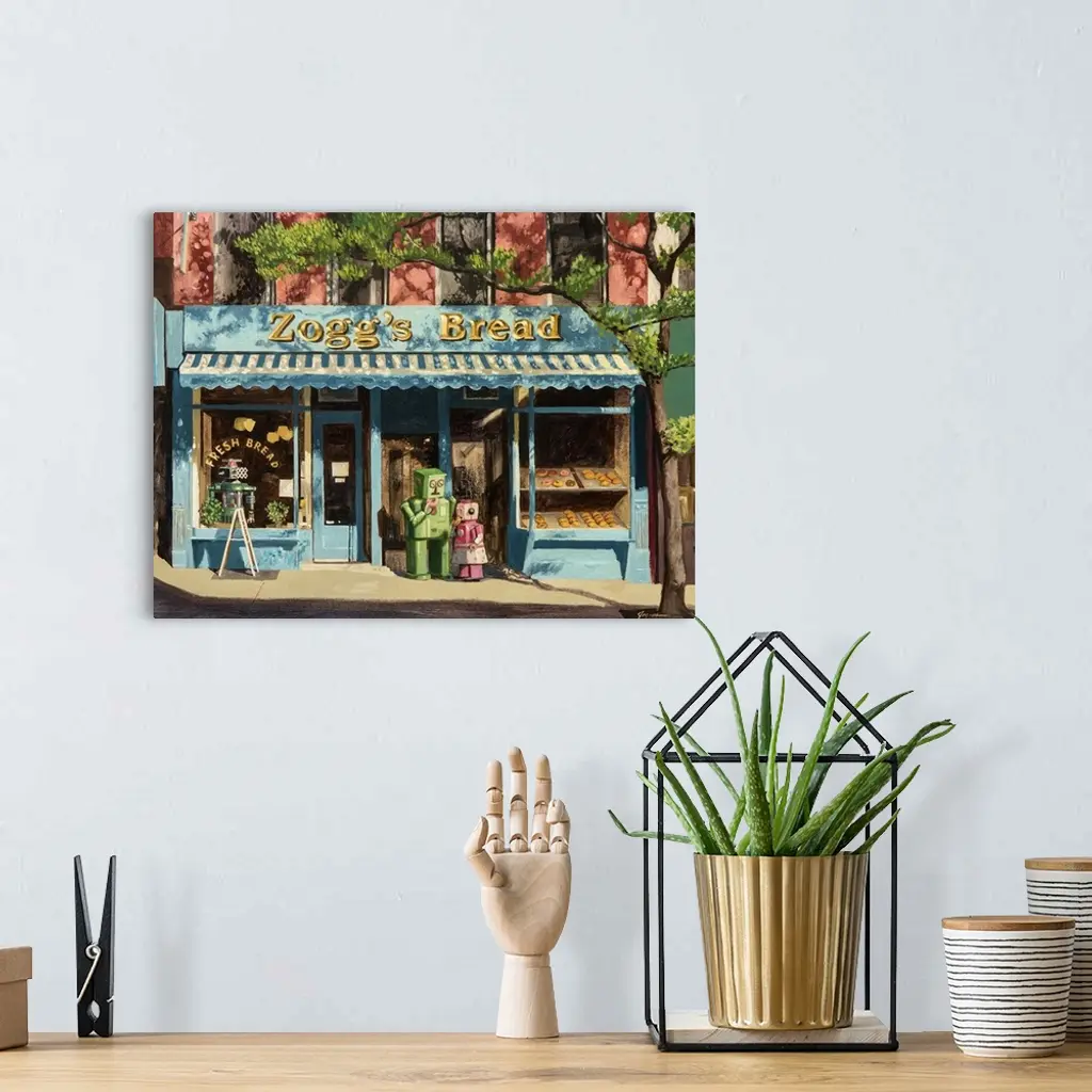 A contemporary painting of two retro toy robots standing out front of a bakery eating donuts.