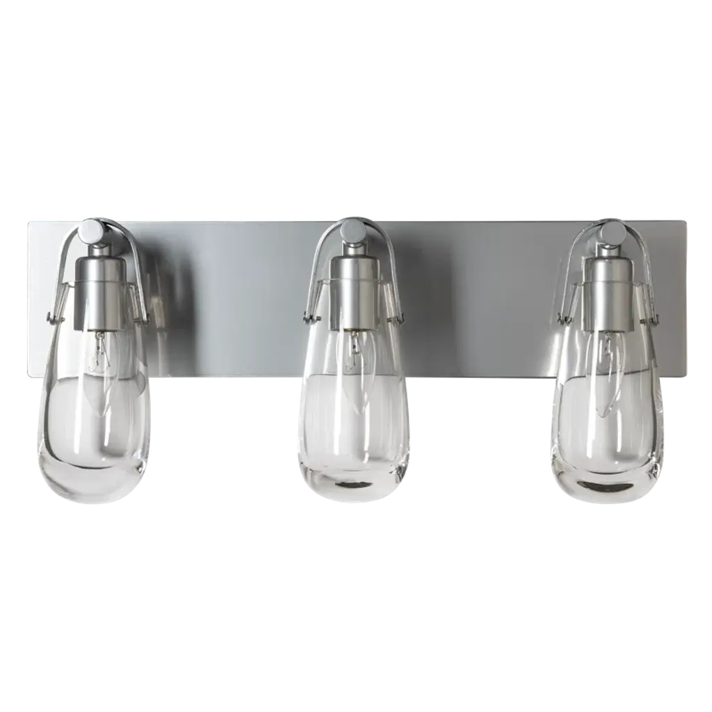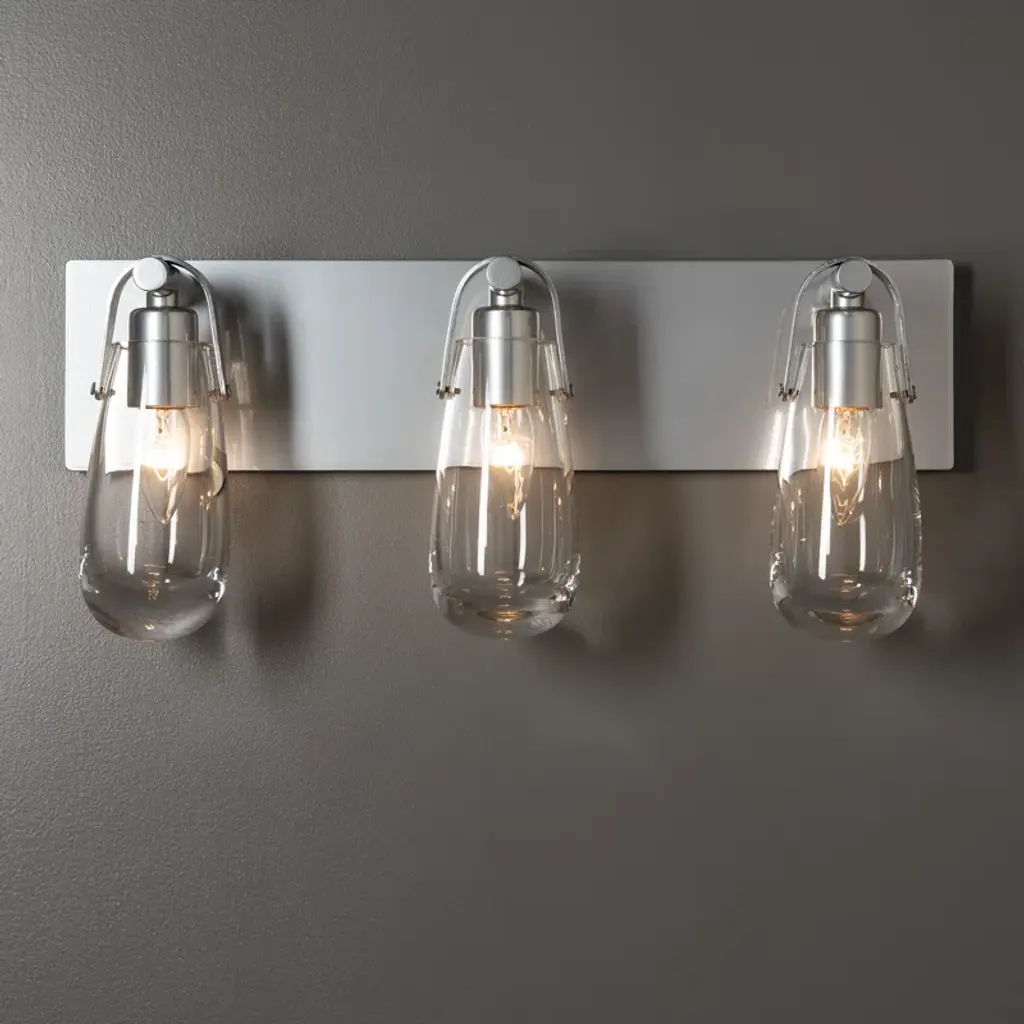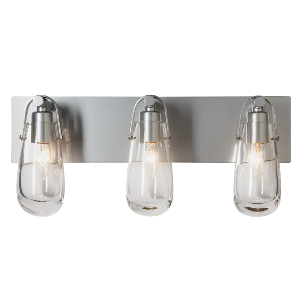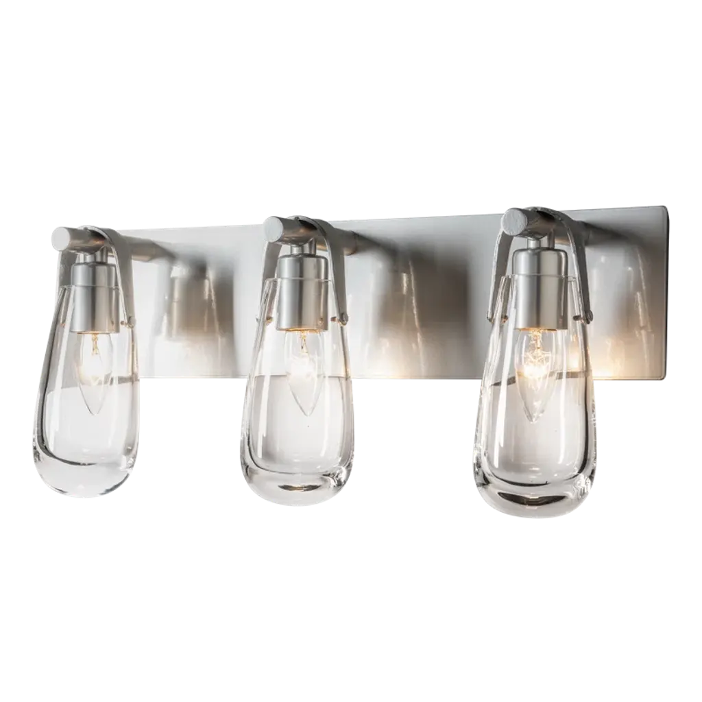 The Eos light is named for its namesake glass, reminiscent of an early morning dewdrop left by Eos, the Greek goddess of dawn. Ideally suited to be placed above the mirror of single or double-bath vanities. U-shaped metal bands are handcrafted by Vermont artisans along with the wall sconce's backplate. All Hubbardton Forge products are handcrafted to last one at a time in Vermont.