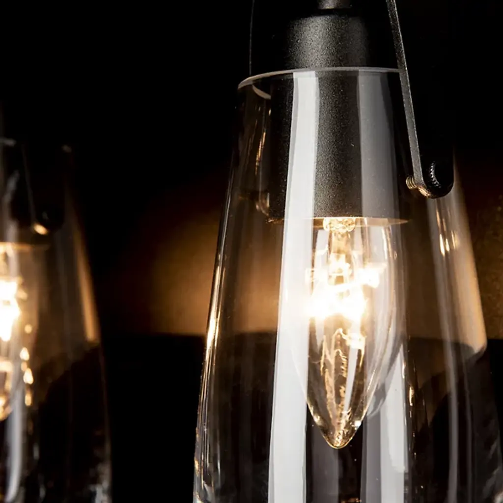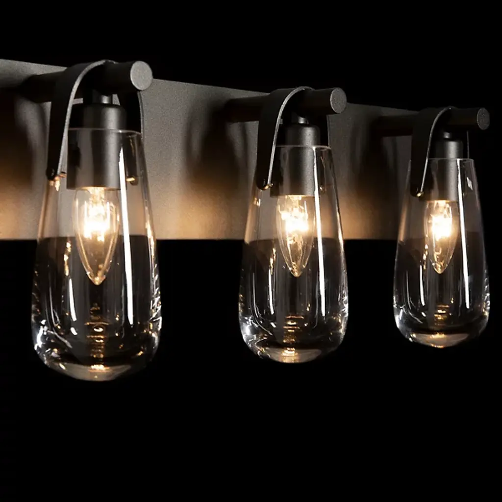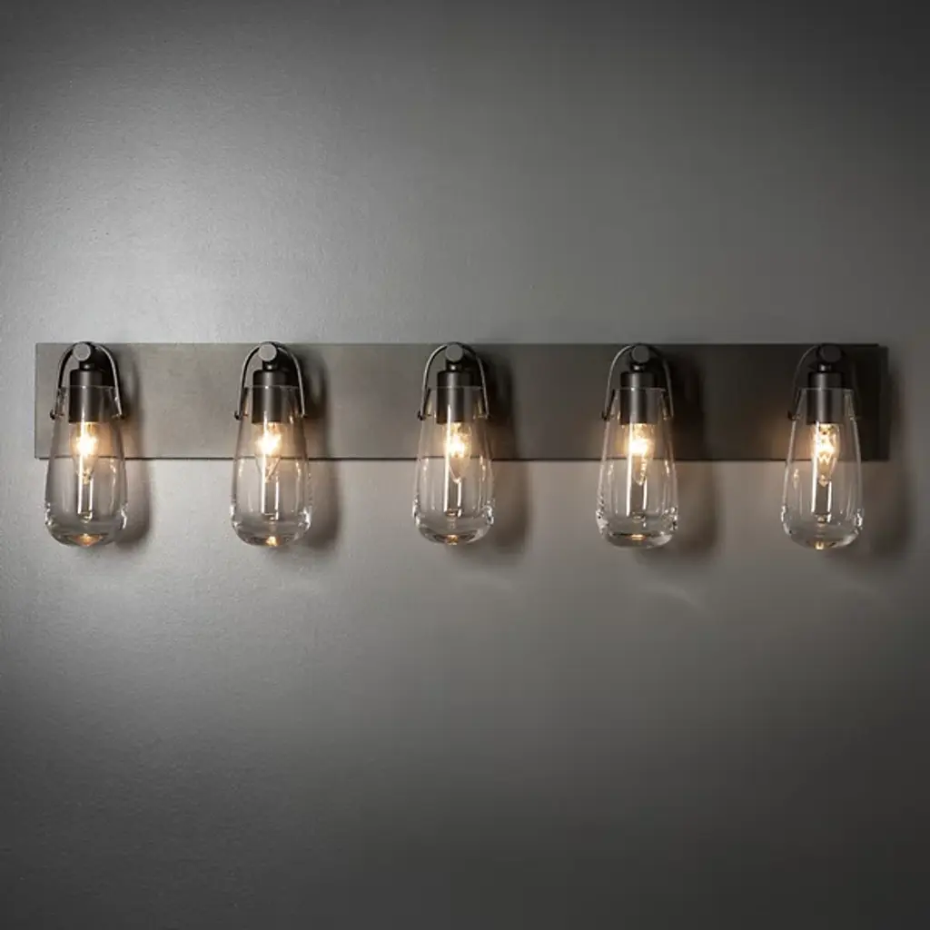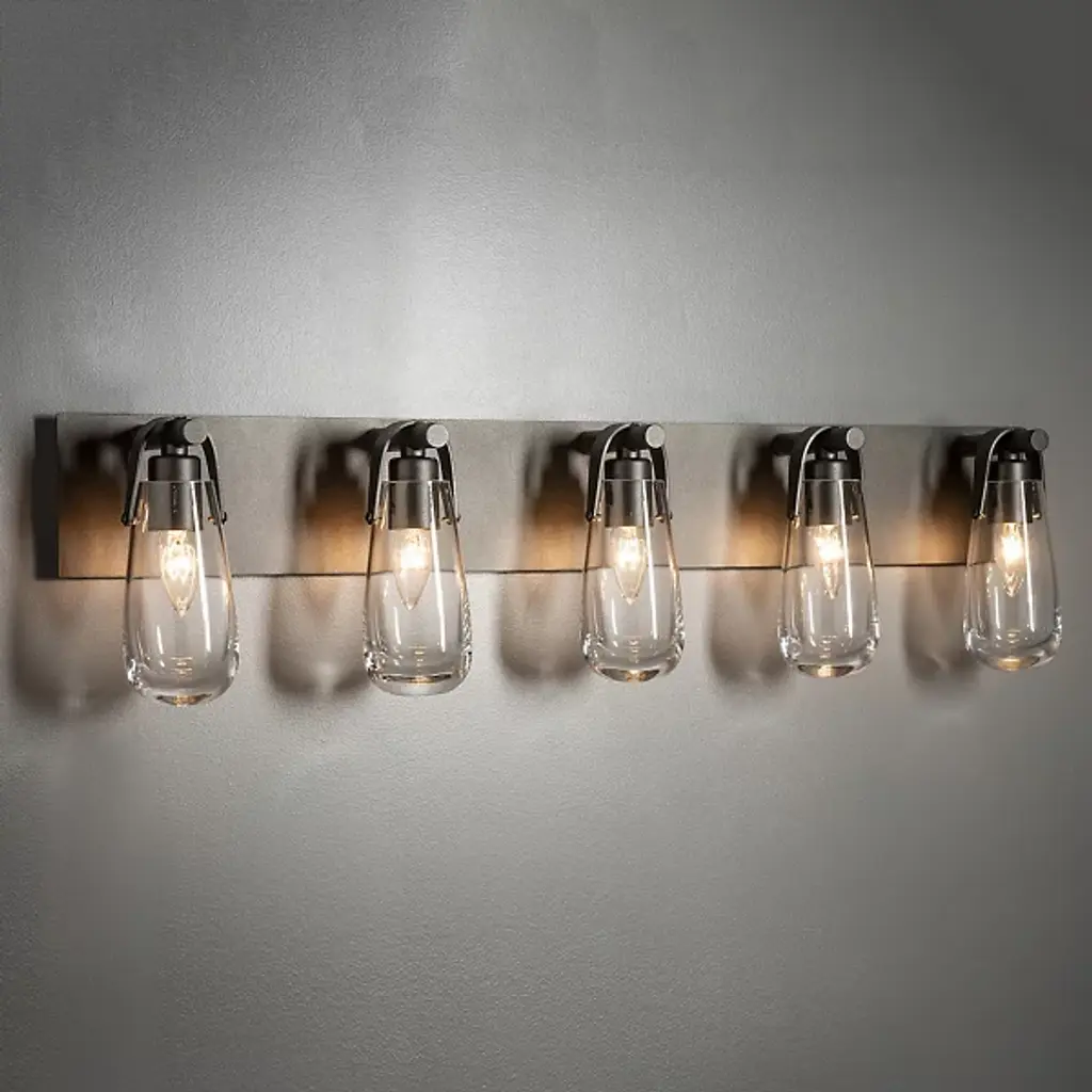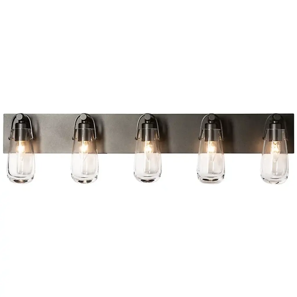 Channel some Greek-inspired design elegance with the Eos 5-Light Vanity Light by Hubbardton Forge. This five-light bathroom wall sconce features five symmetrical dewdrop glass globes that each house a bright light. Each glass globe is held by a metal handle, attached to a short metal bar that juts out from the backing for support. If you look closely, it may seem like the light is dripping off its backplate. Mount this vanity light horizontally or vertically in your bathroom for vivid illumination.