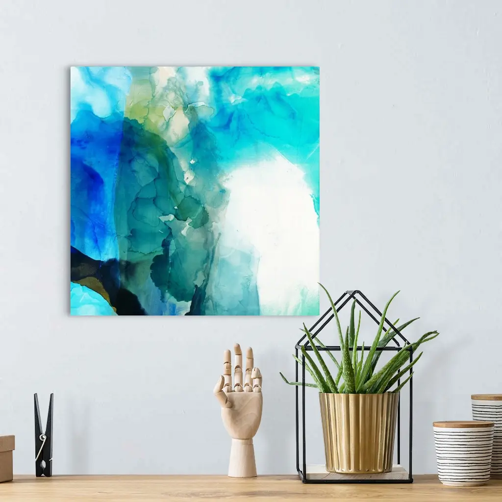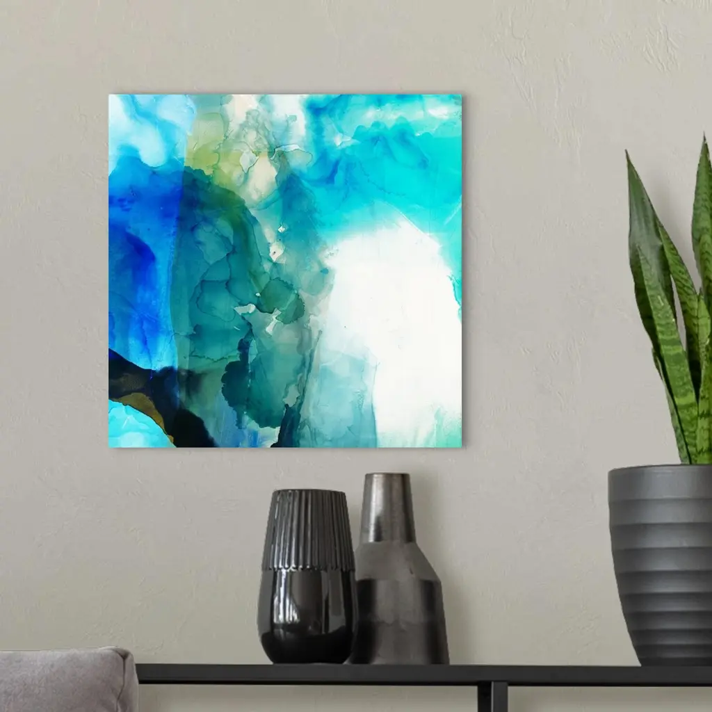 Abstract painting in varies shades of blue overlapping and blending together.