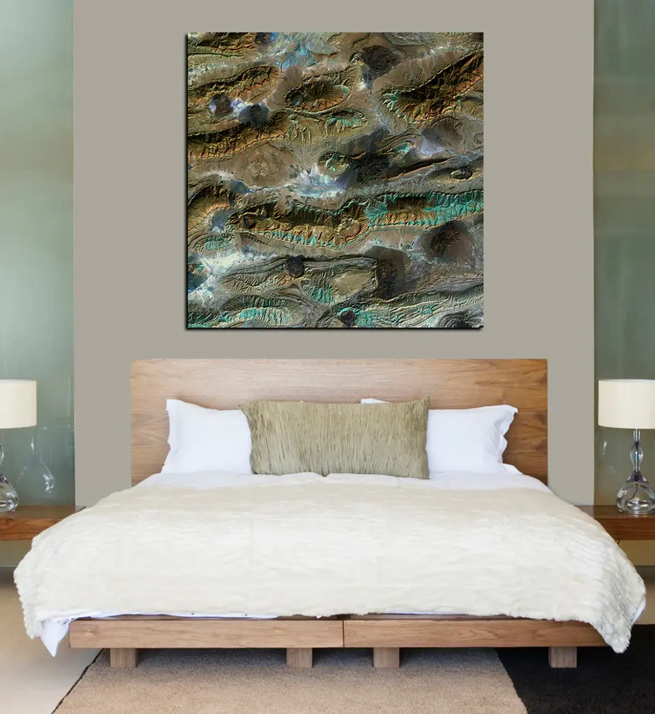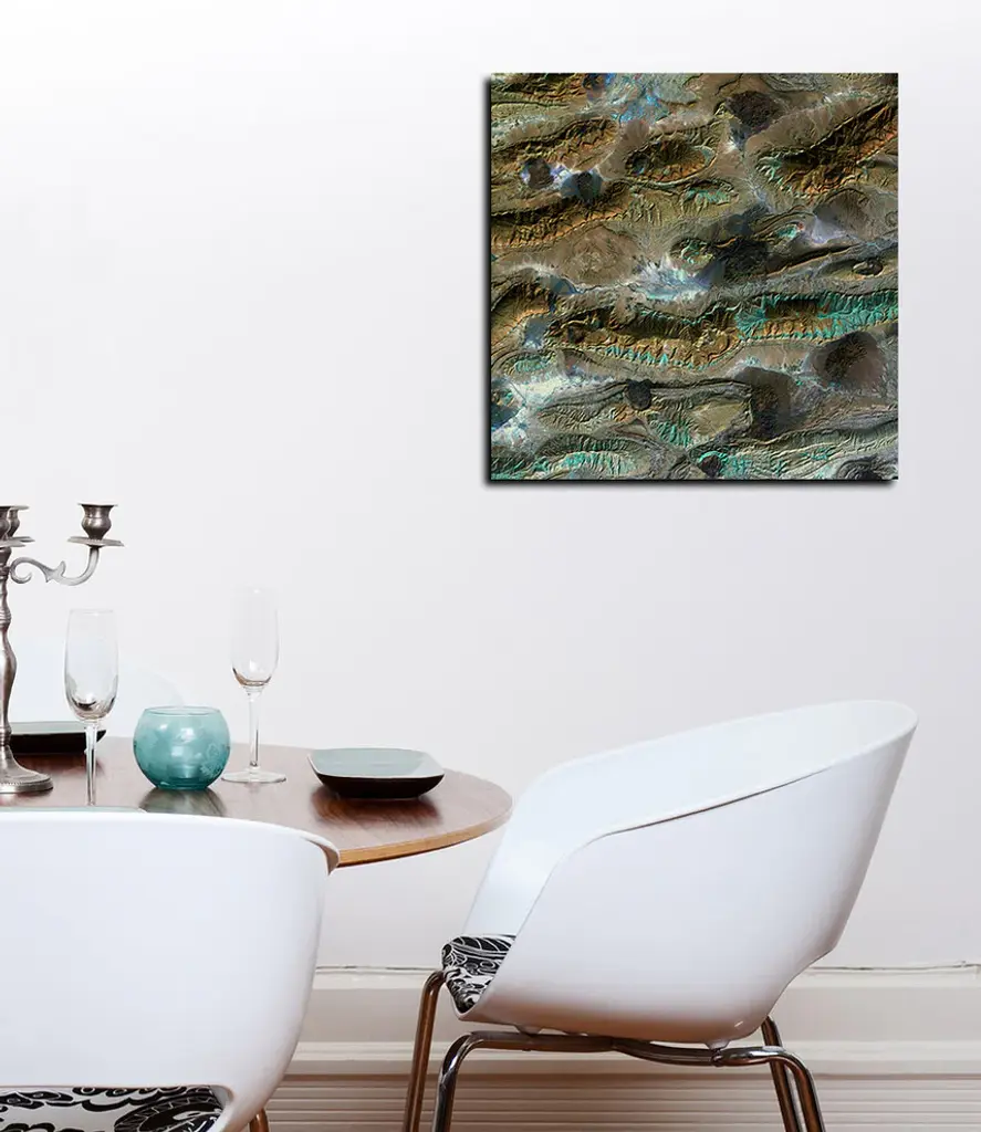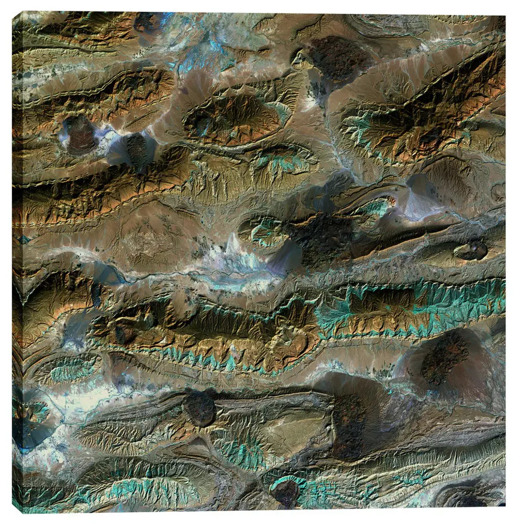 "Salt Glaciers" from the Earth as Art series. Featuring the patina-like aqua outline of the Zagros Mountains, interrupting the mountain patterns are dark patches called salt glaciers, what once were salt domes buried underneath the rock has pushed itself up through the earth revealing themselves. The Earth as Art series comes from NASA which showcases satellite images of our planet and celebrates Earth''s natural beauty in the shapes,colors, and textures of our land and oceans. Courtesy NASA/USGS/EROS