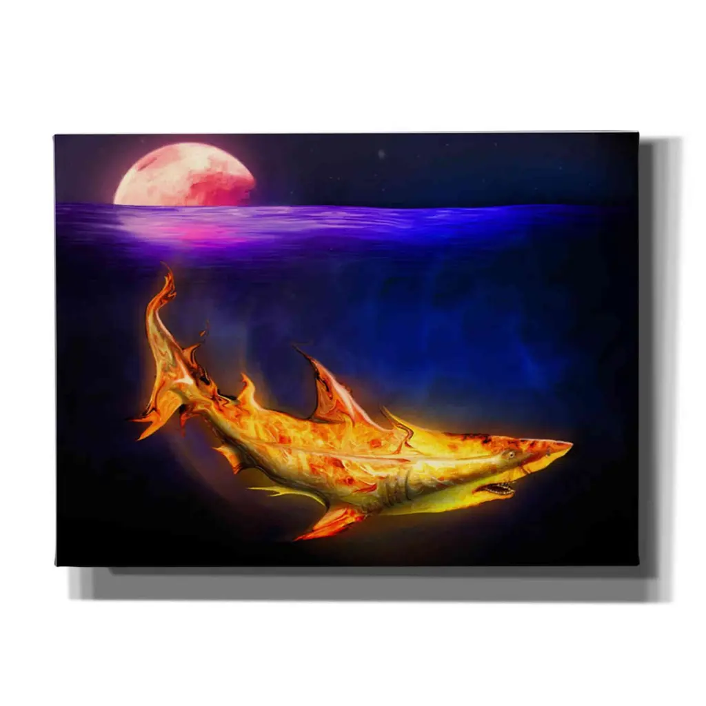 "Mako Shark" by Michael Stewart. Stewart is a neo-gothic, surrealist artist who?s come to be known as ?Pyropainter.? And with good reason. His process begins by starting a controlled fire and taking photographs of it. Once a sketch is formulated on a photo manipulated program, he uses acrylics to paint the final product. By observing the fire formations in each image, he reimagines them as gothics and demon from a different, yet close world. What a new perspective on the fiery element! Dimensions: 16"W x 0.75"L x 12"H