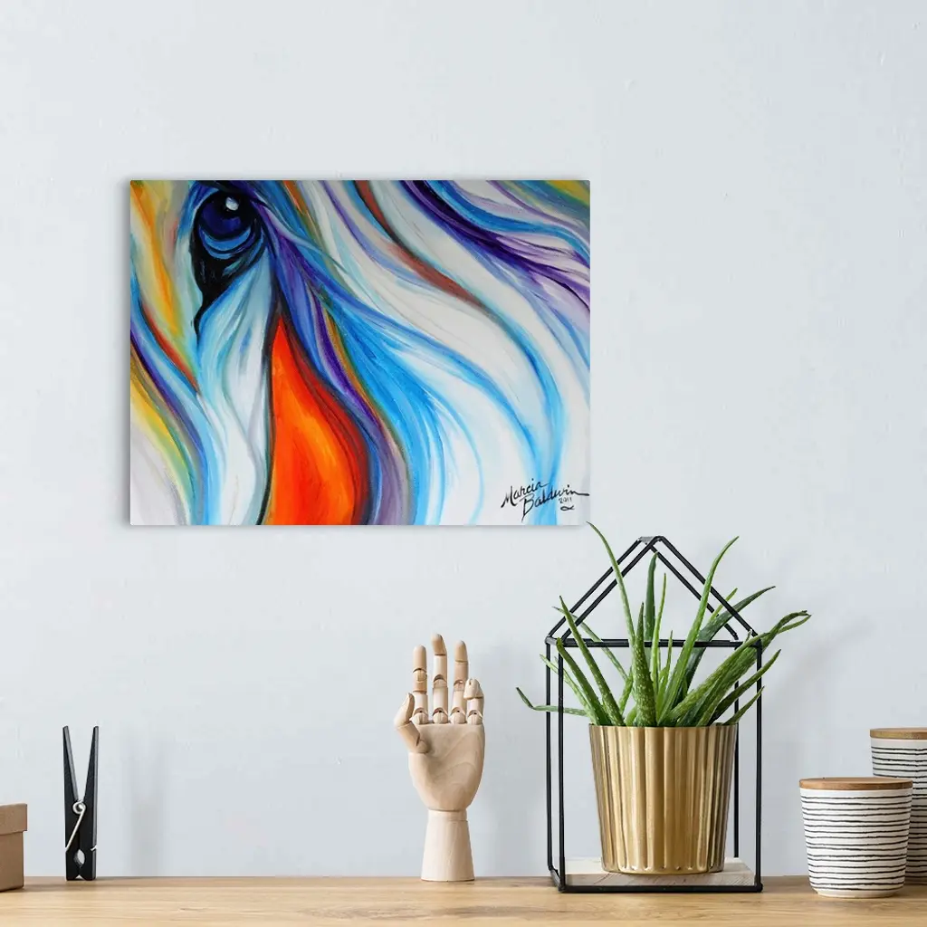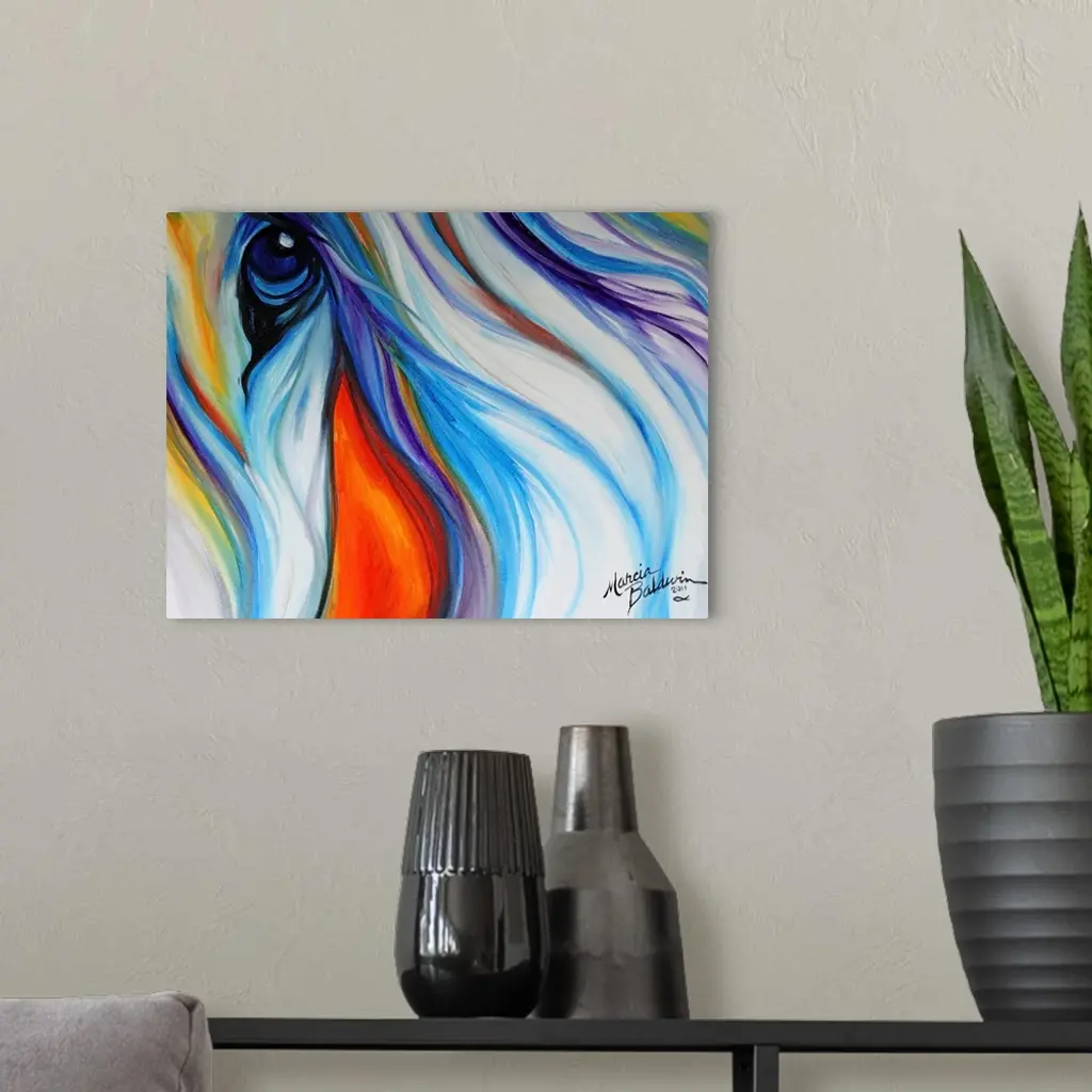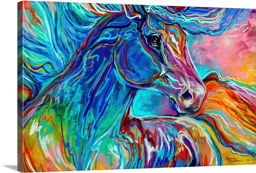 Colorful painting of a horse close-up with a flowing mane and compassionate stare.