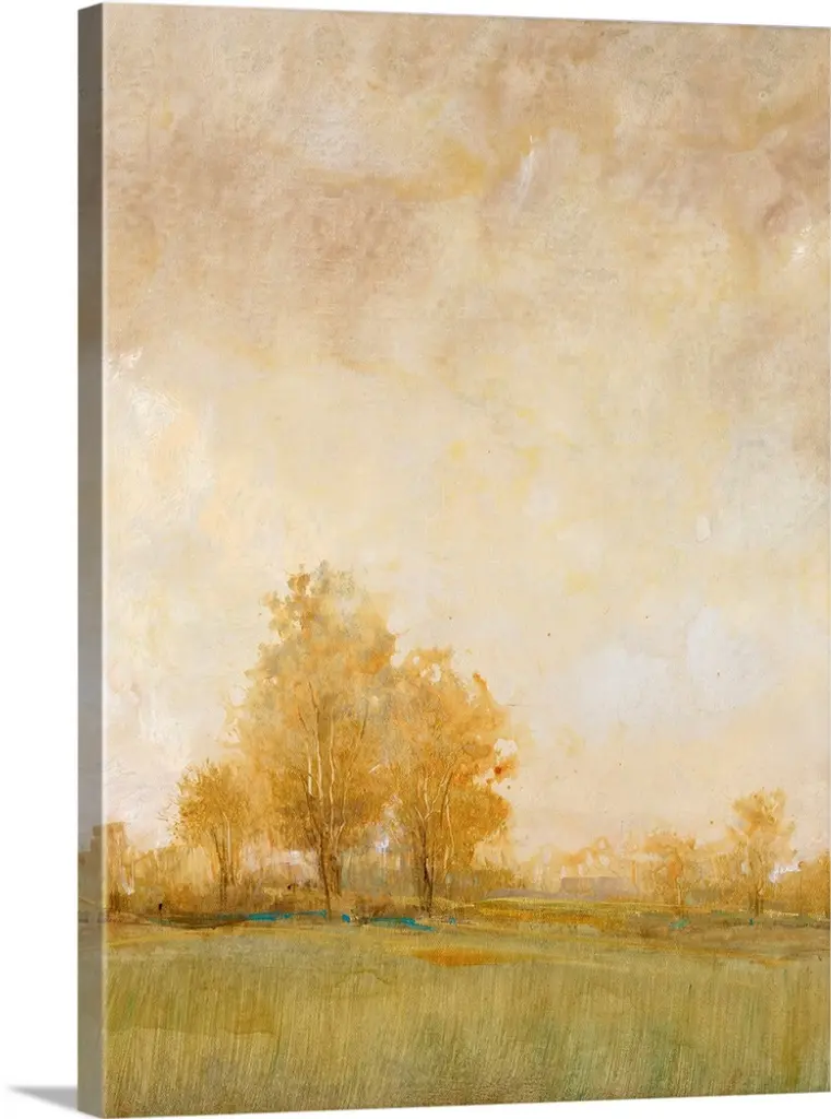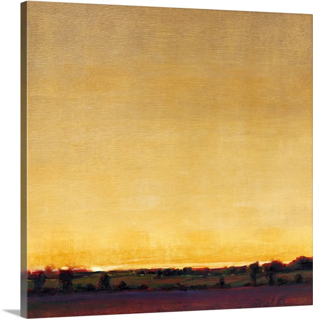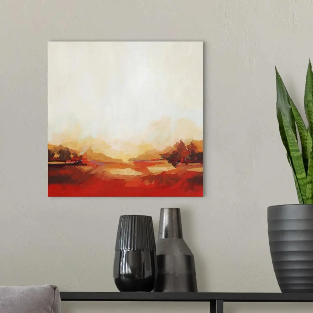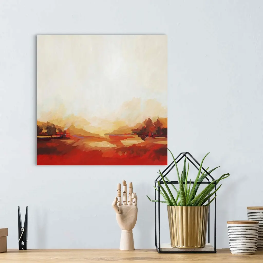 A contemporary abstract painting of a red landscape under a light cream sky.