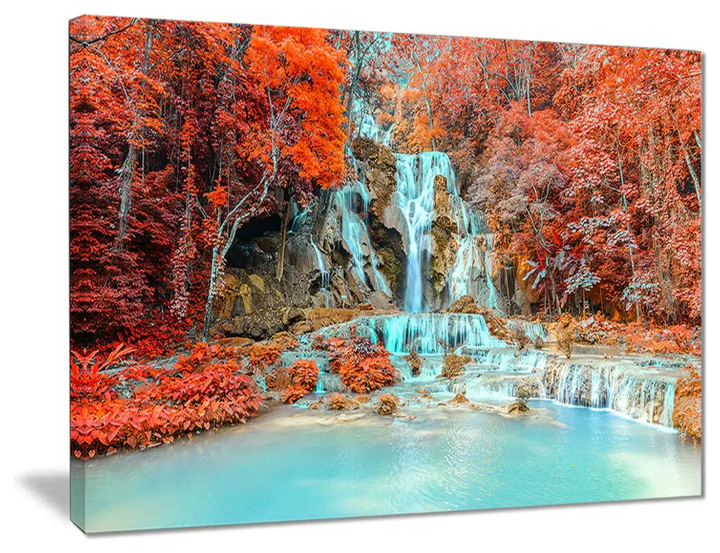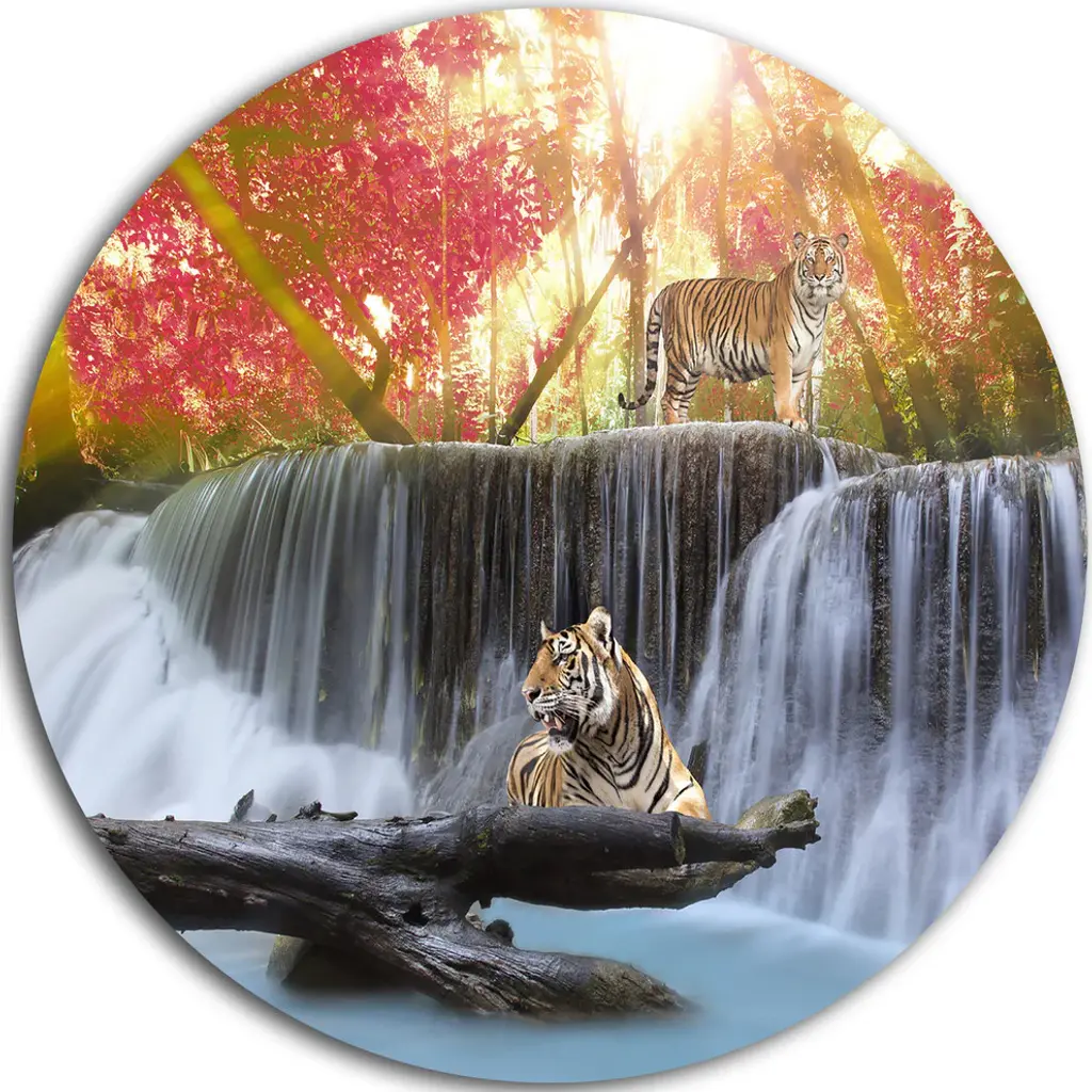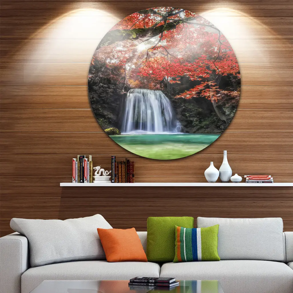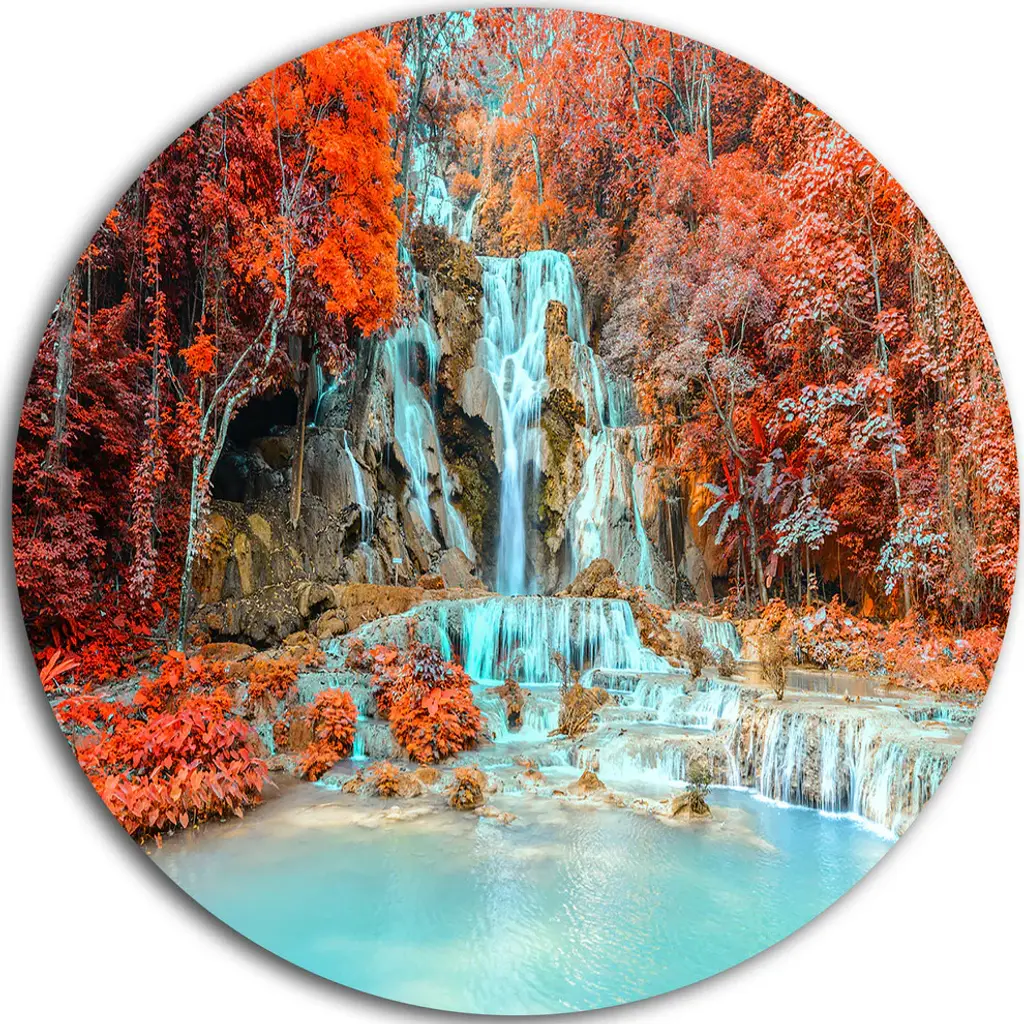 Bring Contemporary Abstraction to your home with this large Circle Metal wall art. This Erawan Waterfall Metal Artwork makes it the focal point of any room or office. - White Gloss Coating ensures colors are extra vibrant with light reflection.- Aluminum grade Sheet Metal with 1 inch mounting frame on the back giving the illusion that the artwork is floating on the wall..- Mounting Brackets are included along with instructions.- High Quality Digital images are created directly into a glossy aluminum panel producing a stunning and captivating print into the glossy finish of the metal.- Water, Fire and Scratch resistant HD Aluminum panels.- Looks better than any photo paper and guaranteed to last at least 20 years- Easy to clean with a microfiber cloth. Colors are far superior to regular Canvas Art. - Easy to Hang