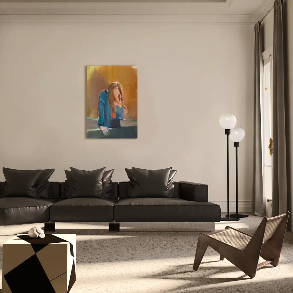 Painter Milena Sgambato explores concepts of identity and personality, of solitude and isolation in this magnificent painting, a unique oeuvre to include in a personal collection. Conveying deep and intense emotions, the woman is portrayed cradling her head in her hand in an act of despair and greif. Please consult the Concierge for further information. This is a unique piece of art. Delivered with a certificate of authenticity. Frame not included.