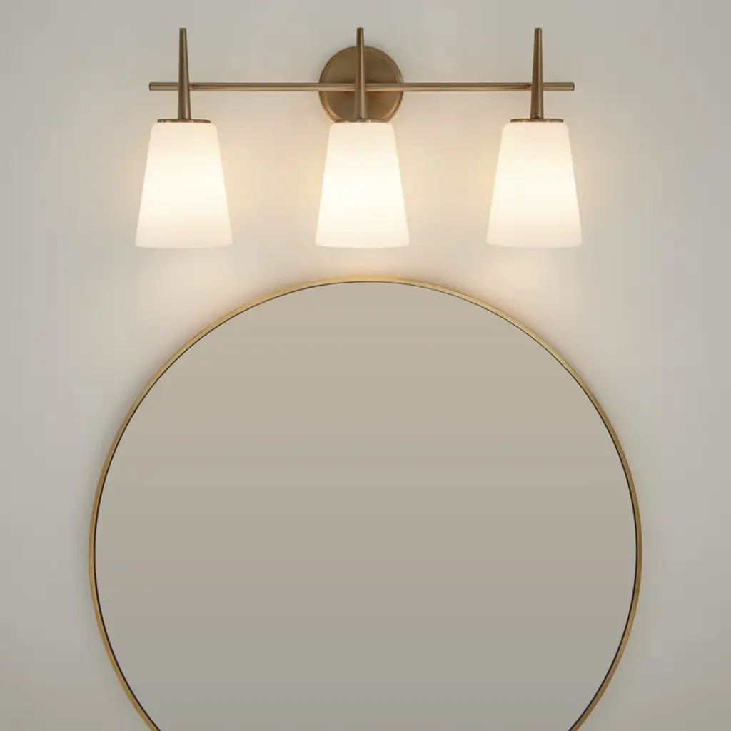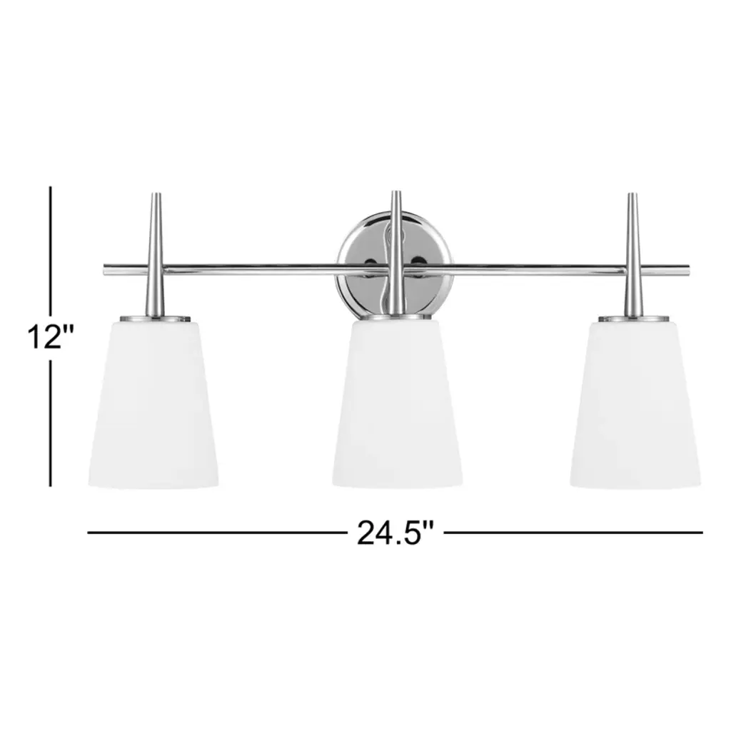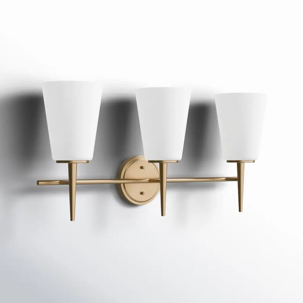 Illuminate your powder room or ensuite vanity in an updated traditional style with this 3-light vanity fixture. Crafted from steel in a lustrous metallic finish, this fixture features a raised circular backplate, while one tubular horizontal arm holds three streamlined torch glass holders in place. Rounding out the design, the frosted glass shades diffuse the light throughout your space. This unit can be mounted uplight or downlight according to your preference. Plus, it's safe for use in damp locations like bathrooms, and it's compatible with a dimmer switch.