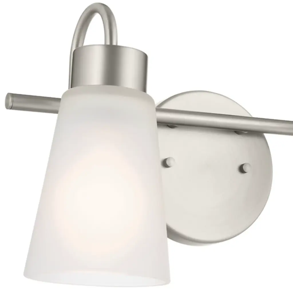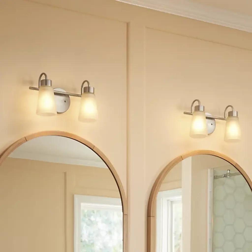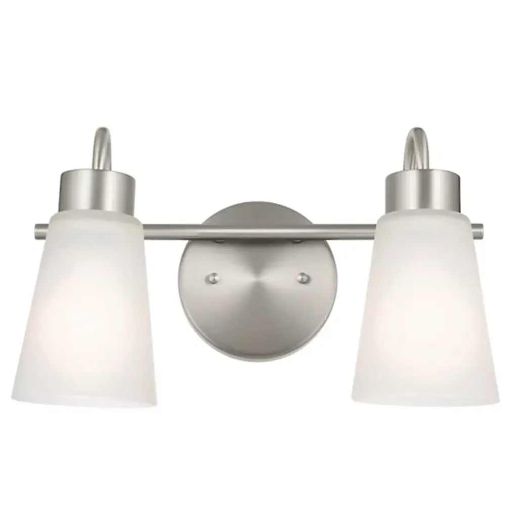 The Erma Vanity Light from Kichler delivers balanced illumination through thoughtful engineering. Two clear satin-etched glass shades mounted on a steel bar create even light distribution across vanity spaces. The traditional design elements integrate naturally into bathroom settings while maintaining modern performance standards. Each shade directs light downward and outward, providing optimal lighting for grooming tasks. The fixture’s damp location rating ensures reliable performance in bathroom environments.