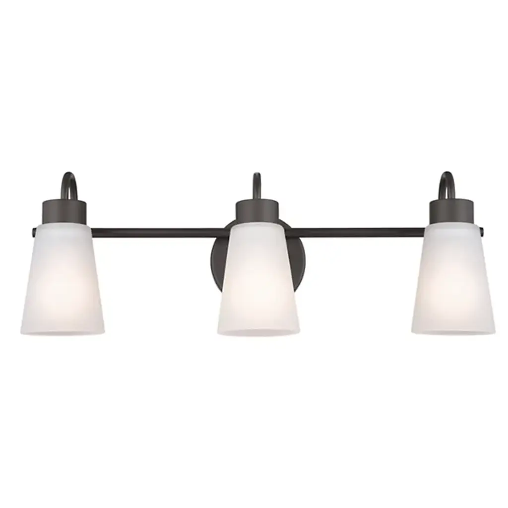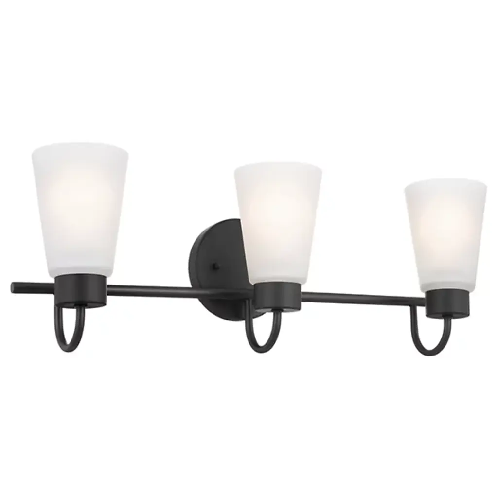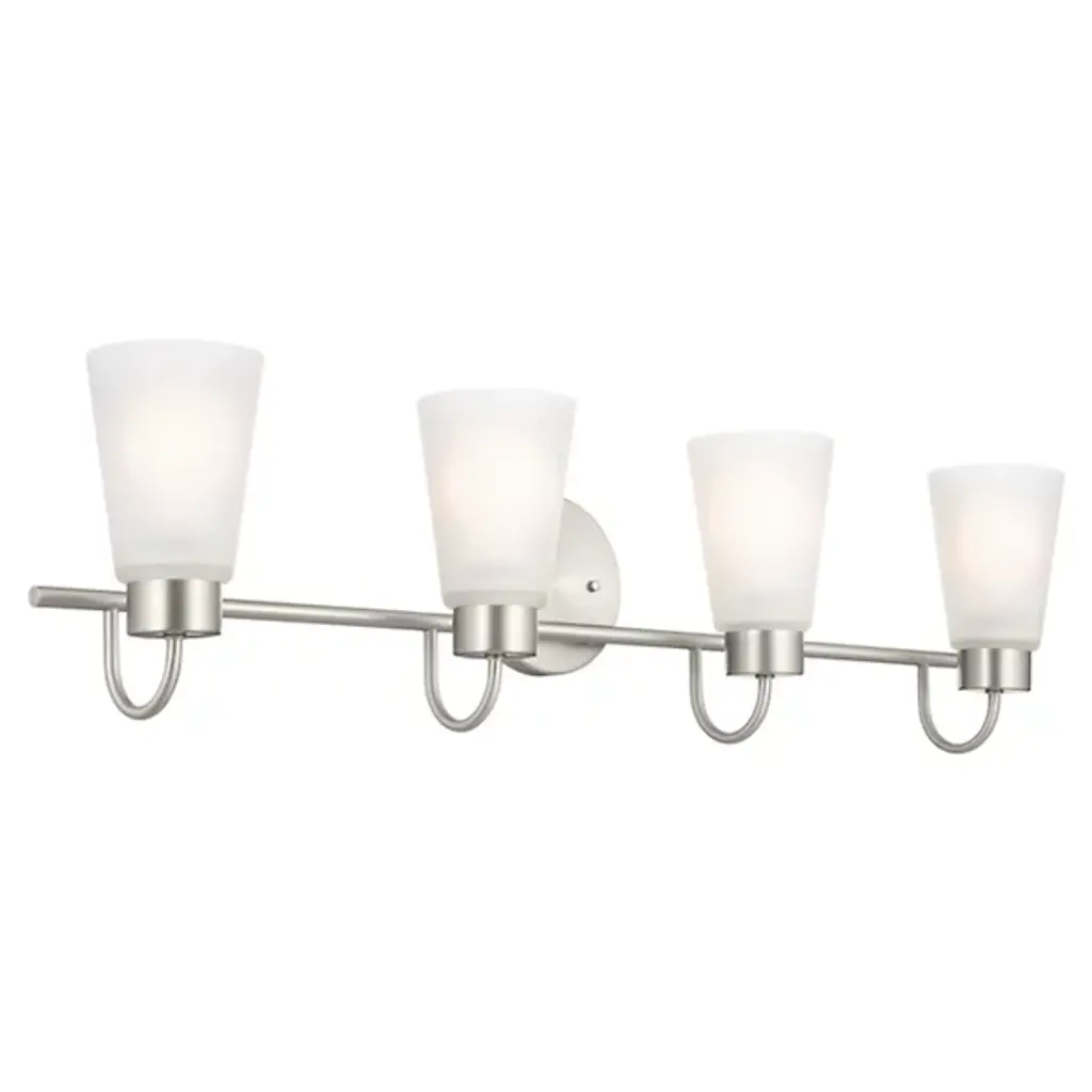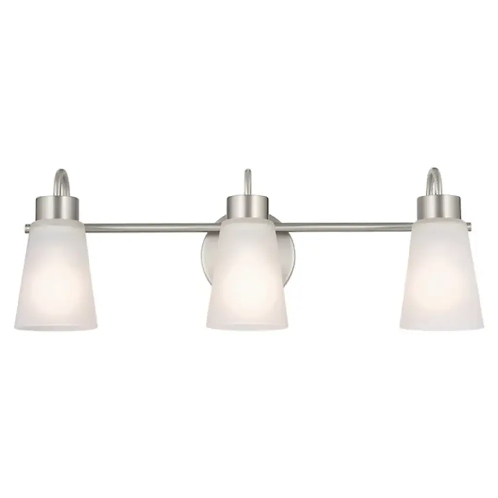 The Erma Vanity Light from Kichler delivers balanced illumination through thoughtful engineering. Two clear satin-etched glass shades mounted on a steel bar create even light distribution across vanity spaces. The traditional design elements integrate naturally into bathroom settings while maintaining modern performance standards. Each shade directs light downward and outward, providing optimal lighting for grooming tasks. The fixture’s damp location rating ensures reliable performance in bathroom environments.