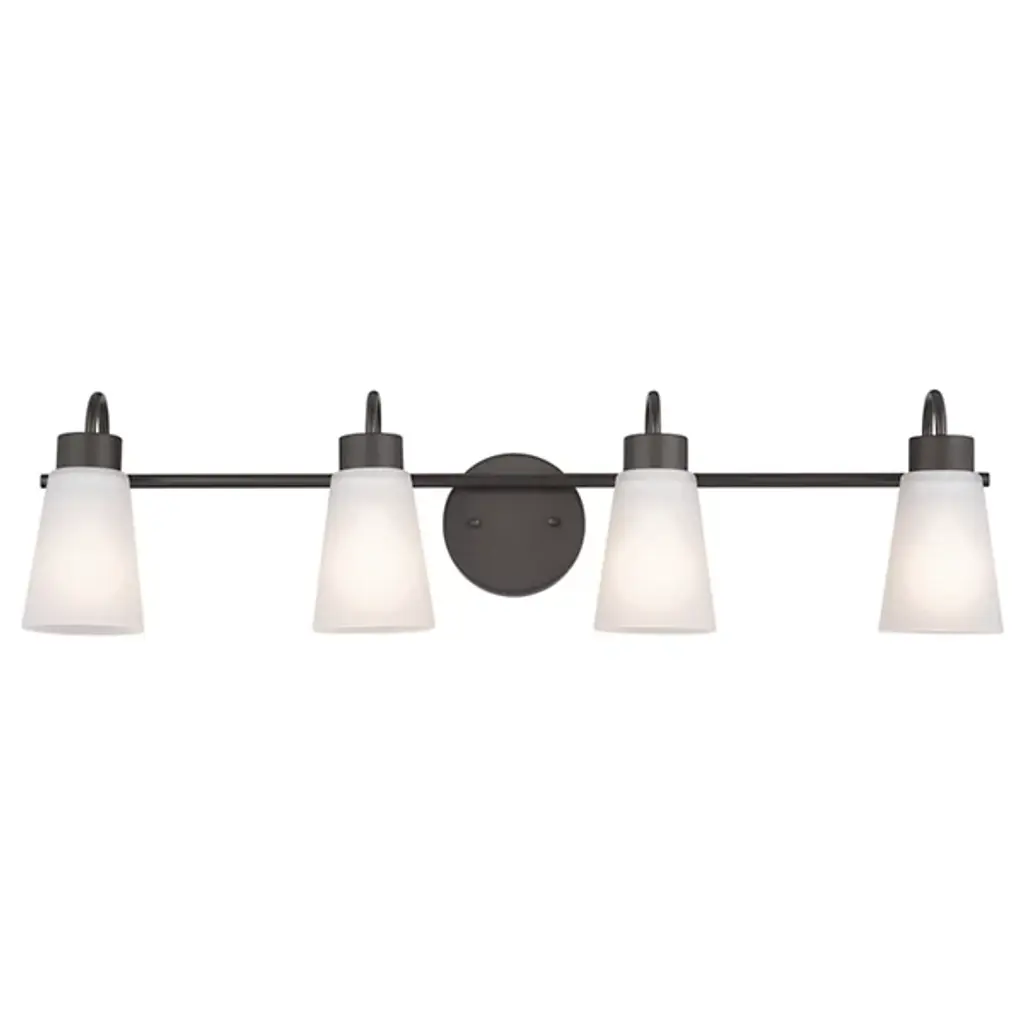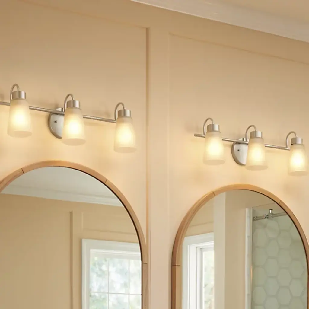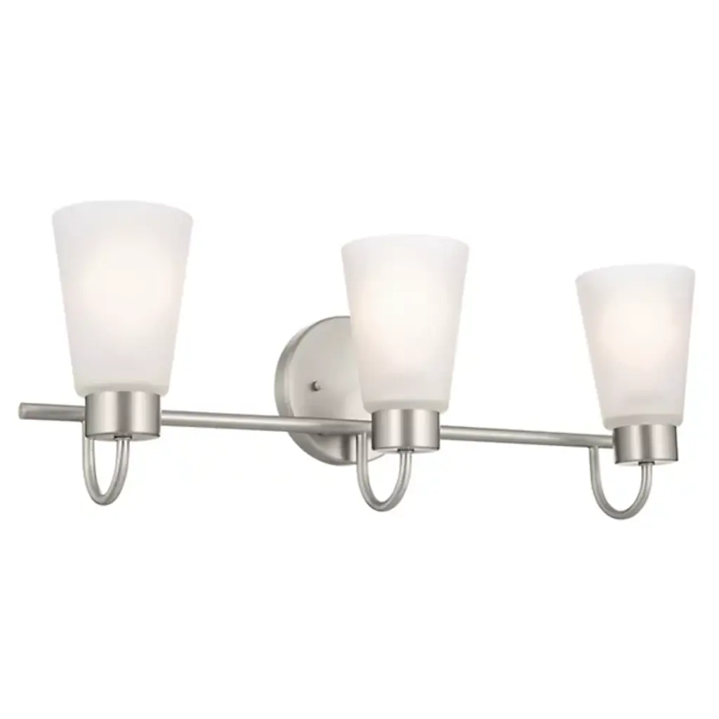 The Erma Vanity Light from Kichler delivers balanced illumination through thoughtful engineering. Two clear satin-etched glass shades mounted on a steel bar create even light distribution across vanity spaces. The traditional design elements integrate naturally into bathroom settings while maintaining modern performance standards. Each shade directs light downward and outward, providing optimal lighting for grooming tasks. The fixture’s damp location rating ensures reliable performance in bathroom environments.